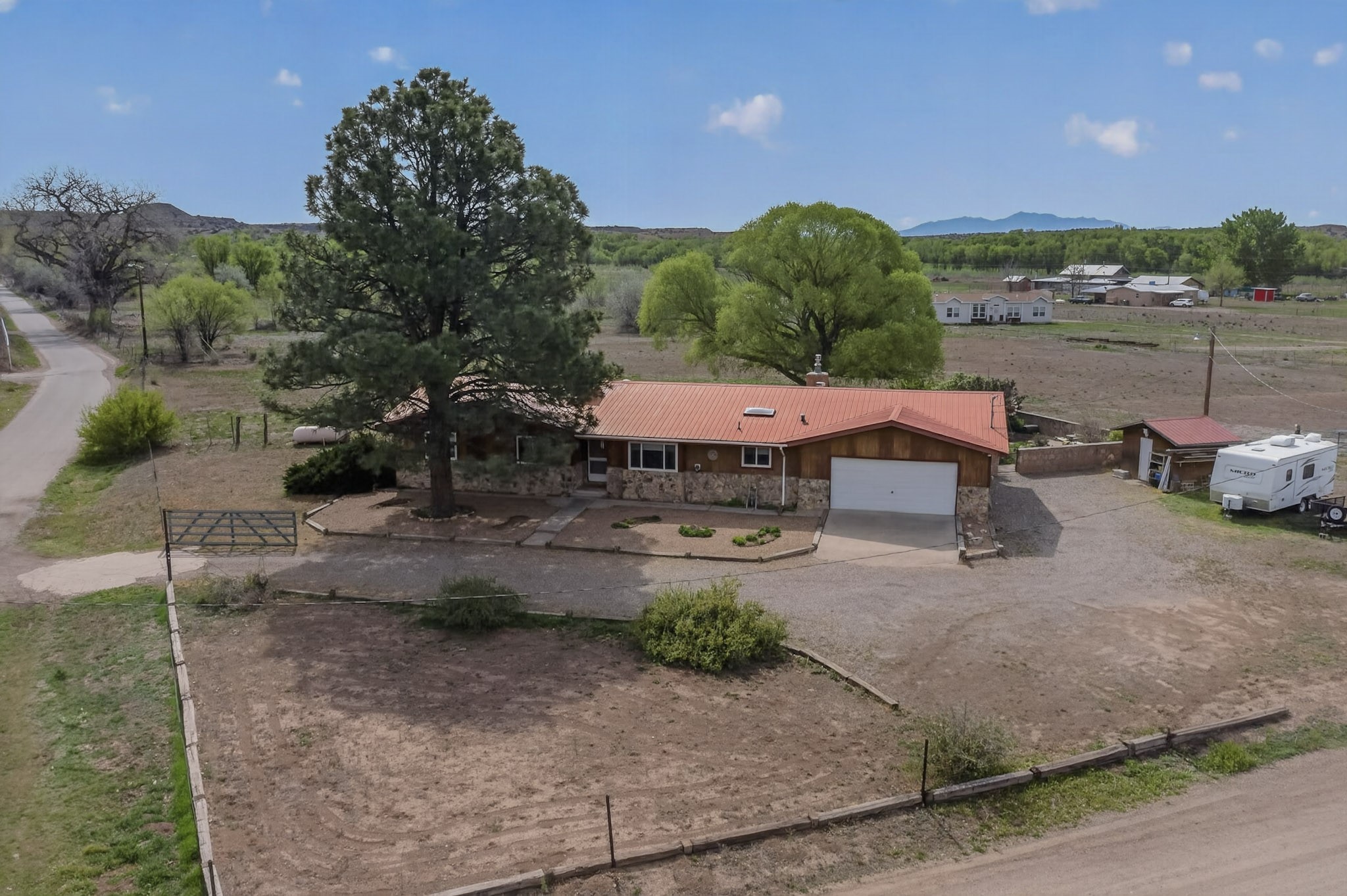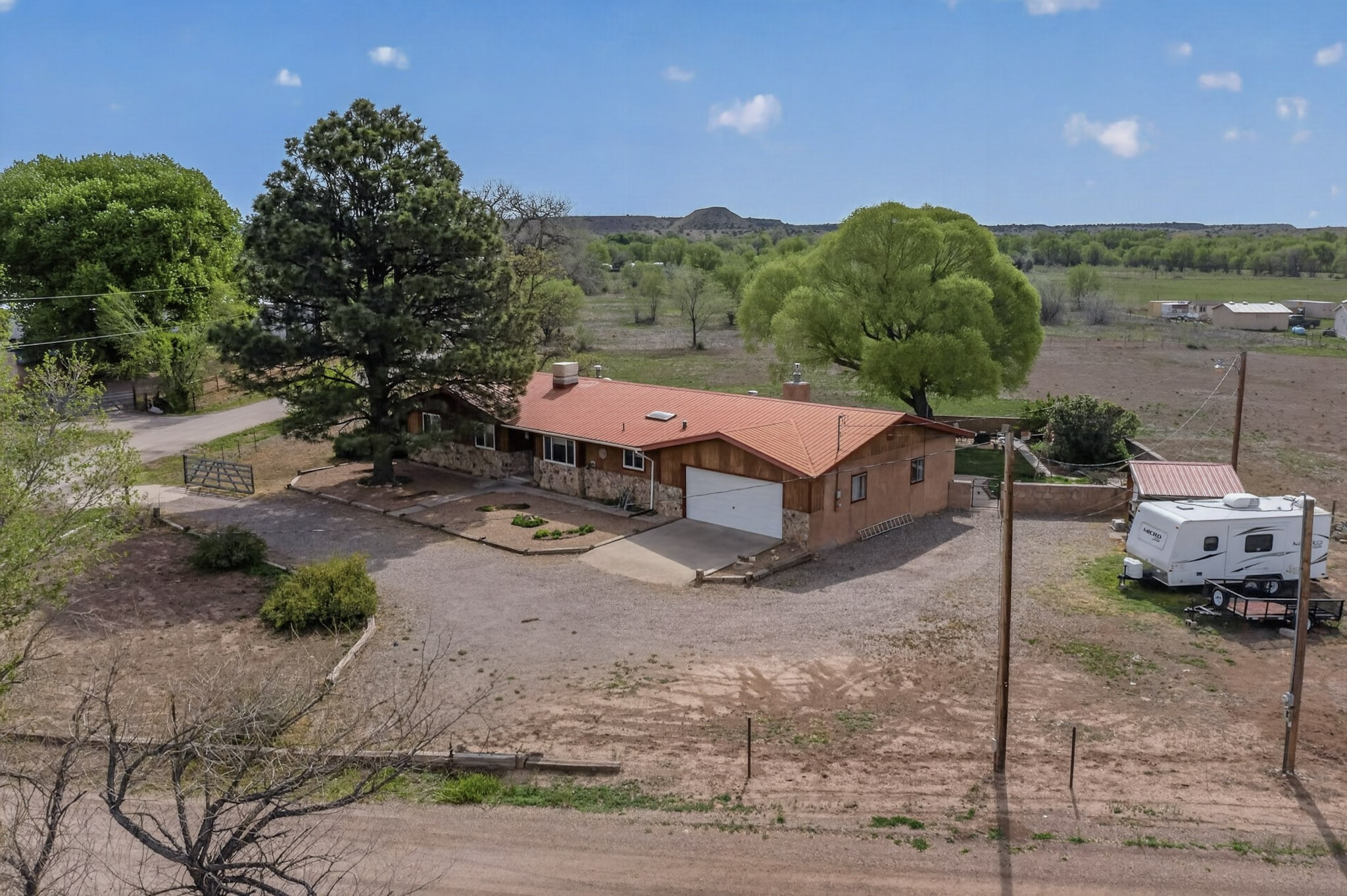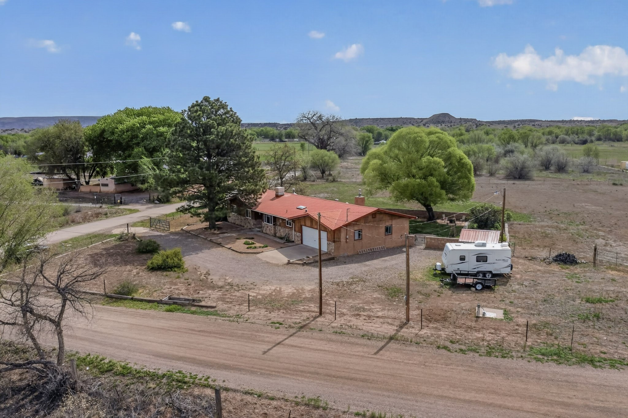 Don't miss this incredible opportunity to own a spacious move in ready home, featuring pre-1907 water rights, conveyed with the property! (.96 acre w/2.868 diversion) Situated on 2 parcels for a total of 2.3 acres, this charming residence offers updated gorgeous wood laminate flooring in the main living areas and beautifully updated baths. The resurfaced kitchen cabinets add a fresh touch, while the fully landscaped back courtyard provides an inviting space to relax or entertain. Enjoy large bedrooms and a generous backyard patio with durable epoxy coating, perfect for outdoor gatherings. The oversized 2-car garage offers ample storage. Beautiful views, and walking distance to the Bosque! This property blends comfort, functionality, and timeless value - Just 15 quick minutes to the interstate! Great location if working in Santa Fe OR ABQ!