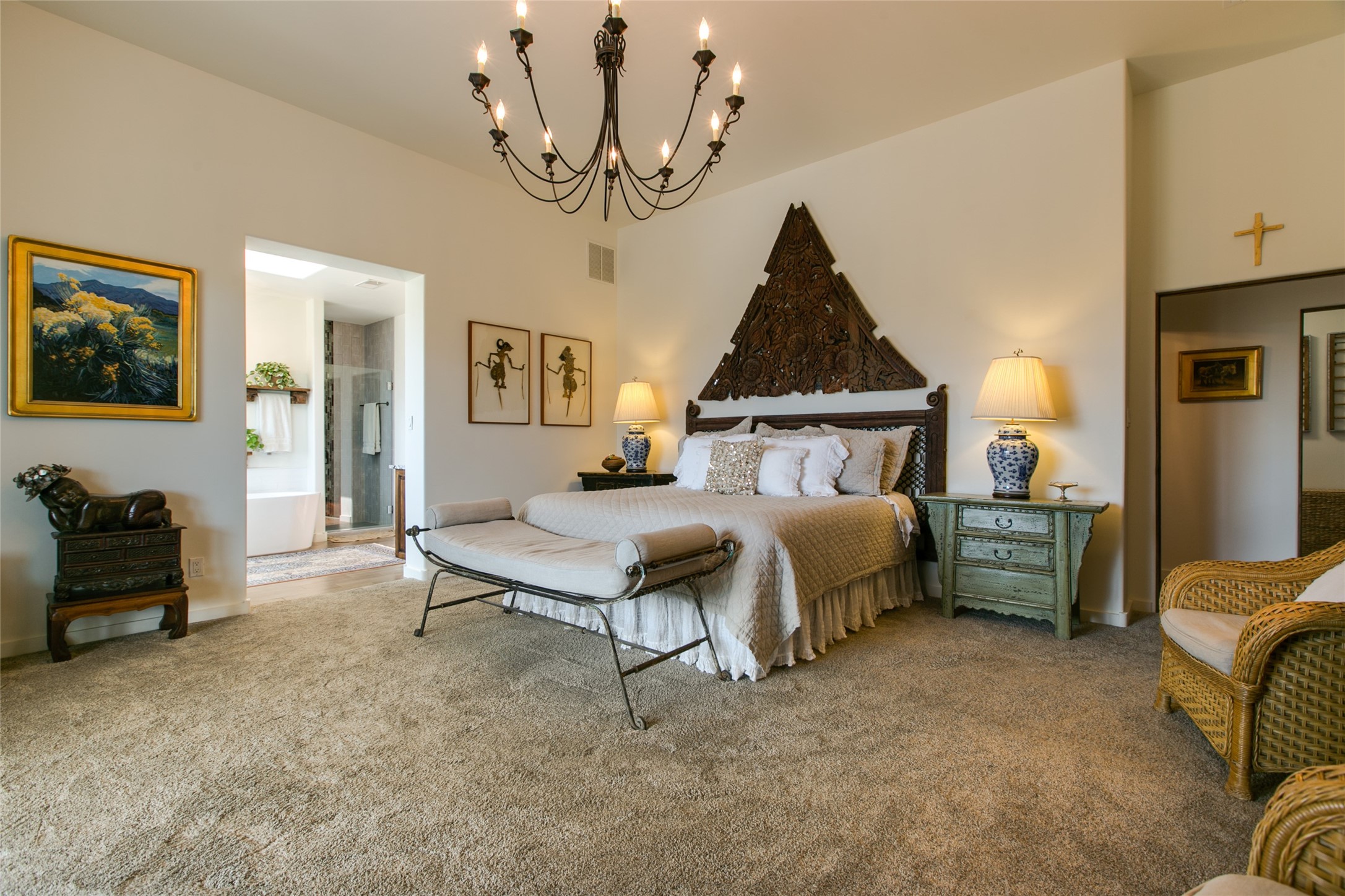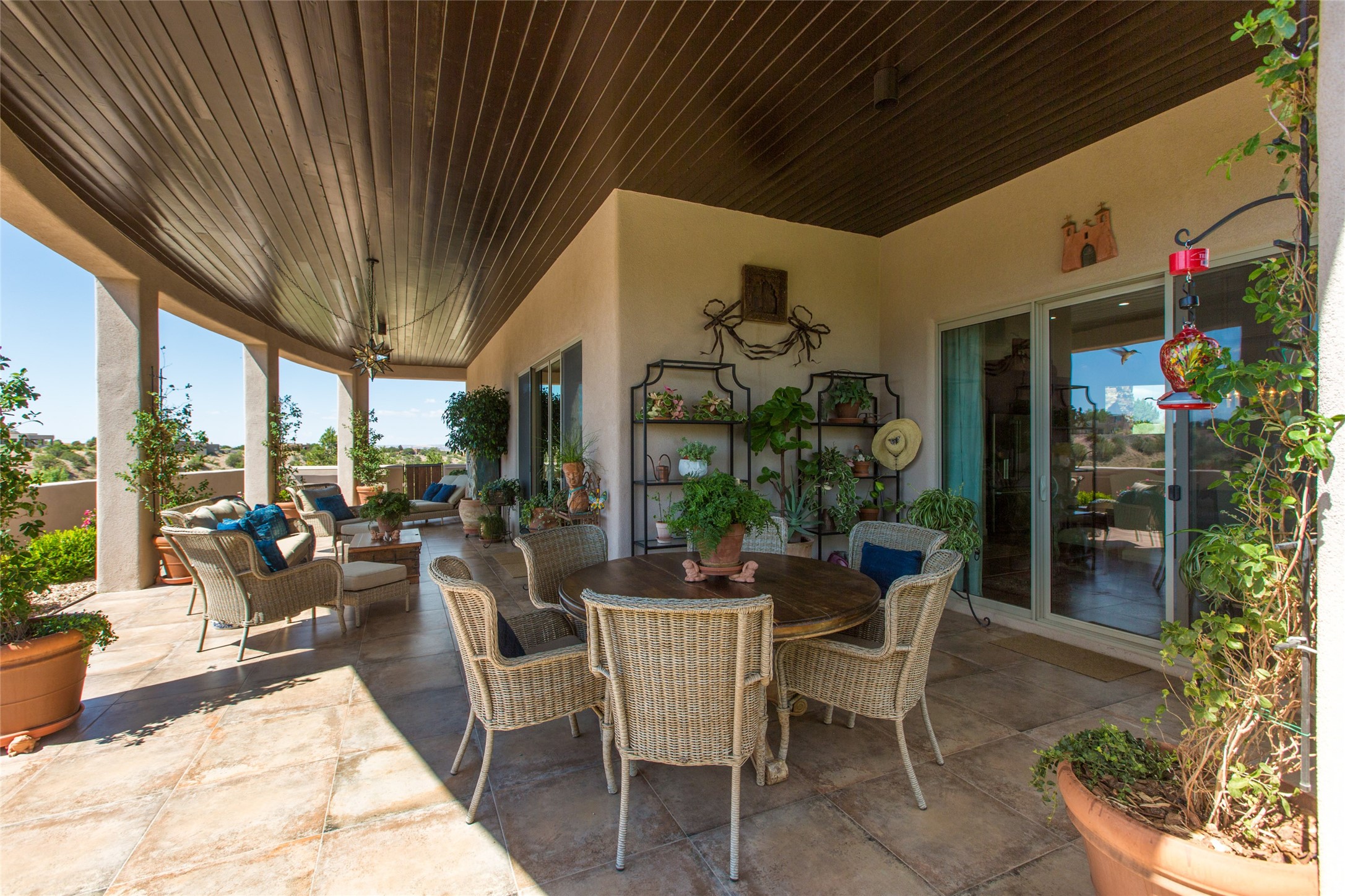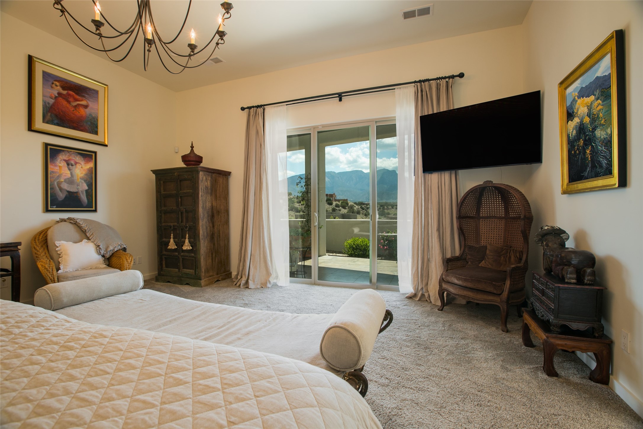 One-level Placitas home built in 2020, perfect for downsizing without sacrificing quality. The bright kitchen features high-end appliances, double ovens, a copper sink, a large pantry, and marble backsplashes. The great room and dining room overlook the Sandia Mountains and open onto an east-facing wraparound patio ideal for outdoor enjoyment. The large primary suite also has mountain views and a door to the covered patio; its spa-like bath includes double sinks, a luxurious tub, and a walk-in shower. Two additional bedrooms on the opposite side of the house share a full bath. Gorgeous outdoor spaces, easy-care landscaping, and an immaculate three-car finished garage with epoxy floors and storage complete this perfect Placitas perch.