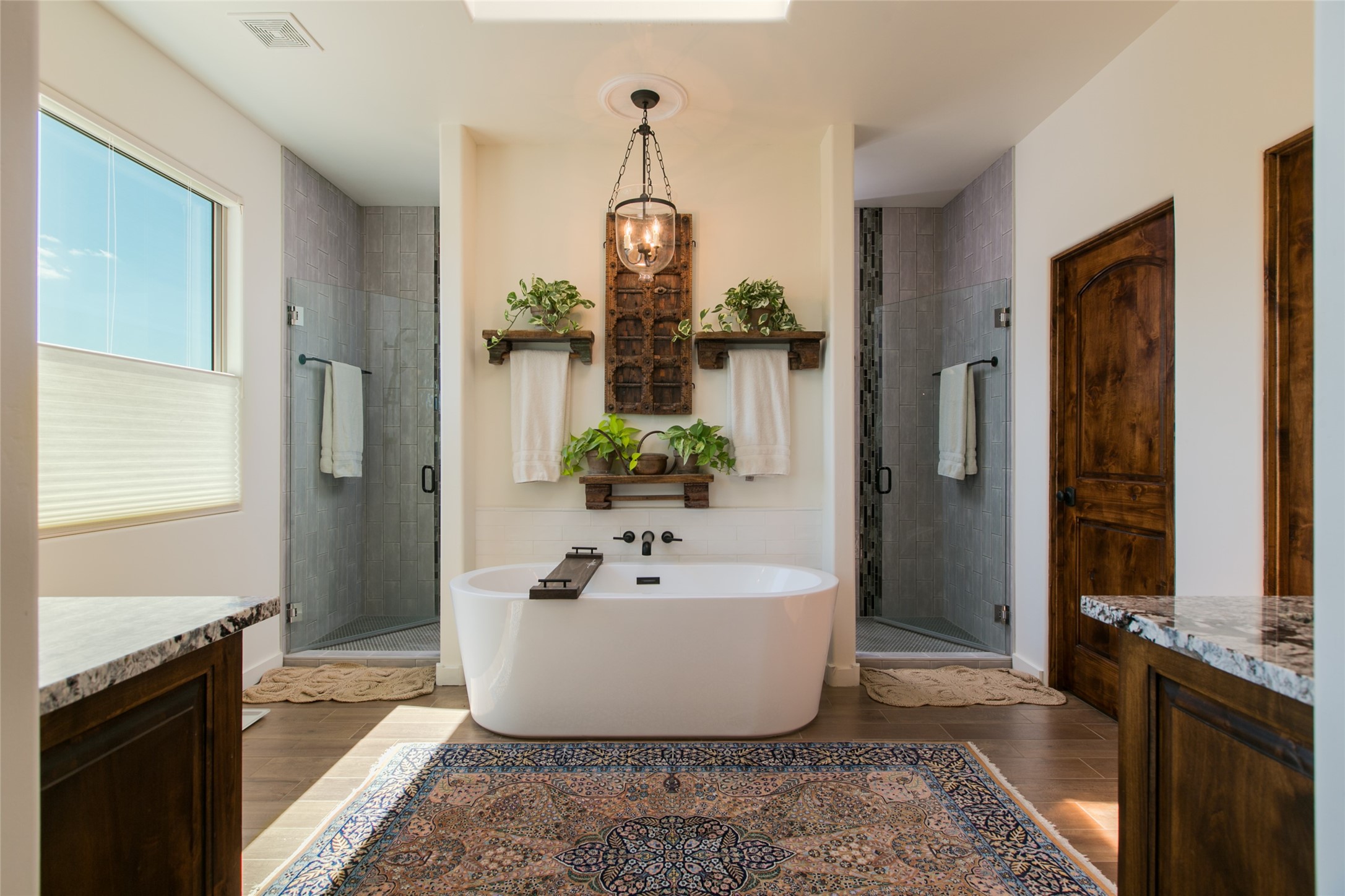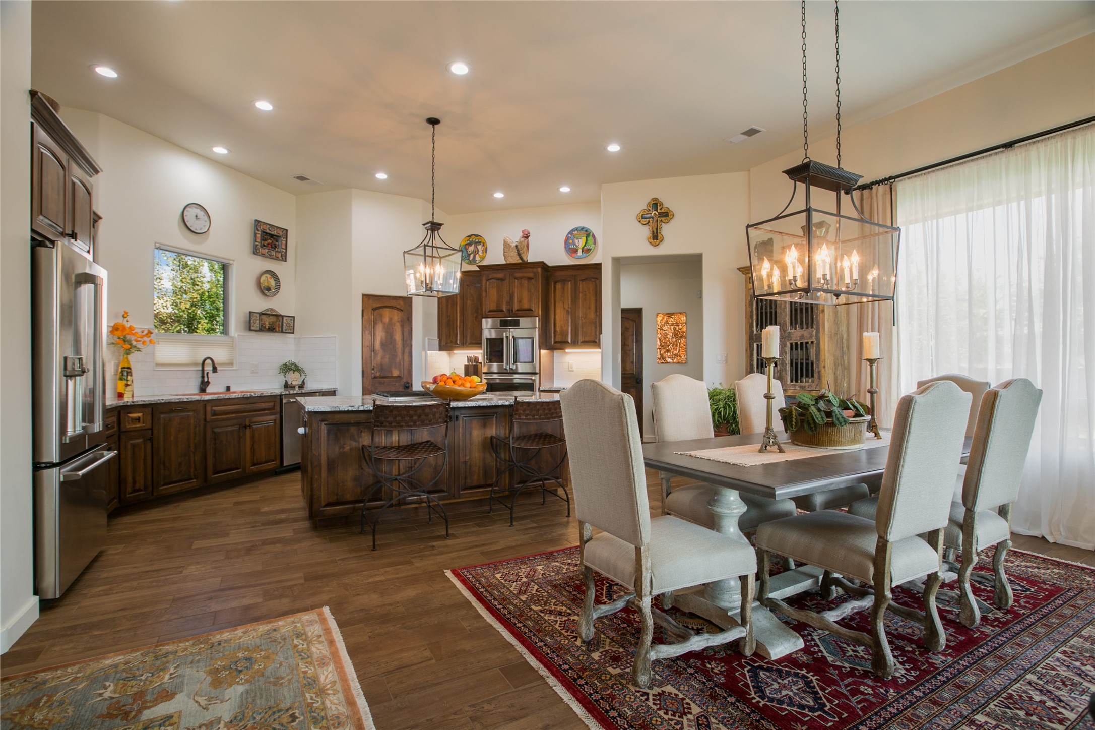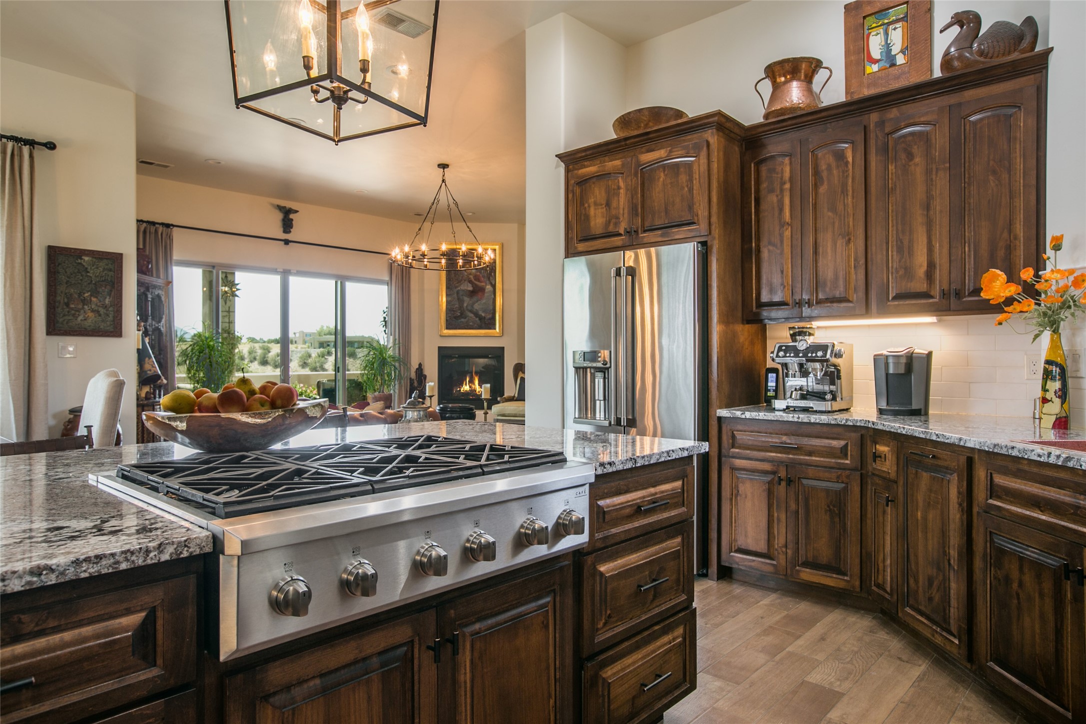One-level Placitas home built in 2020, perfect for downsizing without sacrificing quality. The bright kitchen features high-end appliances, double ovens, a copper sink, a large pantry, and marble backsplashes. The great room and dining room overlook the Sandia Mountains and open onto an east-facing wraparound patio ideal for outdoor enjoyment. The large primary suite also has mountain views and a door to the covered patio; its spa-like bath includes double sinks, a luxurious tub, and a walk-in shower. Two additional bedrooms on the opposite side of the house share a full bath. Gorgeous outdoor spaces, easy-care landscaping, and an immaculate three-car finished garage with epoxy floors and storage complete this perfect Placitas perch.