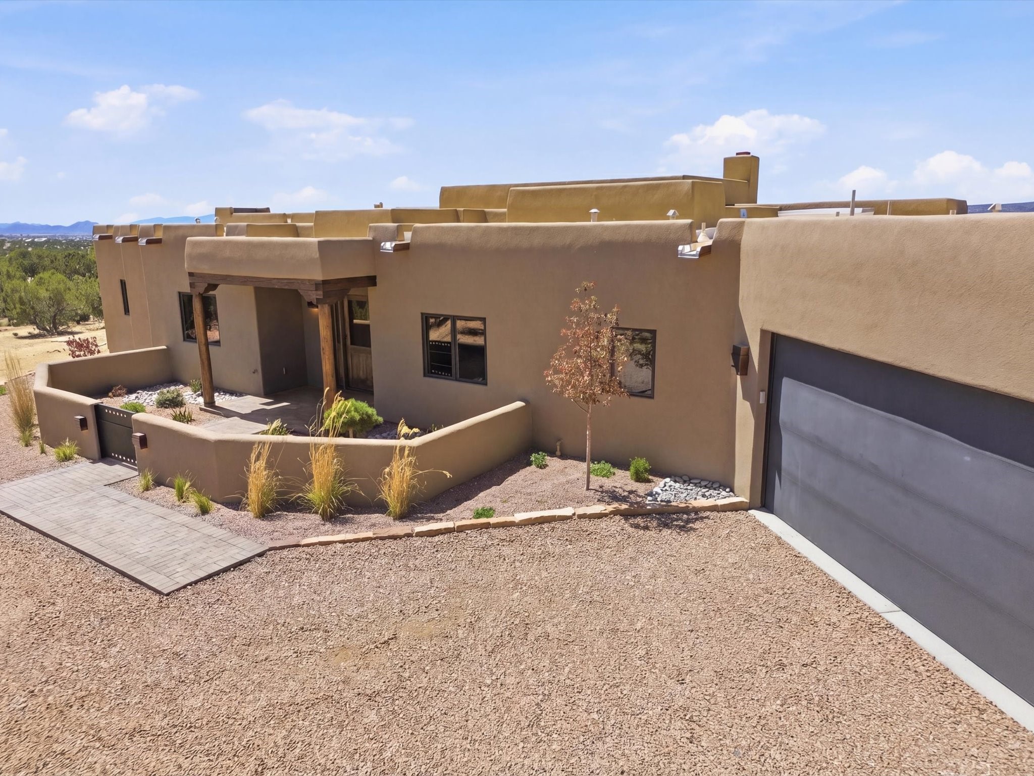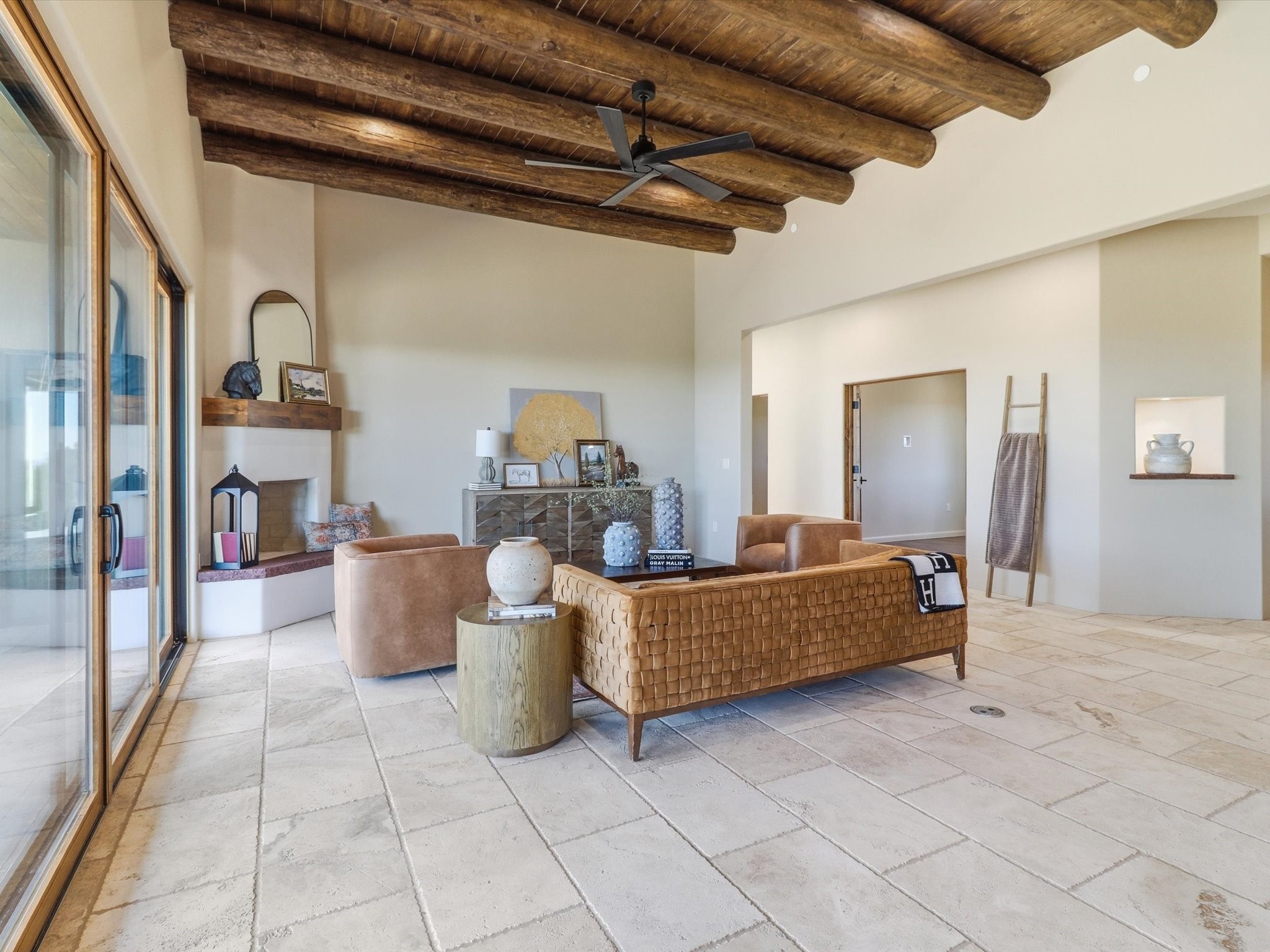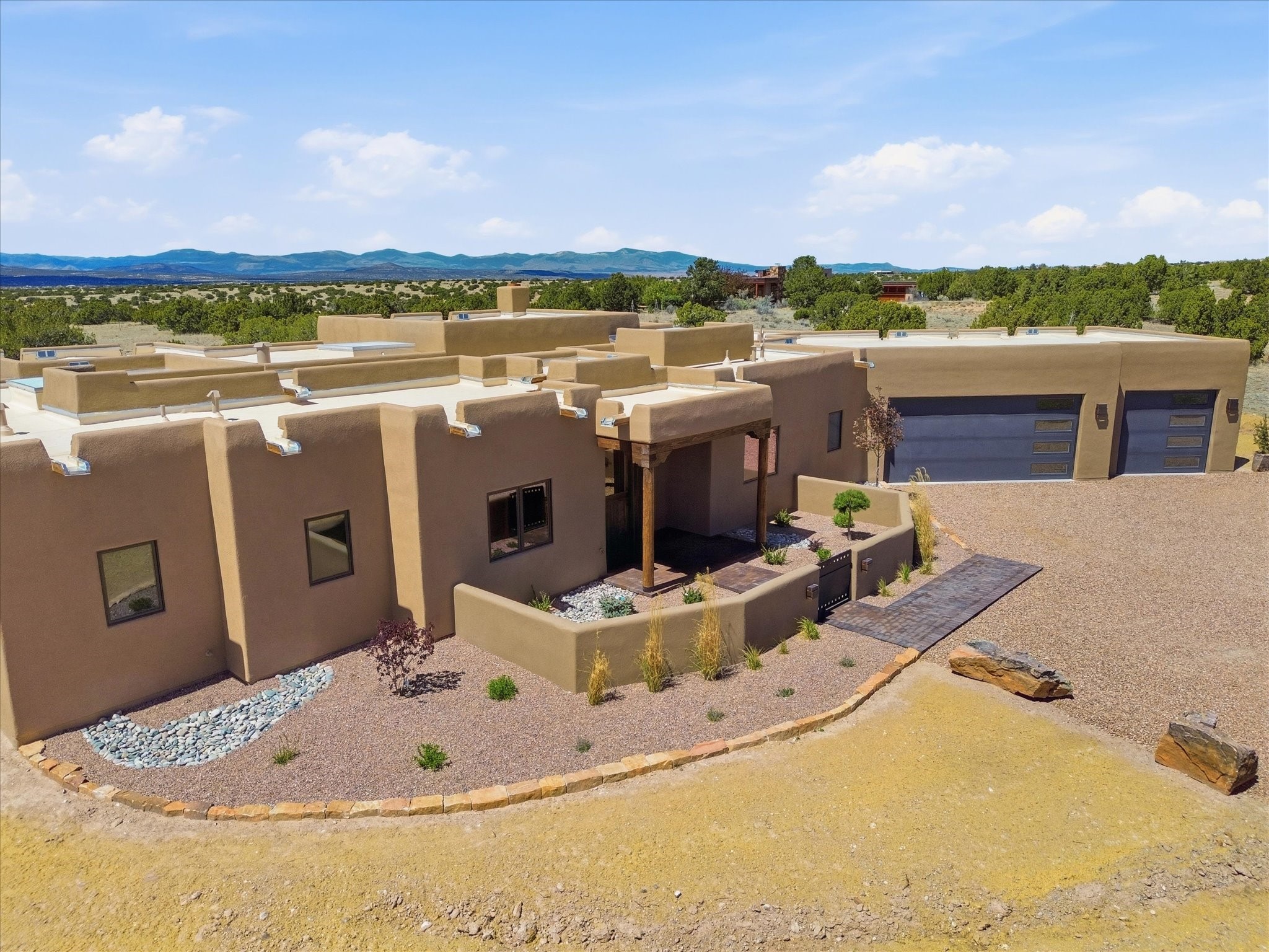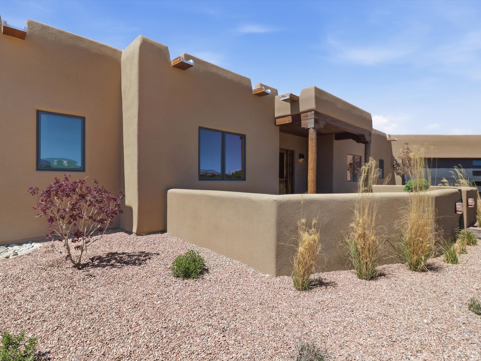 33 Tierra Grande is set on 3.1 equestrian-friendly acres and this sophisticated single-level home offers a seamless layout framed by dramatic vigas, travertine throughout the main living area, and hickory chestnut floors in the three bedrooms and office. The home's centerpiece is a true gourmet kitchen thoughtfully designed featuring Thermador appliances, a built-in wine cooler, elegant quartz countertops, and custom knotty alder cabinetry. This chef's sanctuary flows effortlessly into a dedicated separate dining area, perfect for hosting intimate dinners against a backdrop of the natural landscape and mountain views. Retreat to the primary suite or two additional ensuite bedrooms, all kept comfortable by in-floor radiant heat and high-efficiency ducted mini-splits. Beyond the large brick covered portal and xeriscaped grounds, residents enjoy direct access to miles of private community riding and hiking trails, blending refined modern luxury with the ultimate Santa Fe outdoor lifestyle.