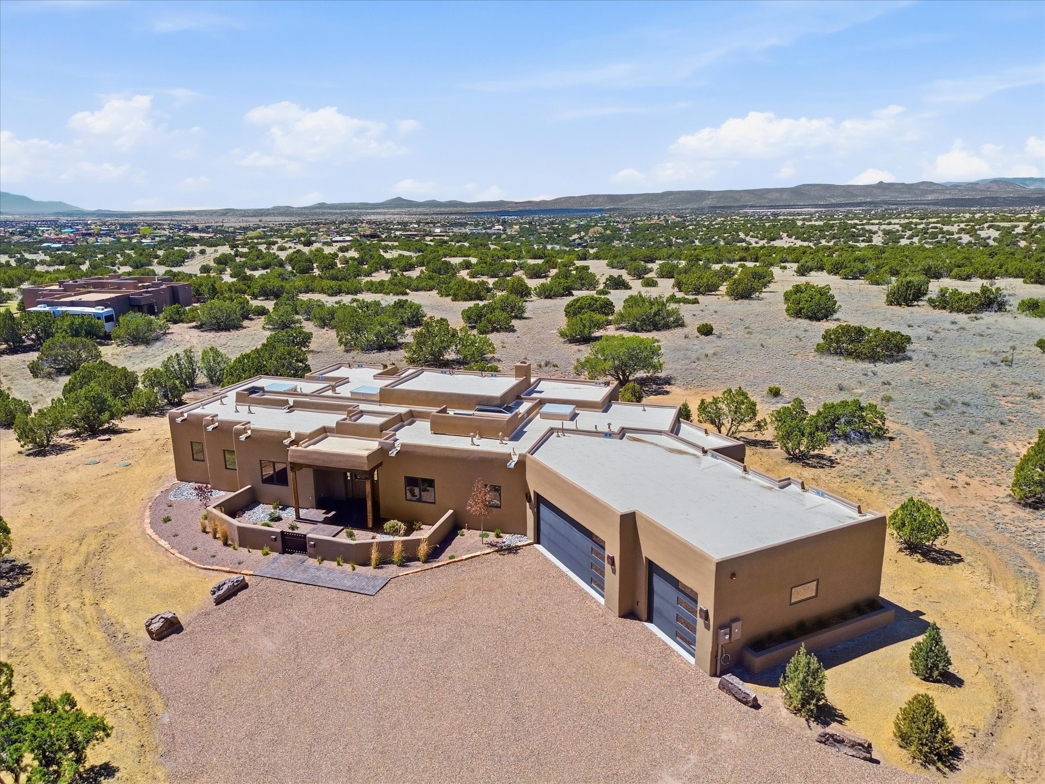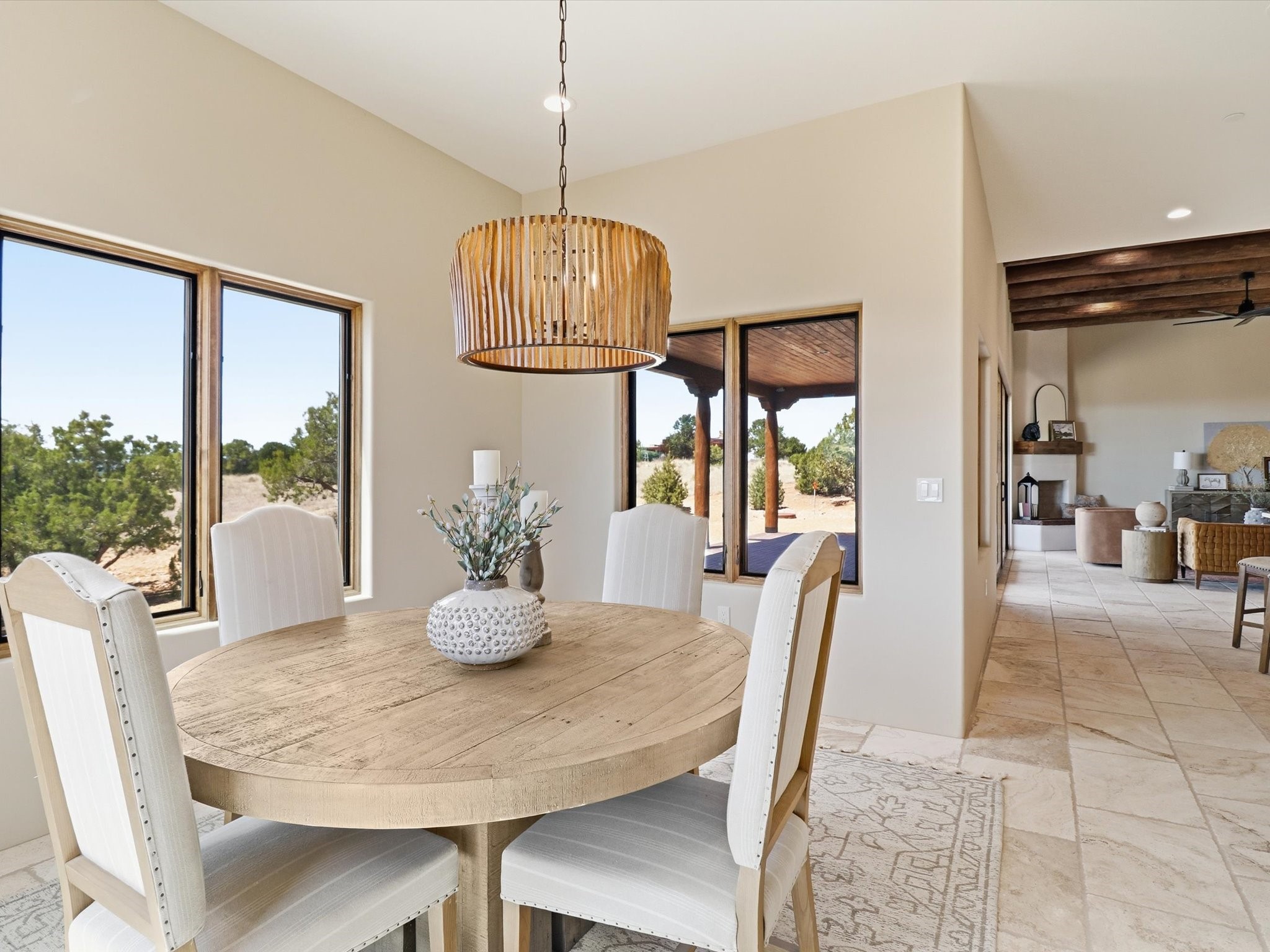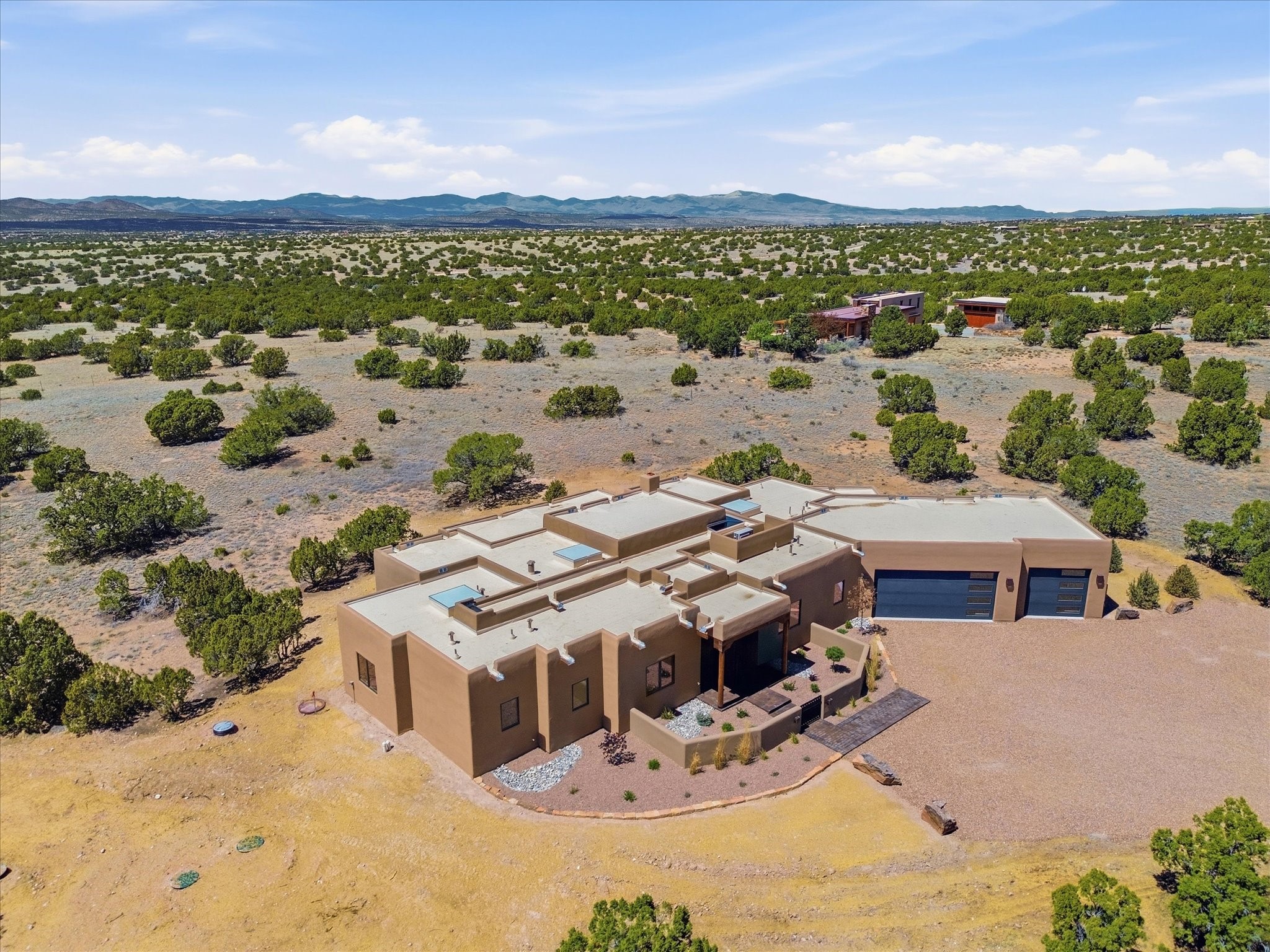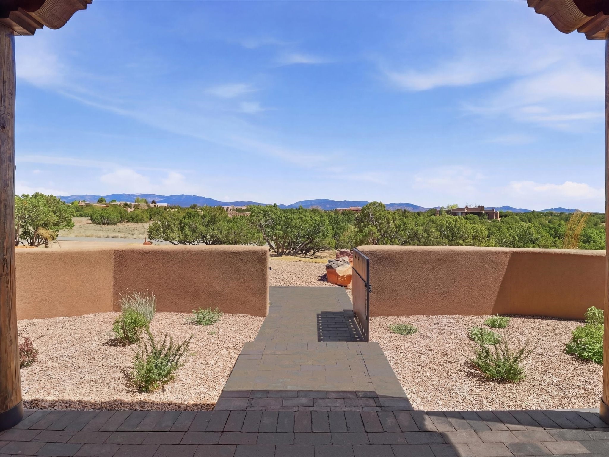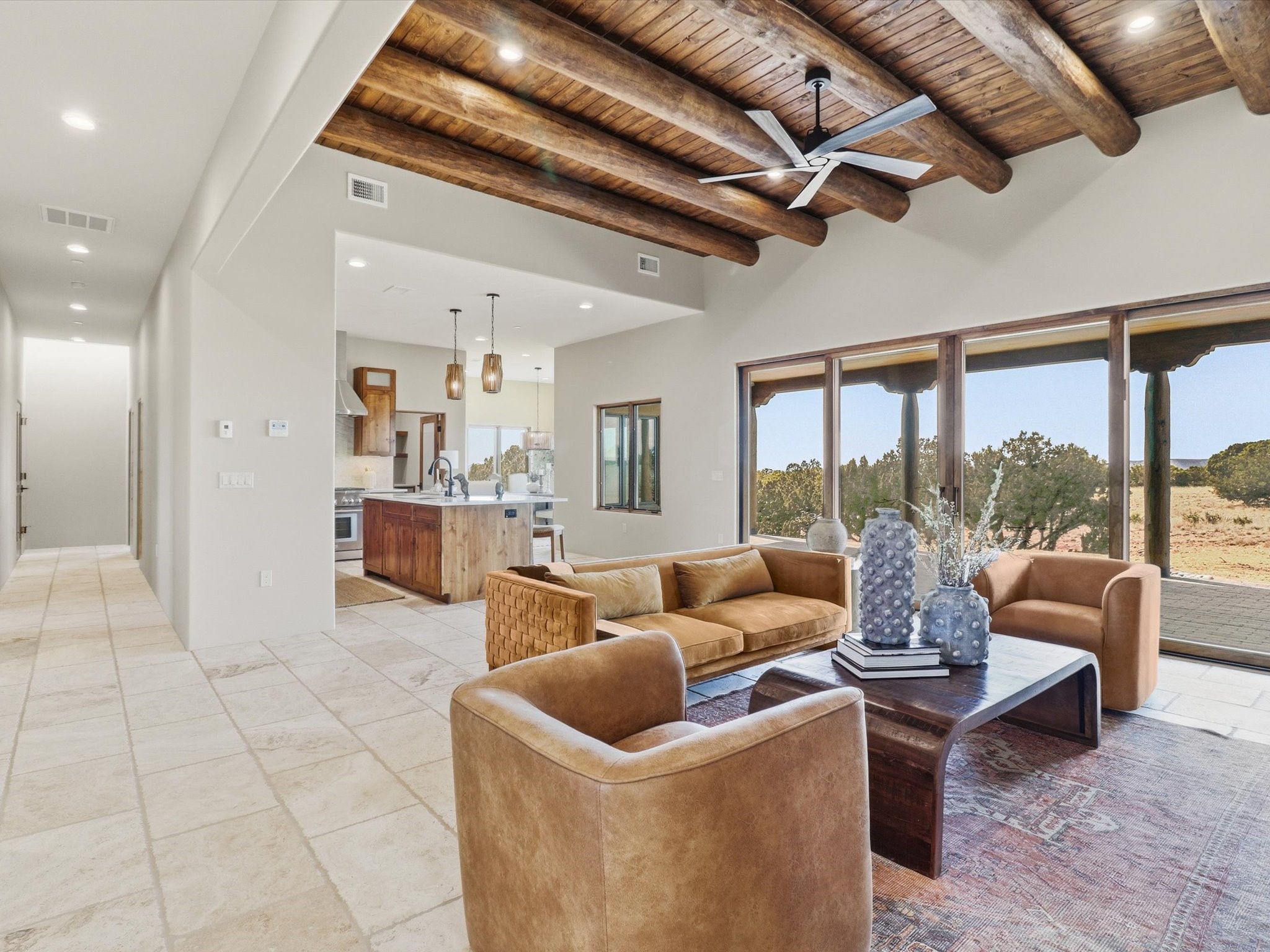 33 Tierra Grande is set on 3.1 equestrian-friendly acres and this sophisticated single-level home offers a seamless layout framed by dramatic vigas, travertine throughout the main living area, and hickory chestnut floors in the three bedrooms and office. The home's centerpiece is a true gourmet kitchen thoughtfully designed featuring Thermador appliances, a built-in wine cooler, elegant quartz countertops, and custom knotty alder cabinetry. This chef's sanctuary flows effortlessly into a dedicated separate dining area, perfect for hosting intimate dinners against a backdrop of the natural landscape and mountain views. Retreat to the primary suite or two additional ensuite bedrooms, all kept comfortable by in-floor radiant heat and high-efficiency ducted mini-splits. Beyond the large brick covered portal and xeriscaped grounds, residents enjoy direct access to miles of private community riding and hiking trails, blending refined modern luxury with the ultimate Santa Fe outdoor lifestyle.
