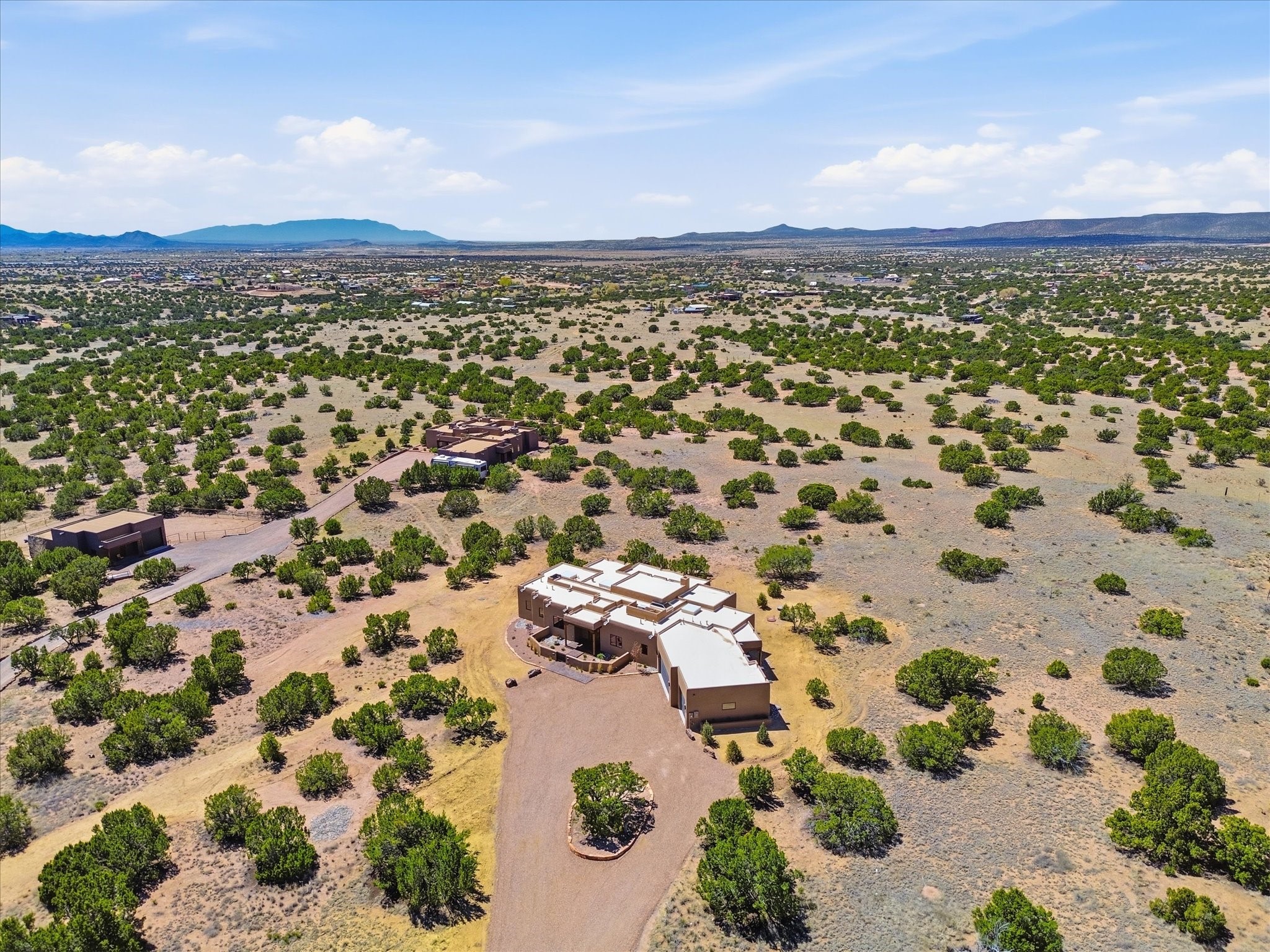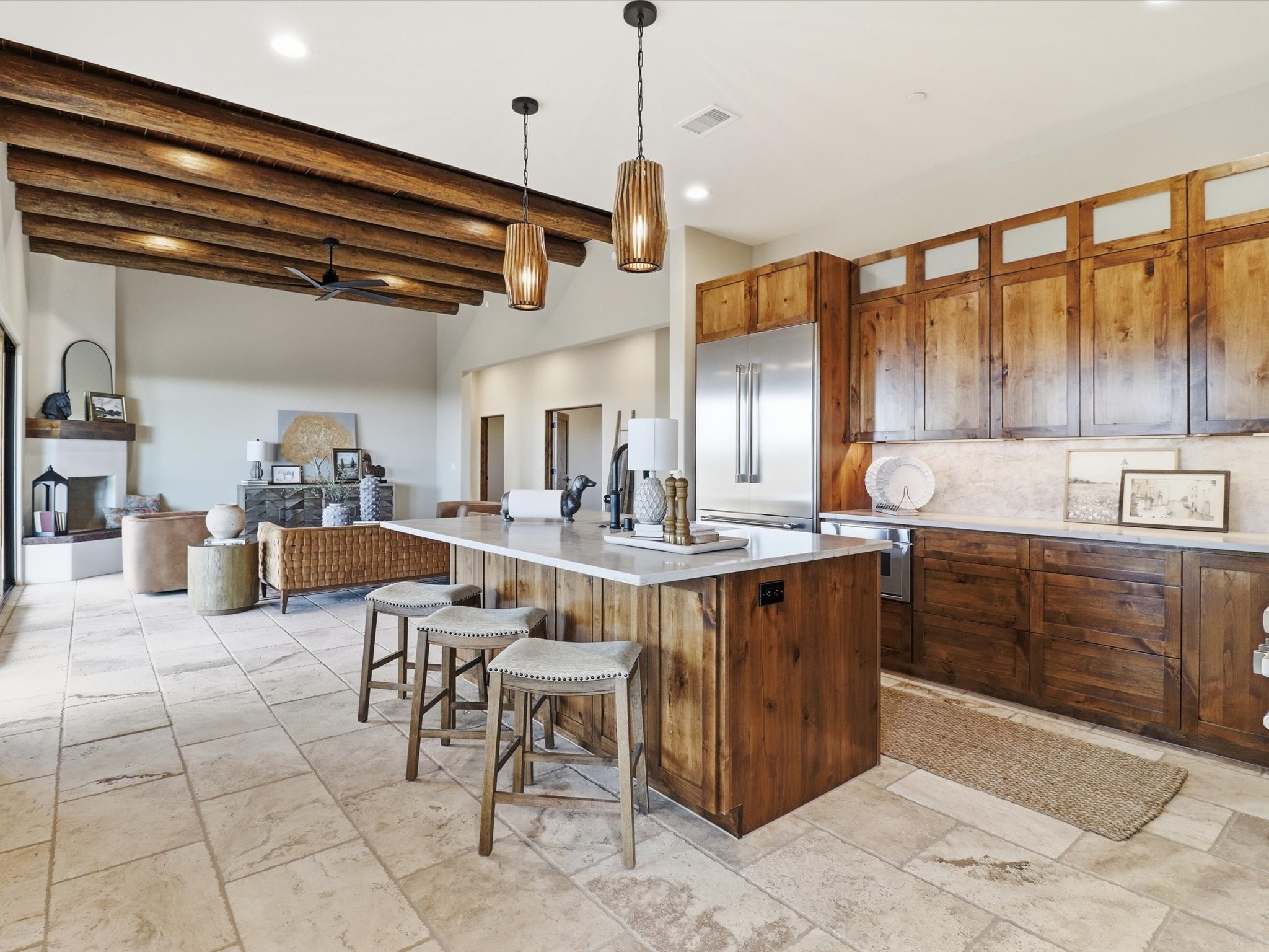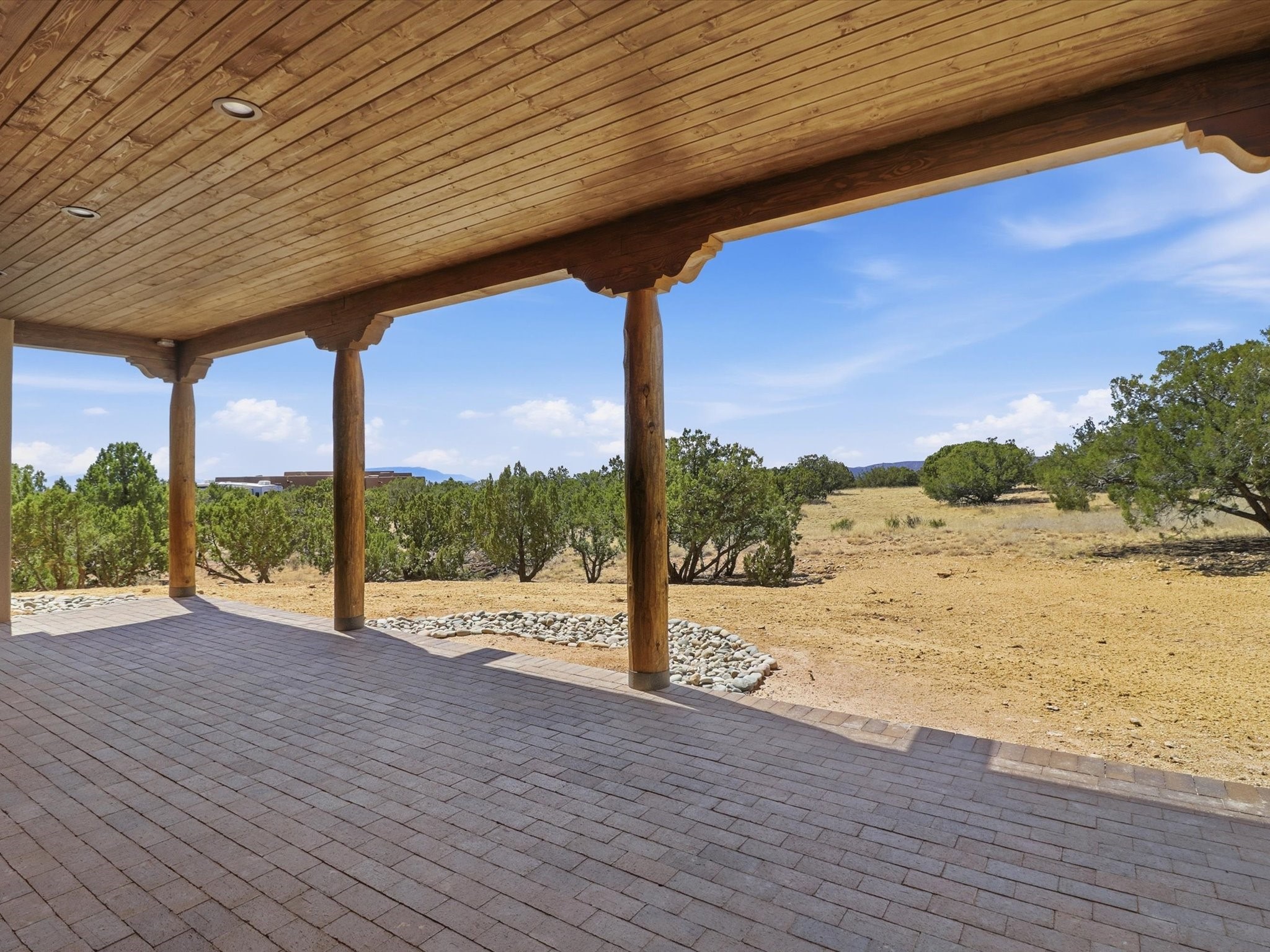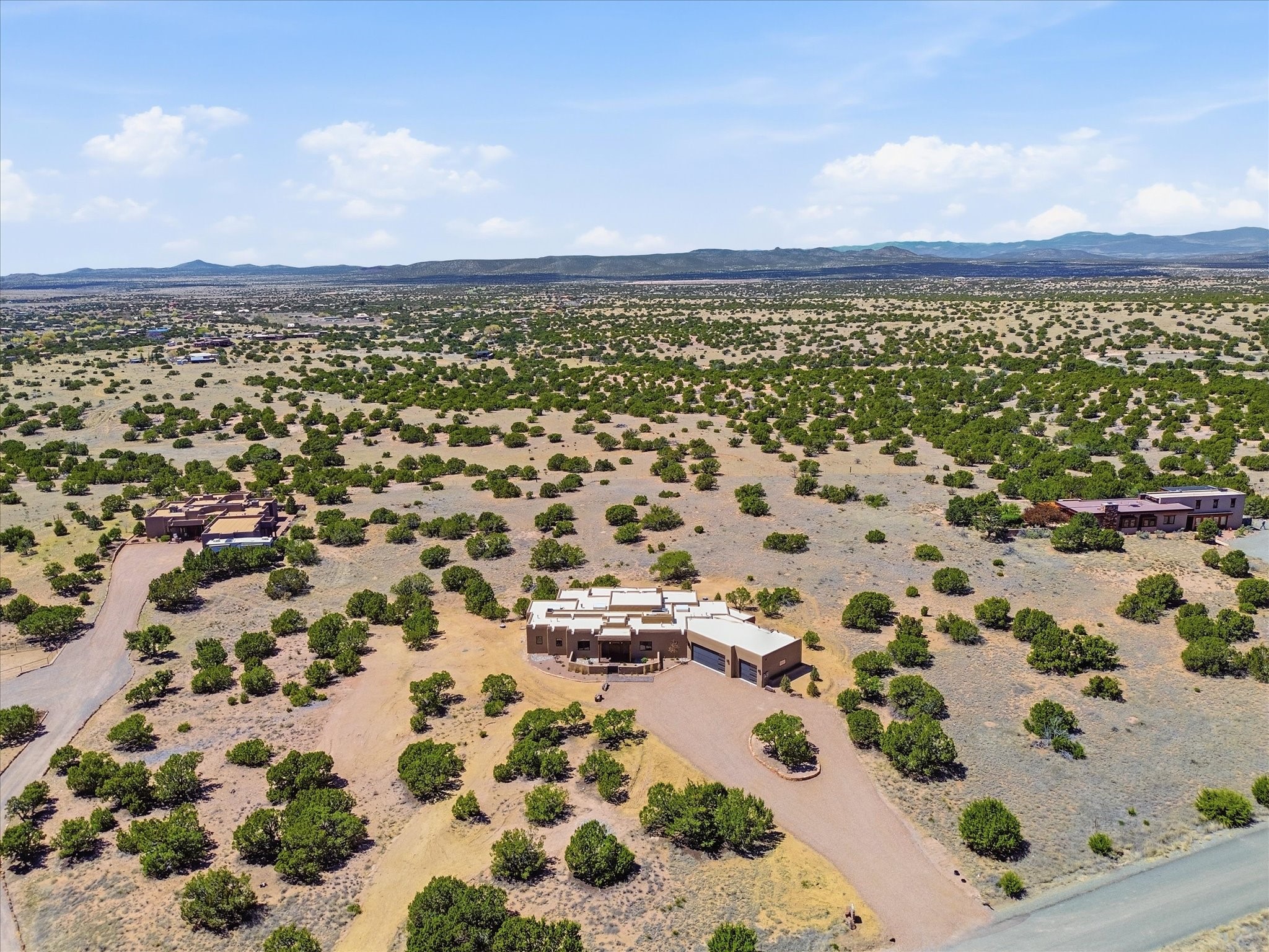 33 Tierra Grande is set on 3.1 equestrian-friendly acres and this sophisticated single-level home offers a seamless layout framed by dramatic vigas, travertine throughout the main living area, and hickory chestnut floors in the three bedrooms and office. The home's centerpiece is a true gourmet kitchen thoughtfully designed featuring Thermador appliances, a built-in wine cooler, elegant quartz countertops, and custom knotty alder cabinetry. This chef's sanctuary flows effortlessly into a dedicated separate dining area, perfect for hosting intimate dinners against a backdrop of the natural landscape and mountain views. Retreat to the primary suite or two additional ensuite bedrooms, all kept comfortable by in-floor radiant heat and high-efficiency ducted mini-splits. Beyond the large brick covered portal and xeriscaped grounds, residents enjoy direct access to miles of private community riding and hiking trails, blending refined modern luxury with the ultimate Santa Fe outdoor lifestyle.
