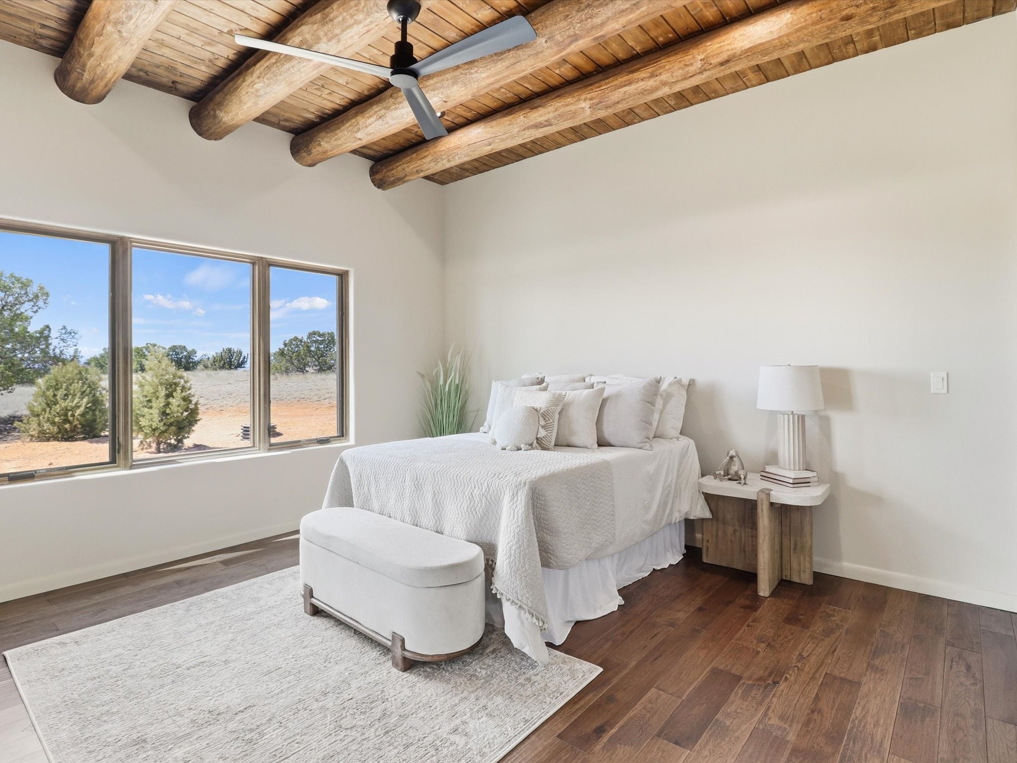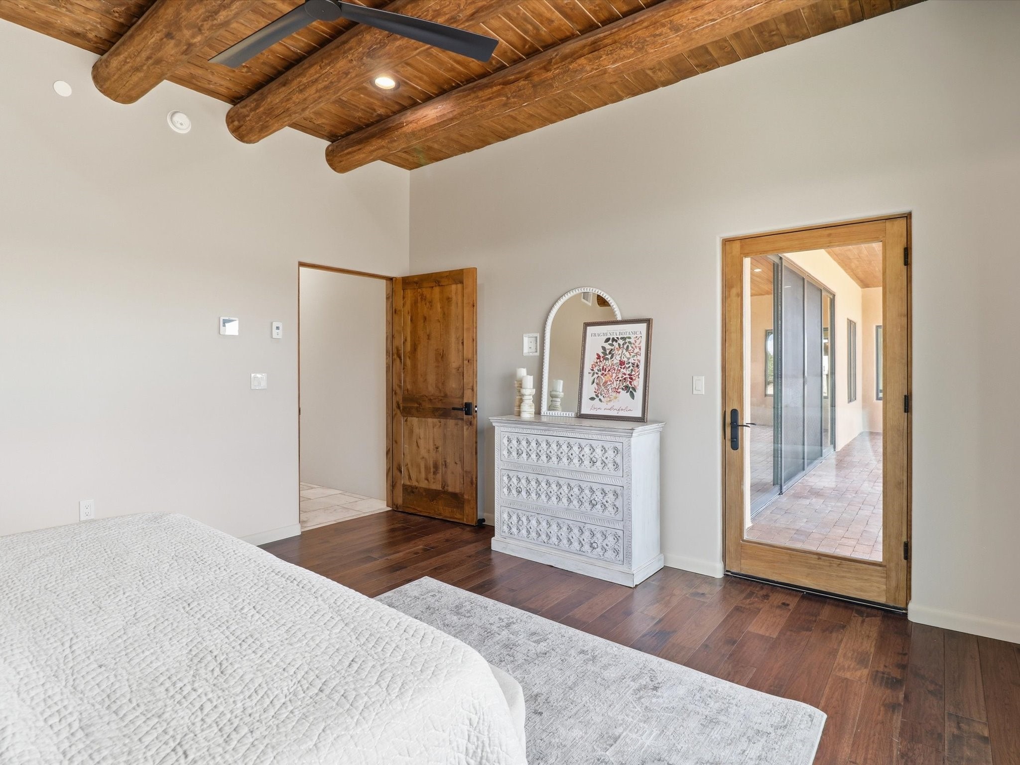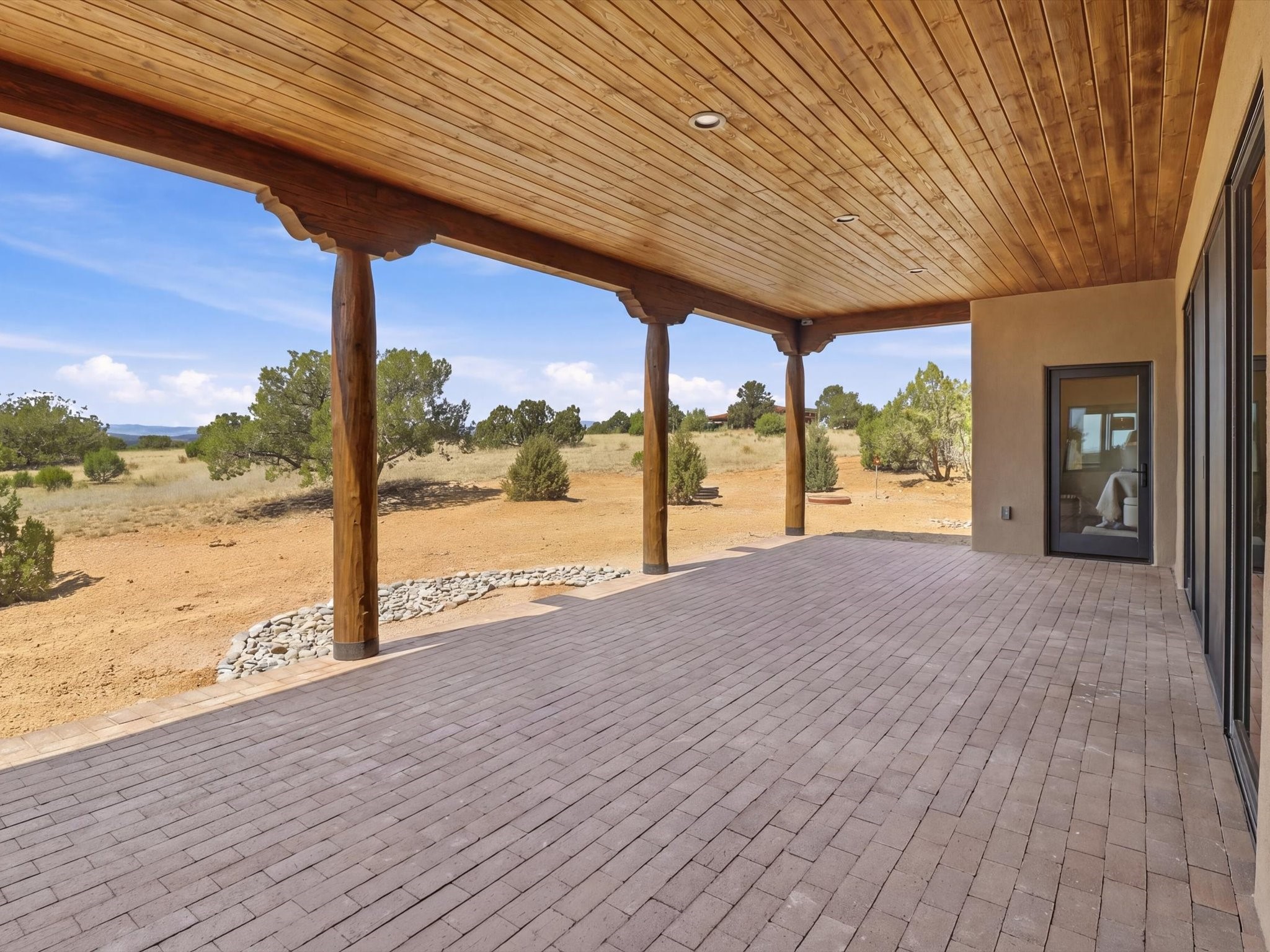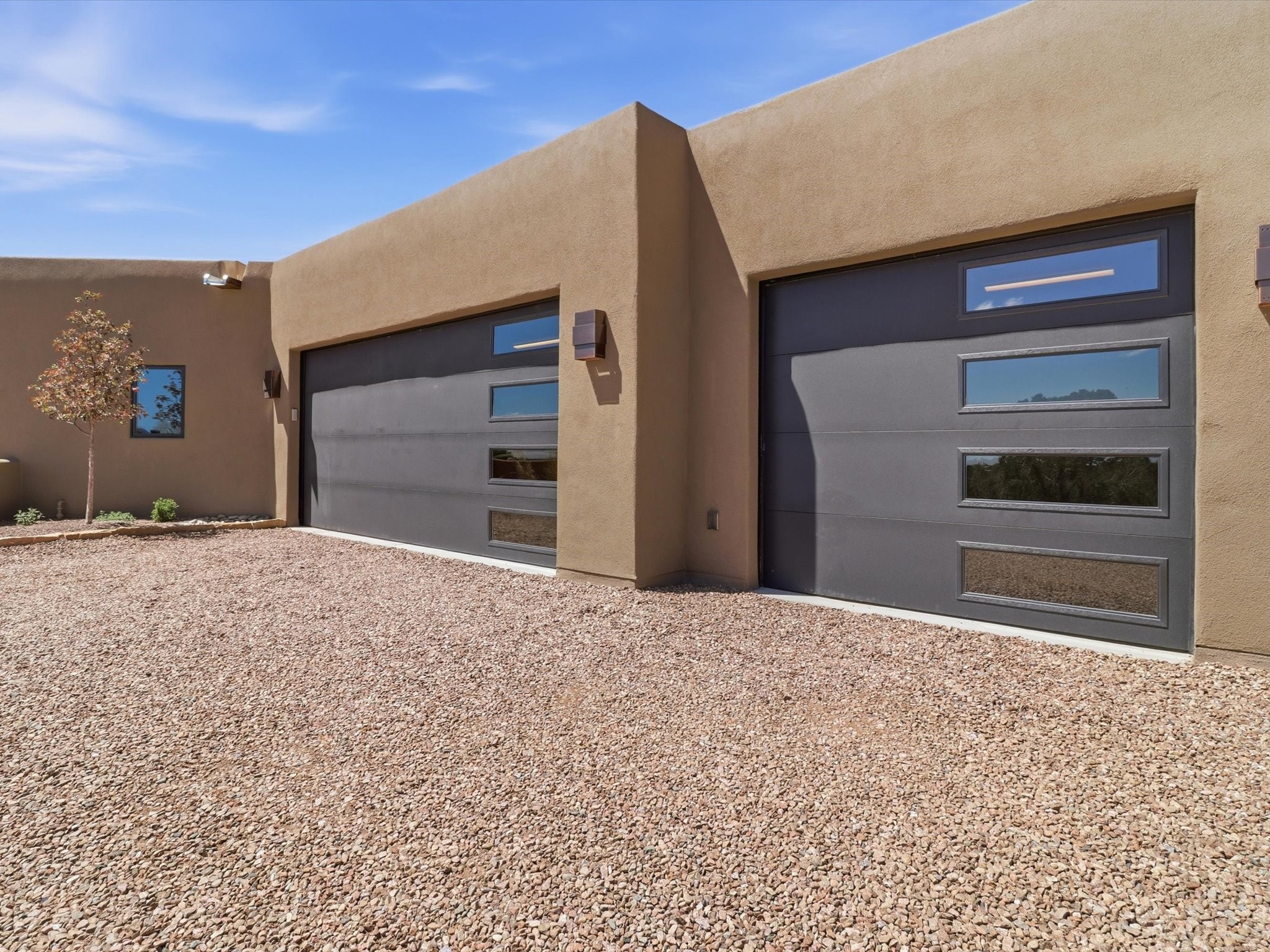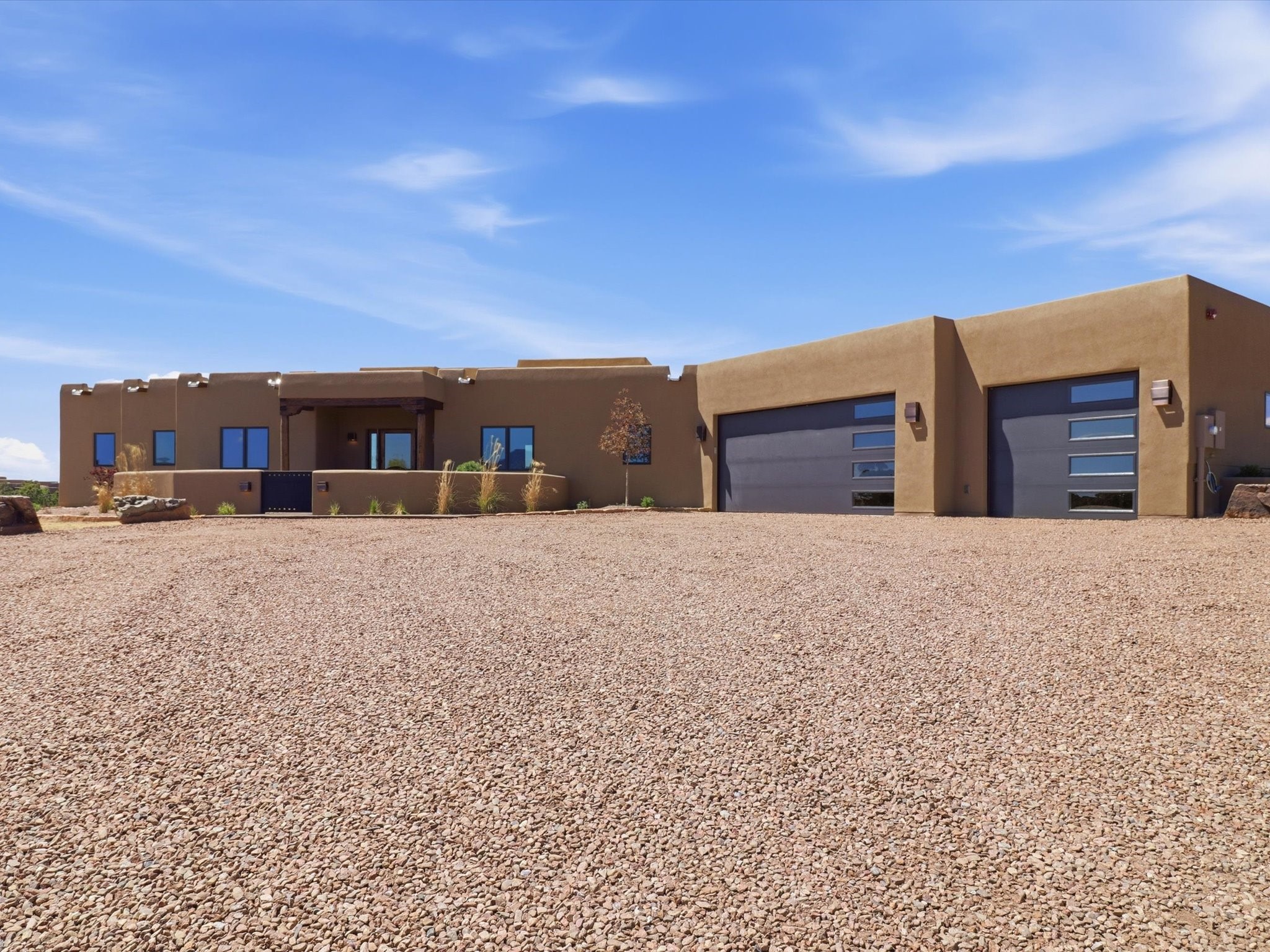 33 Tierra Grande is set on 3.1 equestrian-friendly acres and this sophisticated single-level home offers a seamless layout framed by dramatic vigas, travertine throughout the main living area, and hickory chestnut floors in the three bedrooms and office. The home's centerpiece is a true gourmet kitchen thoughtfully designed featuring Thermador appliances, a built-in wine cooler, elegant quartz countertops, and custom knotty alder cabinetry. This chef's sanctuary flows effortlessly into a dedicated separate dining area, perfect for hosting intimate dinners against a backdrop of the natural landscape and mountain views. Retreat to the primary suite or two additional ensuite bedrooms, all kept comfortable by in-floor radiant heat and high-efficiency ducted mini-splits. Beyond the large brick covered portal and xeriscaped grounds, residents enjoy direct access to miles of private community riding and hiking trails, blending refined modern luxury with the ultimate Santa Fe outdoor lifestyle.