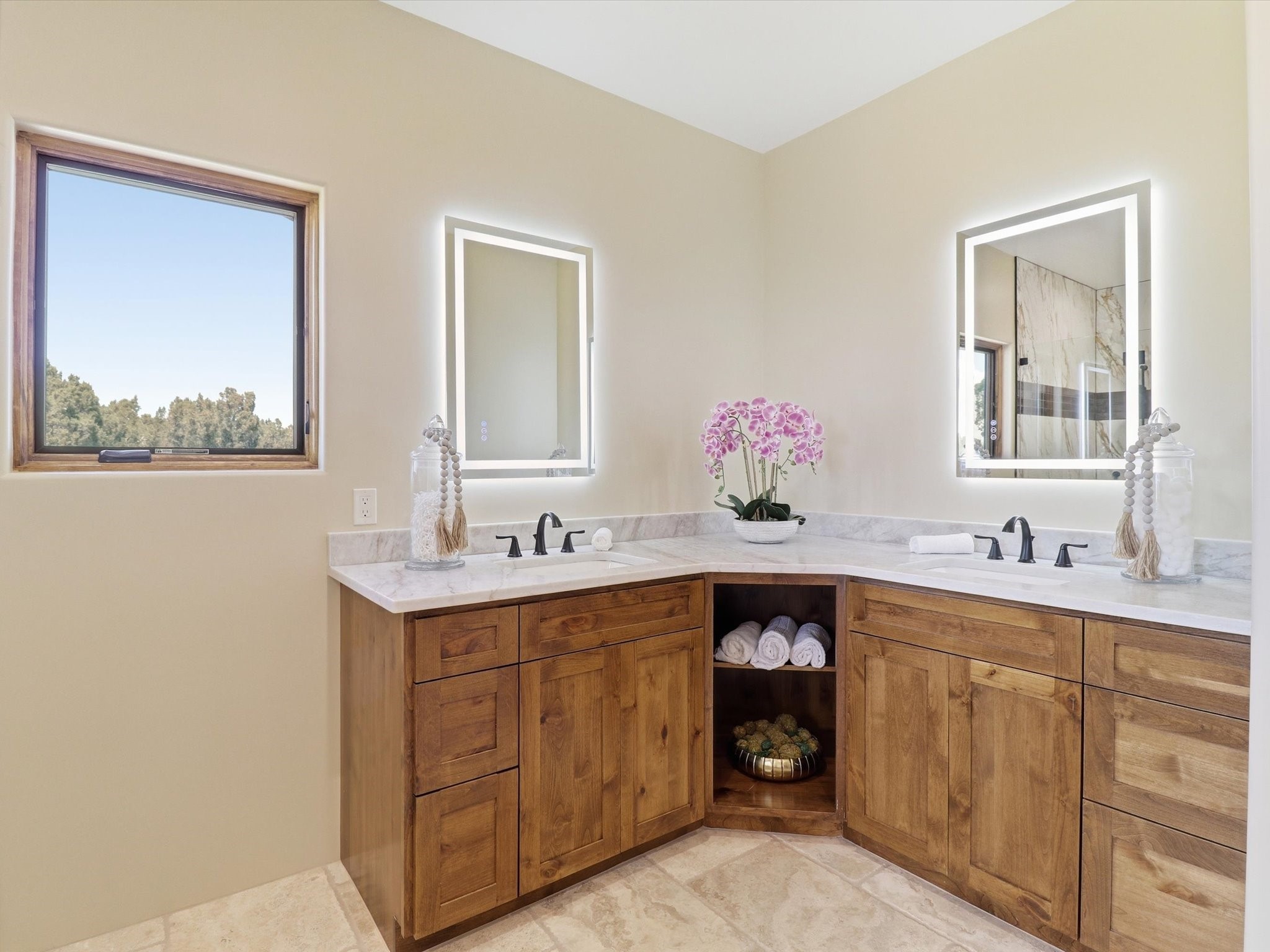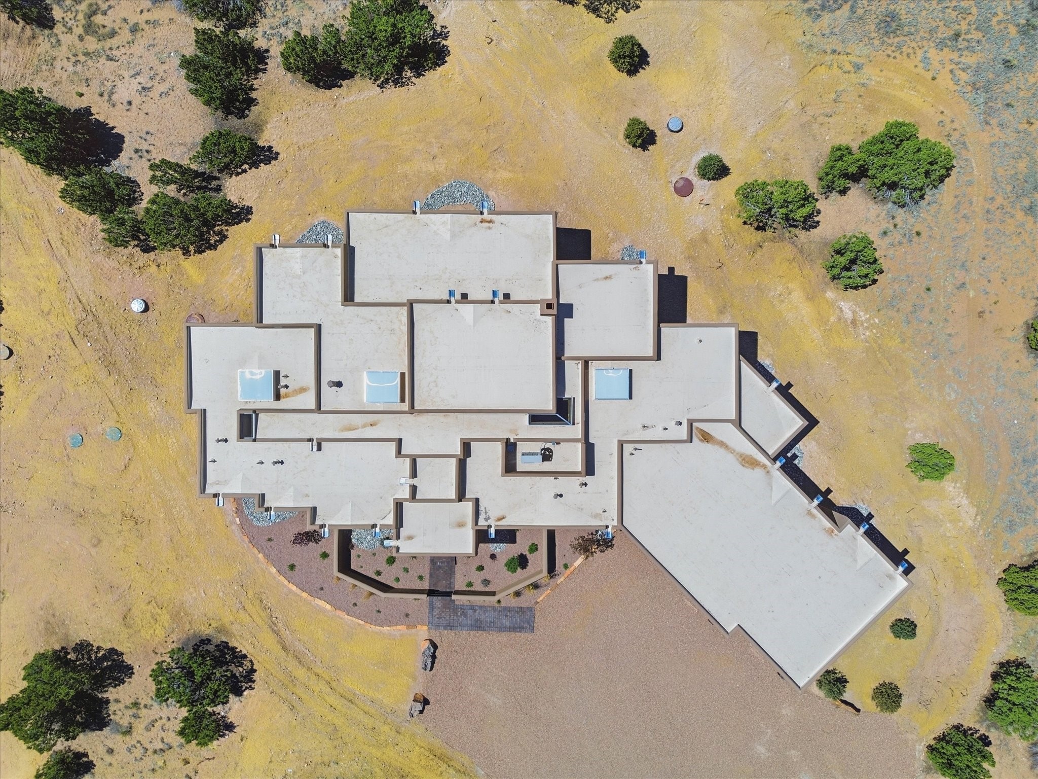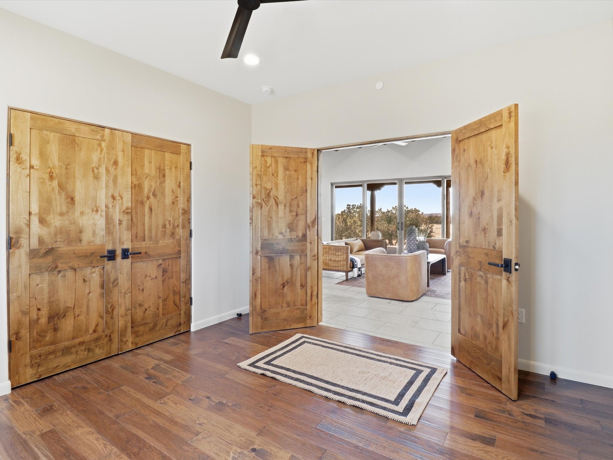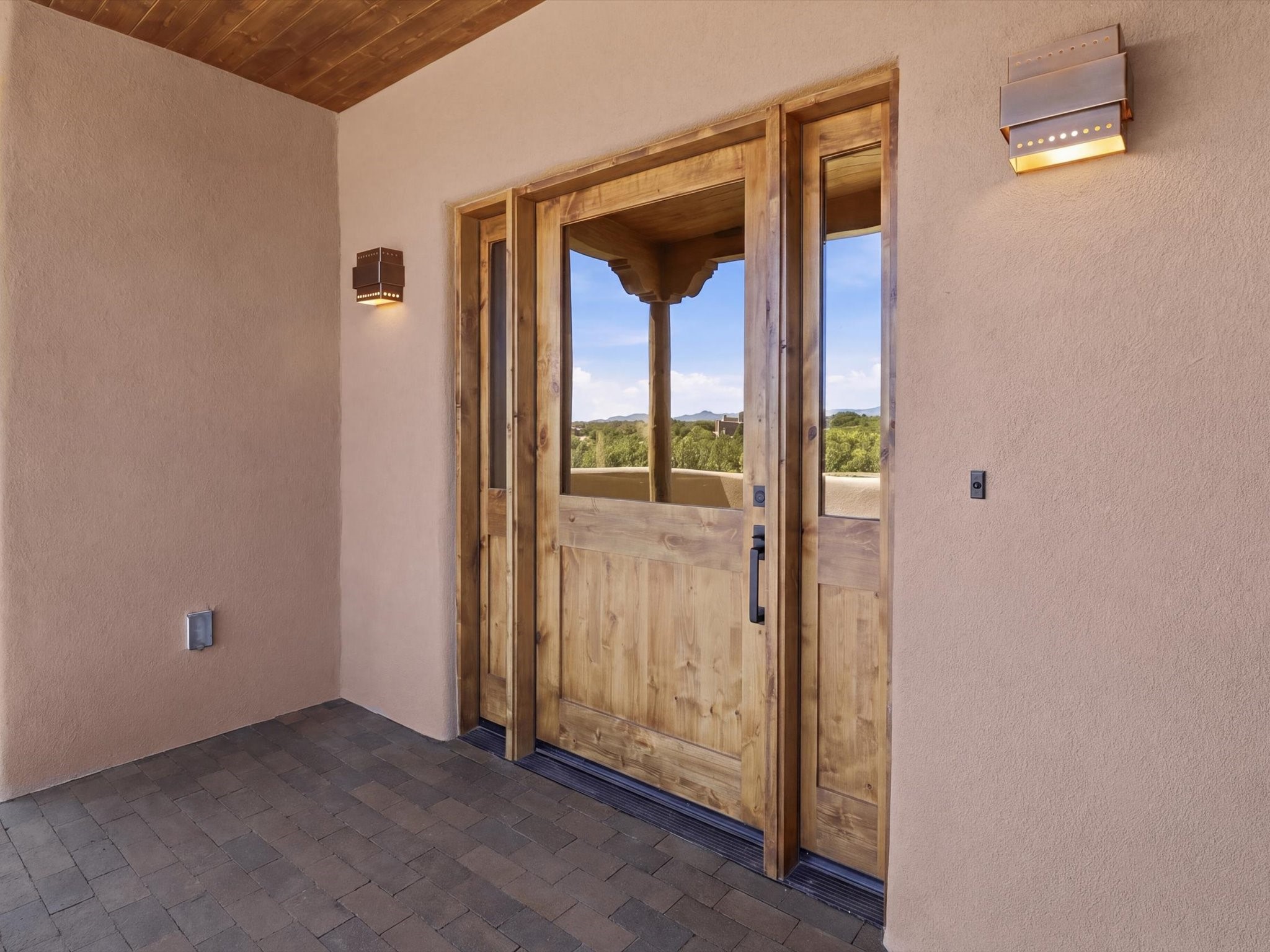 33 Tierra Grande is set on 3.1 equestrian-friendly acres and this sophisticated single-level home offers a seamless layout framed by dramatic vigas, travertine throughout the main living area, and hickory chestnut floors in the three bedrooms and office. The home's centerpiece is a true gourmet kitchen thoughtfully designed featuring Thermador appliances, a built-in wine cooler, elegant quartz countertops, and custom knotty alder cabinetry. This chef's sanctuary flows effortlessly into a dedicated separate dining area, perfect for hosting intimate dinners against a backdrop of the natural landscape and mountain views. Retreat to the primary suite or two additional ensuite bedrooms, all kept comfortable by in-floor radiant heat and high-efficiency ducted mini-splits. Beyond the large brick covered portal and xeriscaped grounds, residents enjoy direct access to miles of private community riding and hiking trails, blending refined modern luxury with the ultimate Santa Fe outdoor lifestyle.