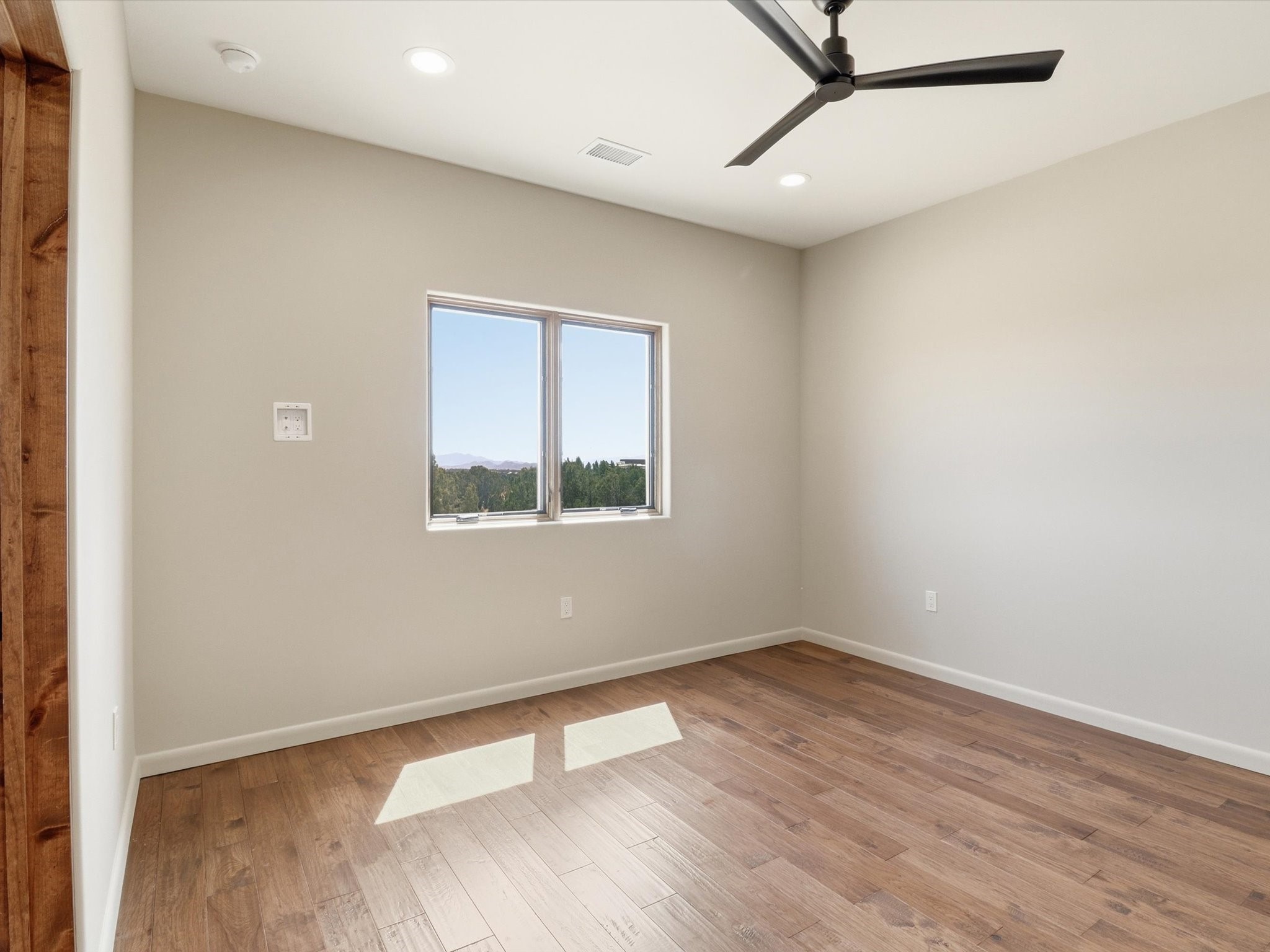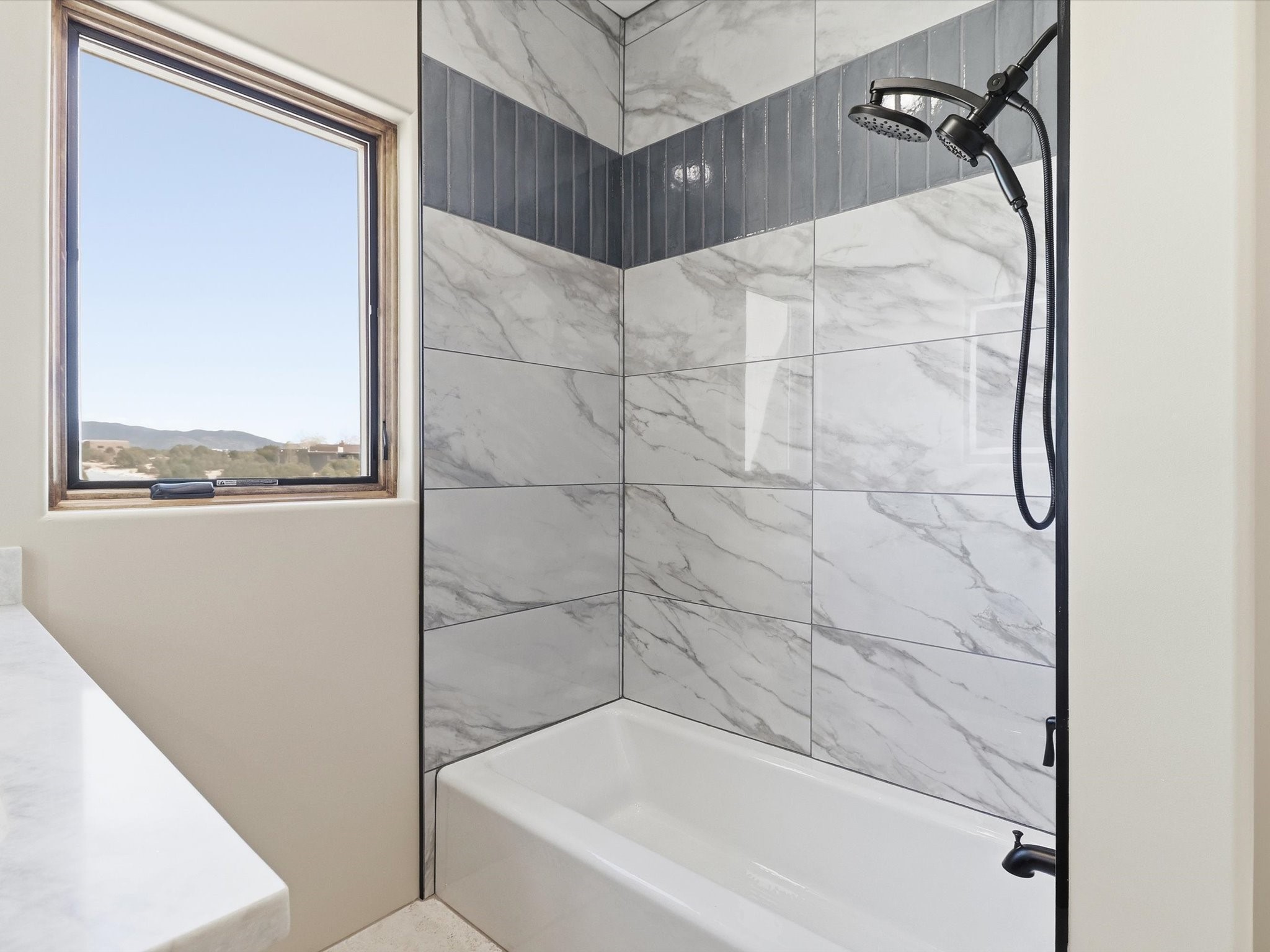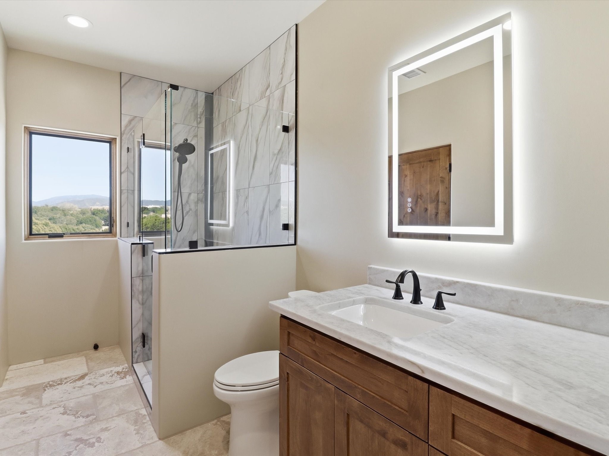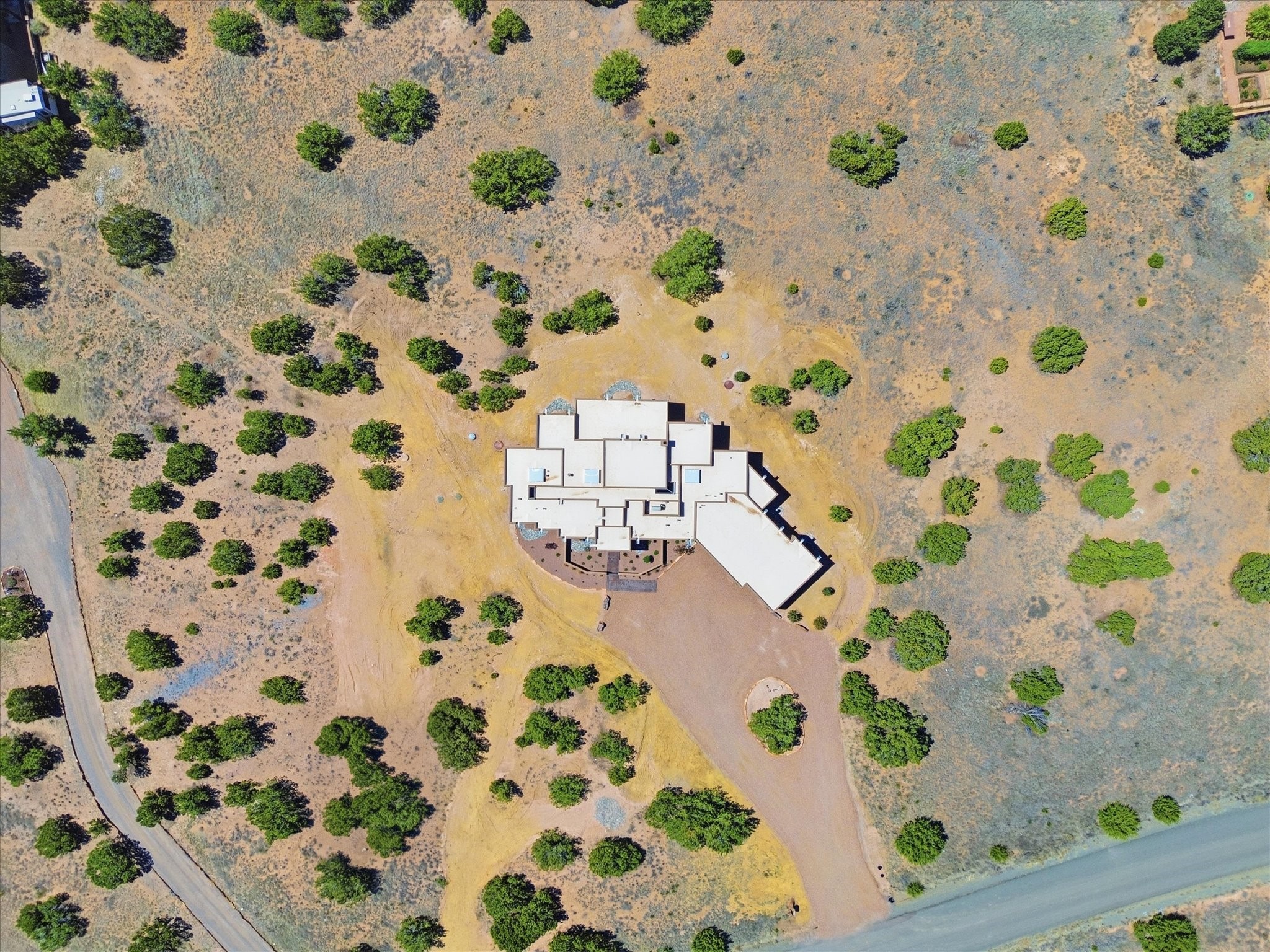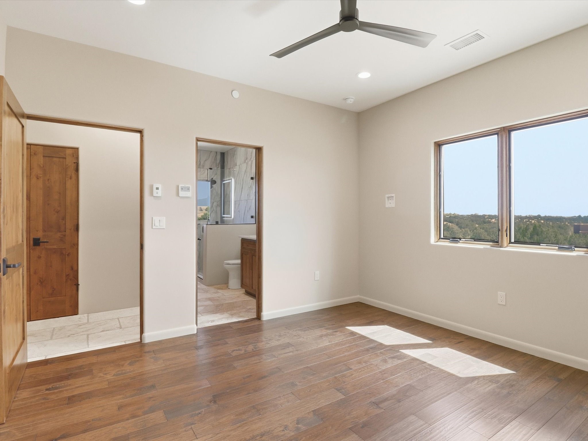 33 Tierra Grande is set on 3.1 equestrian-friendly acres and this sophisticated single-level home offers a seamless layout framed by dramatic vigas, travertine throughout the main living area, and hickory chestnut floors in the three bedrooms and office. The home's centerpiece is a true gourmet kitchen thoughtfully designed featuring Thermador appliances, a built-in wine cooler, elegant quartz countertops, and custom knotty alder cabinetry. This chef's sanctuary flows effortlessly into a dedicated separate dining area, perfect for hosting intimate dinners against a backdrop of the natural landscape and mountain views. Retreat to the primary suite or two additional ensuite bedrooms, all kept comfortable by in-floor radiant heat and high-efficiency ducted mini-splits. Beyond the large brick covered portal and xeriscaped grounds, residents enjoy direct access to miles of private community riding and hiking trails, blending refined modern luxury with the ultimate Santa Fe outdoor lifestyle.