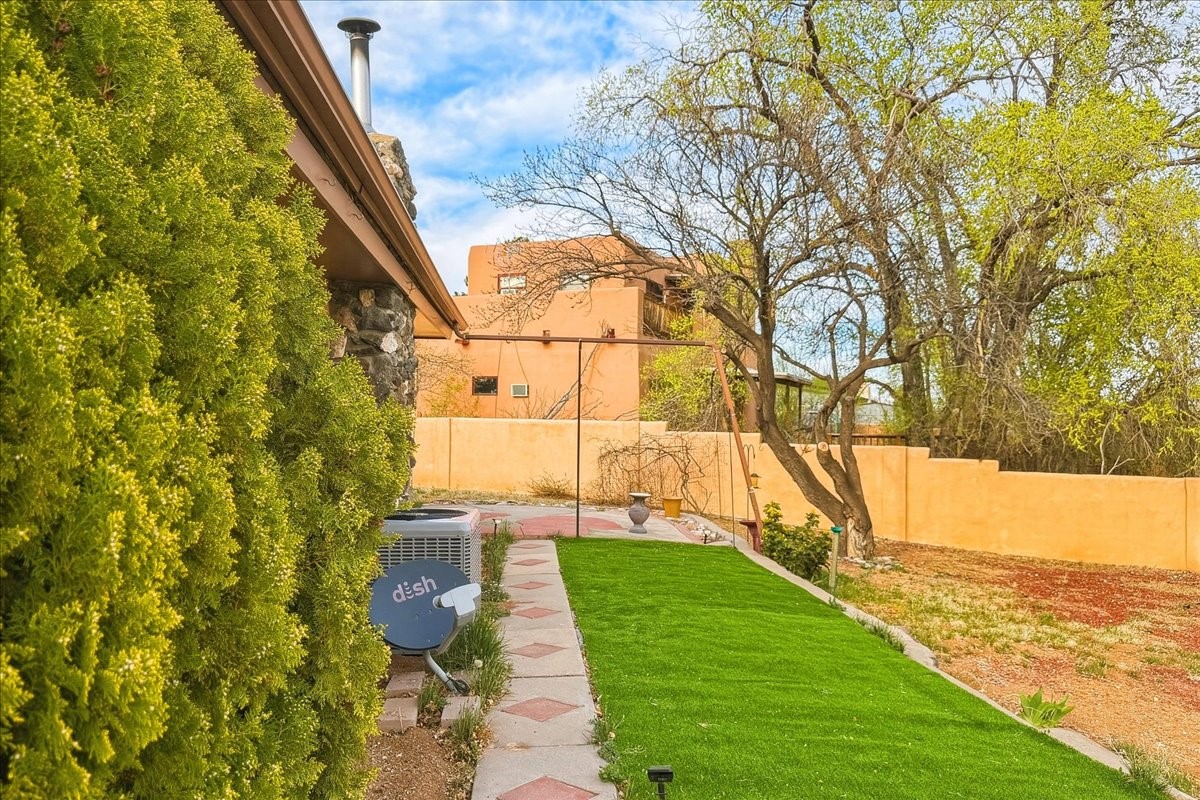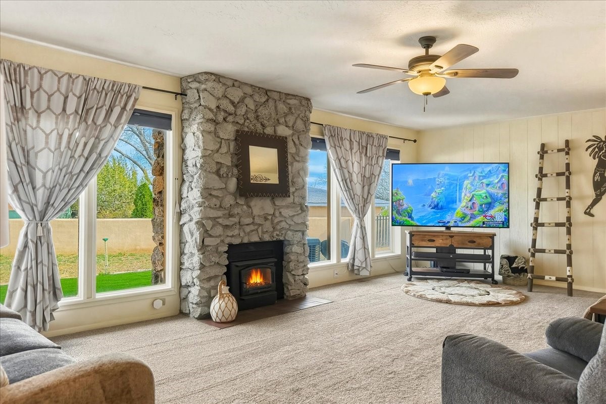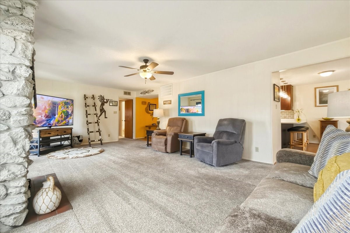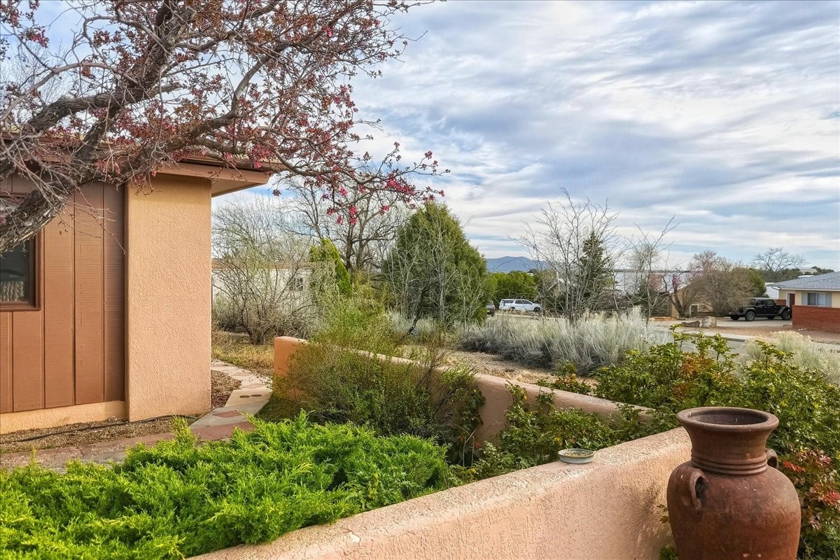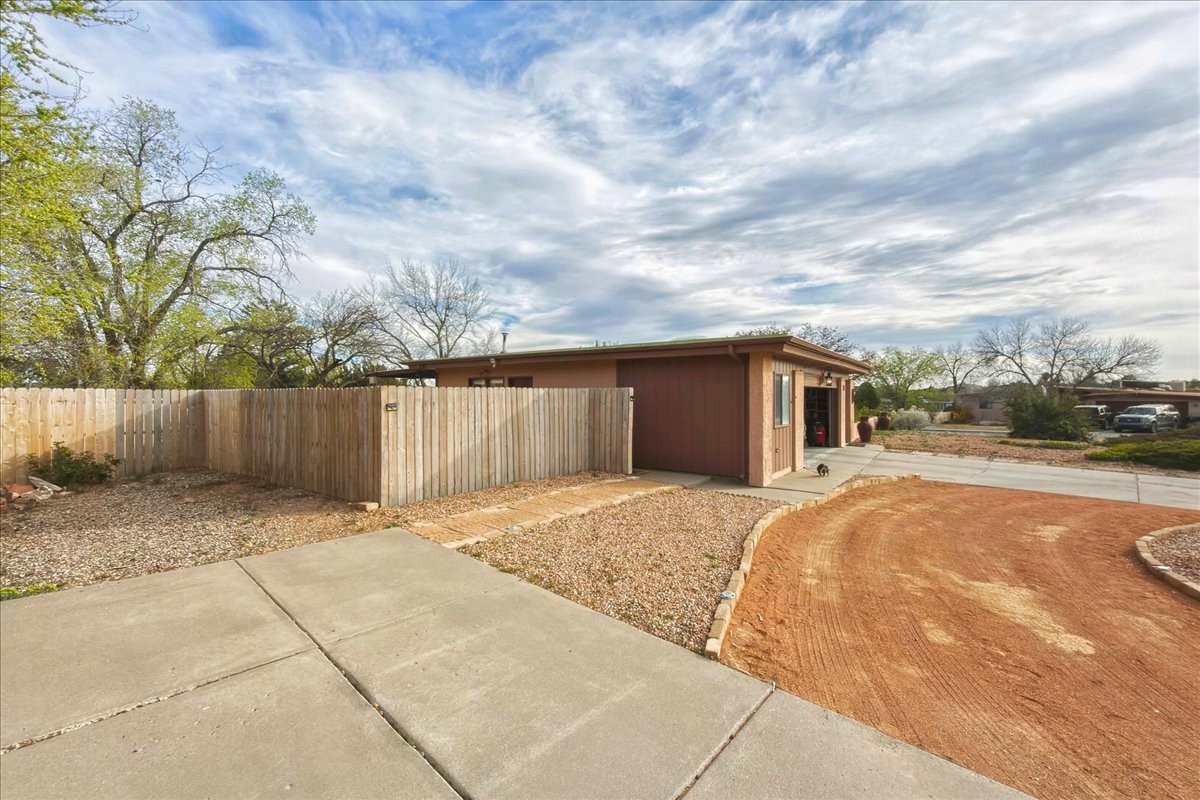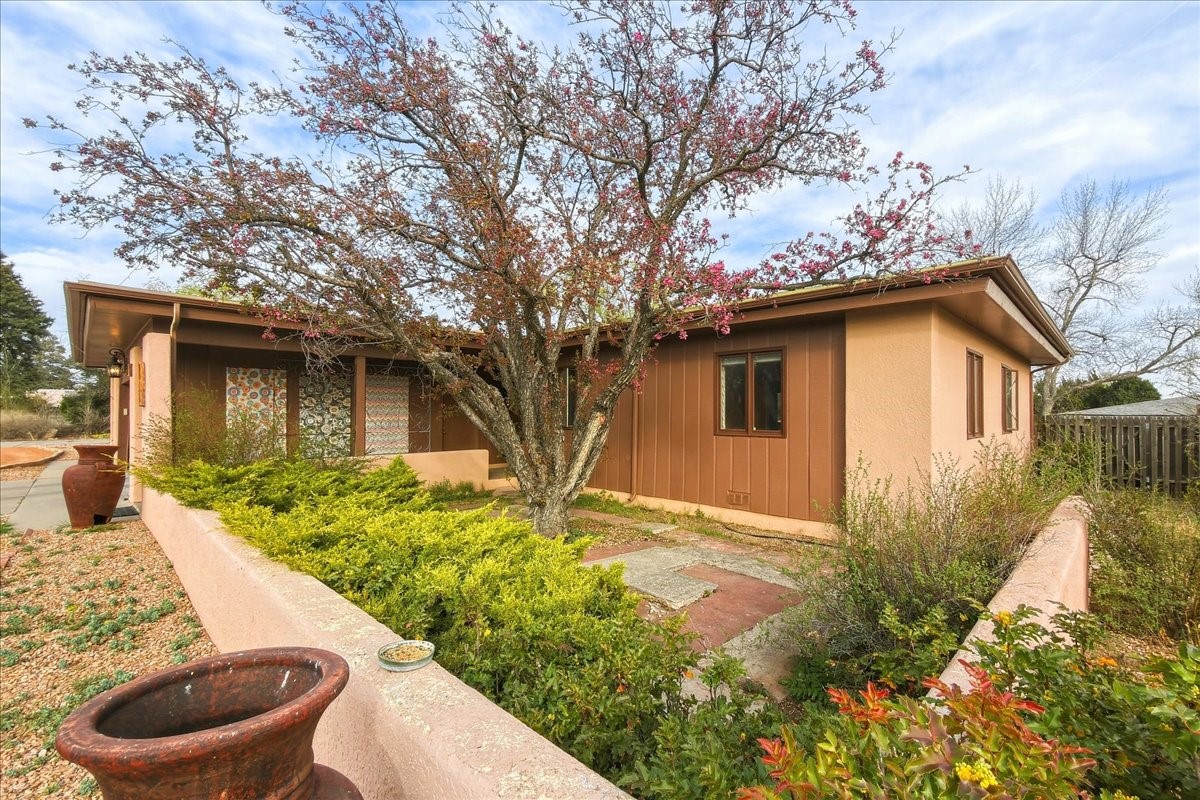 Welcome to this charming ranch single level home located on a large corner lot .37 acre with circle driveway, two driveway's for easy access, easy to maintain with xeriscaping in front and large backyard with new block wall and fencing, covered walkway leads you to your front door and private courtyard, a generous coat closet as you step into this beautiful Light bright living and dining room with 11-6Ft. floor to ceiling windows provides a great view of open skies, floor to ceiling stone fireplace insert-blower to keep you warm throughout the house. The open dining room has a large built-in well lite display cases to display artifacts or entertain, Hardwood flooring throughout, New black out shades in all rooms, Three Skylights, New 6Ft. sliding door in living room that leads out to patio area, three spacious bedrooms, two renovated bathrooms, primary bathroom has walk-in shower with niche', new vanity with self-closing drawers, Don't forget to turn on your Heated Towel Bar when taking a shower, all bathrooms have modern updates, guest bathroom has new tub, new tile surround floor to ceiling, niche', back-lit Fog-Free mirror, updated flooring, Ceiling fans in all bedrooms, living room and dining room for optimal air circulation throughout the house, New Air Conditioning installed in 2024 to keep you cool and comfortable during hot summer days and restful nights, Updated Kitchen with oak cabinets, plenty of storage and pull-out drawers, New Quartz counter tops, eight-foot peninsula, newer efficient appliances, oversized two-car garage with sealed floors, attached fully finished 153 SQ.FT. heated workshop-laundry room ideal for hobbies or projects Two outbuildings for extra storage bring your RV and toys, beautiful mature fruit trees making the outdoor area both practical and inviting, this home is located two blocks from entering LAB property short commute to work, conveniently close to Library, 3 blocks to school, on the corner of the bus stop to transport you to free summer night concerts.