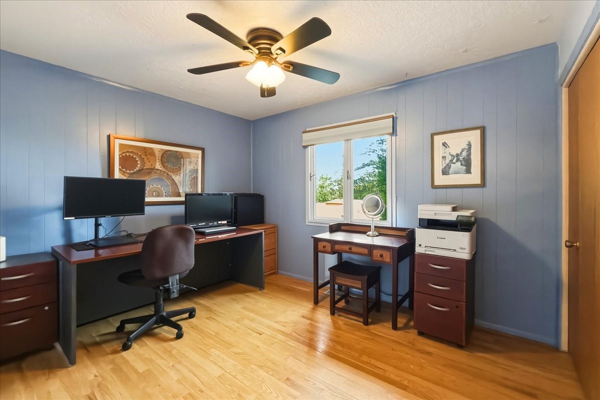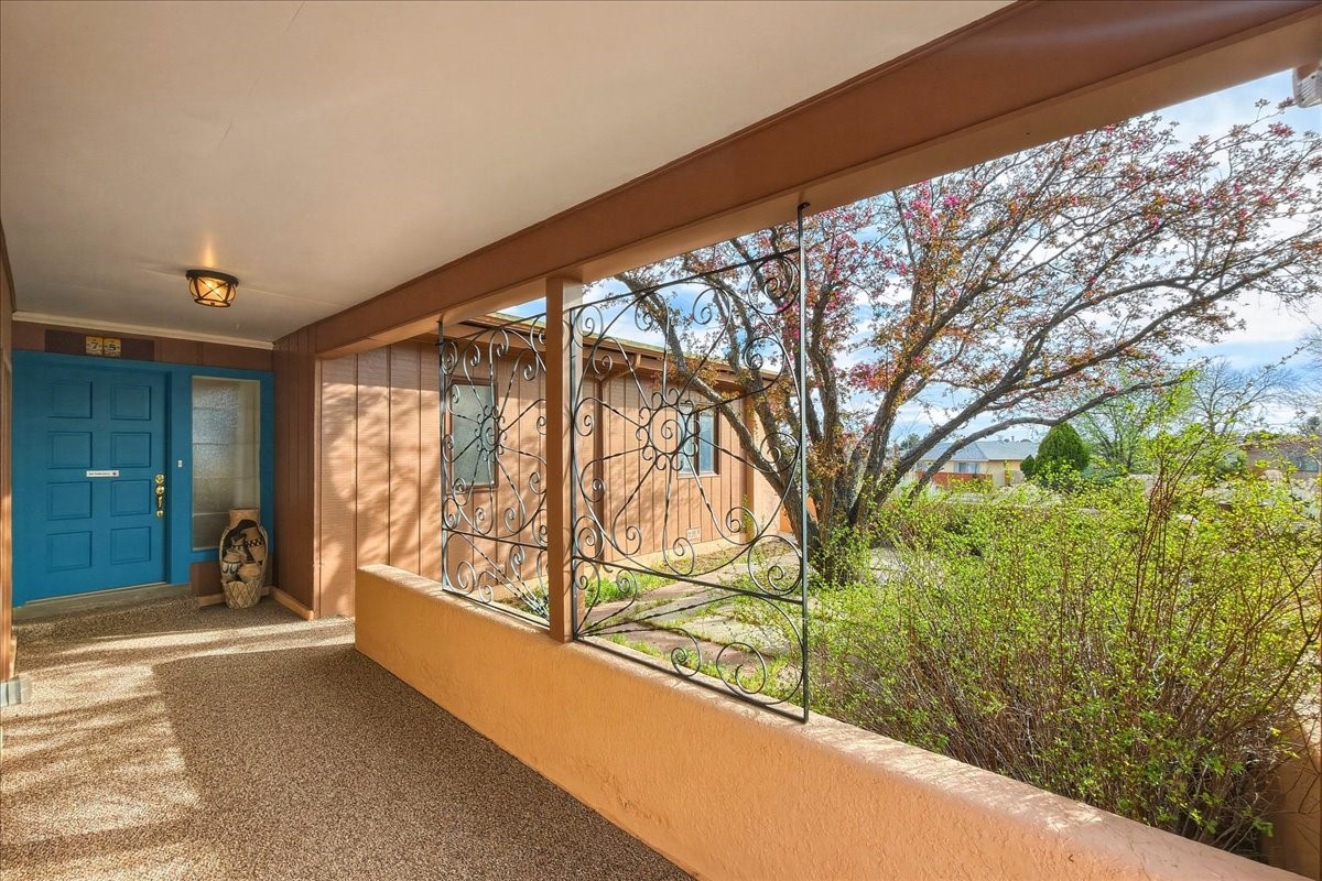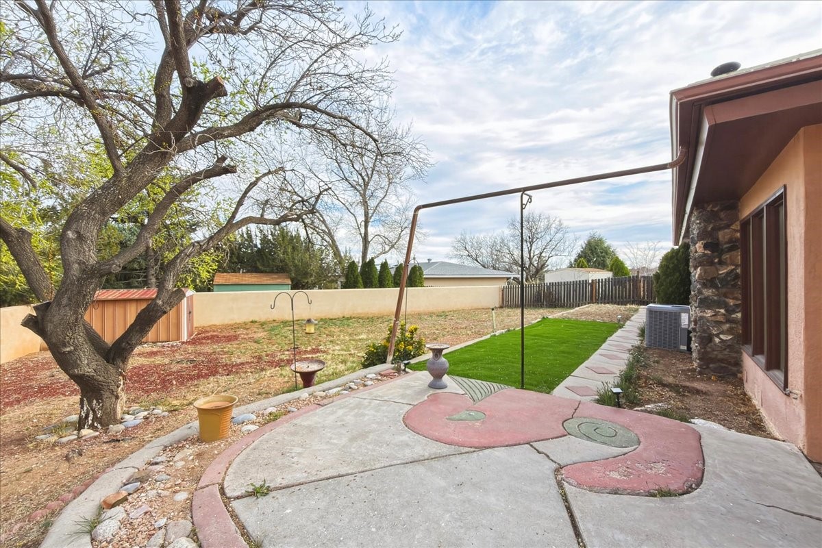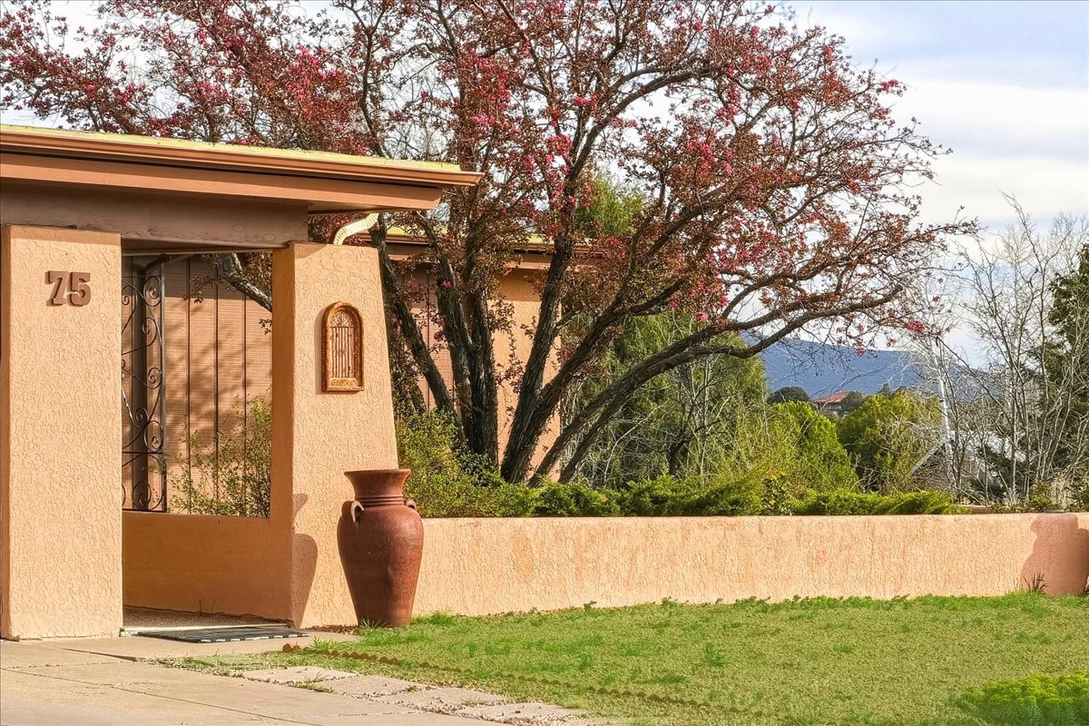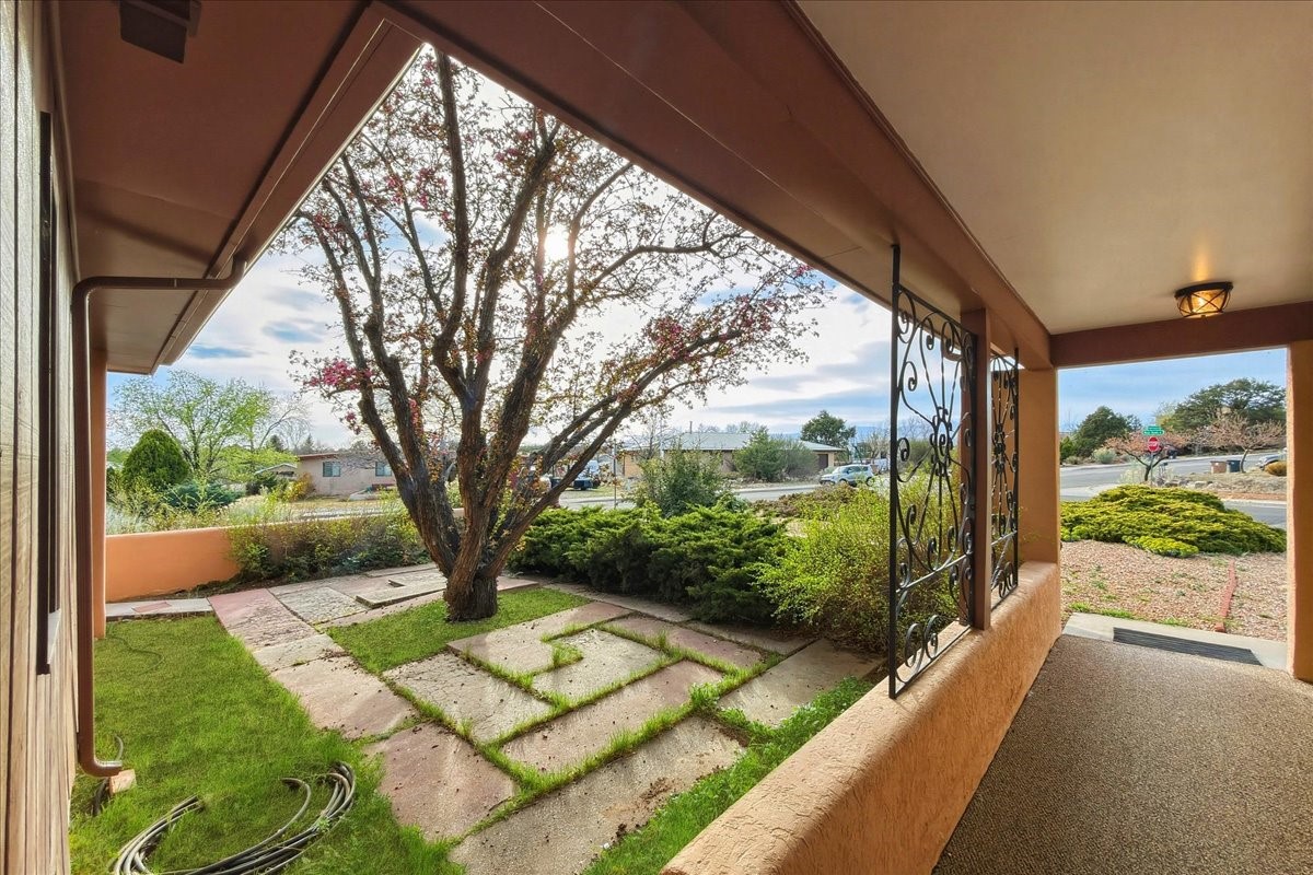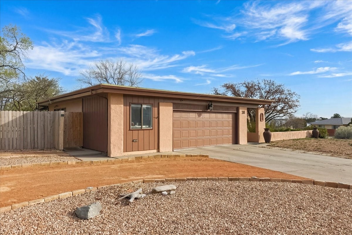 Welcome to this charming ranch single level home located on a large corner lot .37 acre with circle driveway, two driveway's for easy access, easy to maintain with xeriscaping in front and large backyard with new block wall and fencing, covered walkway leads you to your front door and private courtyard, a generous coat closet as you step into this beautiful Light bright living and dining room with 11-6Ft. floor to ceiling windows provides a great view of open skies, floor to ceiling stone fireplace insert-blower to keep you warm throughout the house. The open dining room has a large built-in well lite display cases to display artifacts or entertain, Hardwood flooring throughout, New black out shades in all rooms, Three Skylights, New 6Ft. sliding door in living room that leads out to patio area, three spacious bedrooms, two renovated bathrooms, primary bathroom has walk-in shower with niche', new vanity with self-closing drawers, Don't forget to turn on your Heated Towel Bar when taking a shower, all bathrooms have modern updates, guest bathroom has new tub, new tile surround floor to ceiling, niche', back-lit Fog-Free mirror, updated flooring, Ceiling fans in all bedrooms, living room and dining room for optimal air circulation throughout the house, New Air Conditioning installed in 2024 to keep you cool and comfortable during hot summer days and restful nights, Updated Kitchen with oak cabinets, plenty of storage and pull-out drawers, New Quartz counter tops, eight-foot peninsula, newer efficient appliances, oversized two-car garage with sealed floors, attached fully finished 153 SQ.FT. heated workshop-laundry room ideal for hobbies or projects Two outbuildings for extra storage bring your RV and toys, beautiful mature fruit trees making the outdoor area both practical and inviting, this home is located two blocks from entering LAB property short commute to work, conveniently close to Library, 3 blocks to school, on the corner of the bus stop to transport you to free summer night concerts.