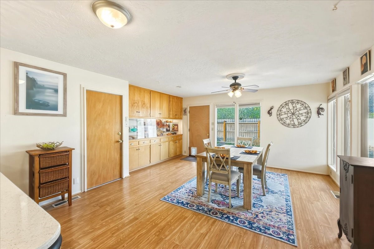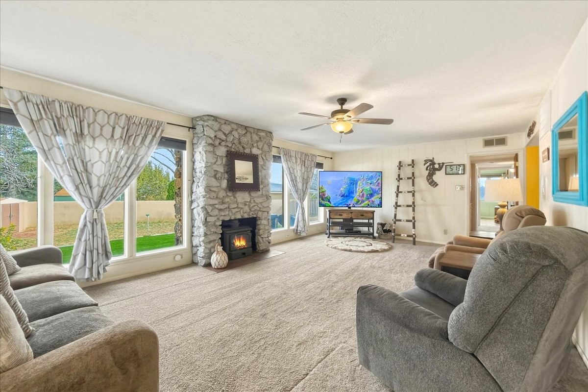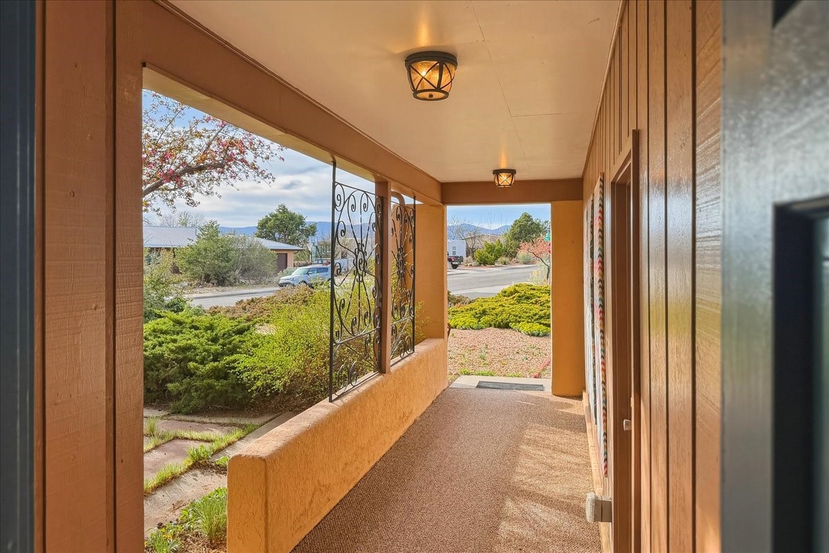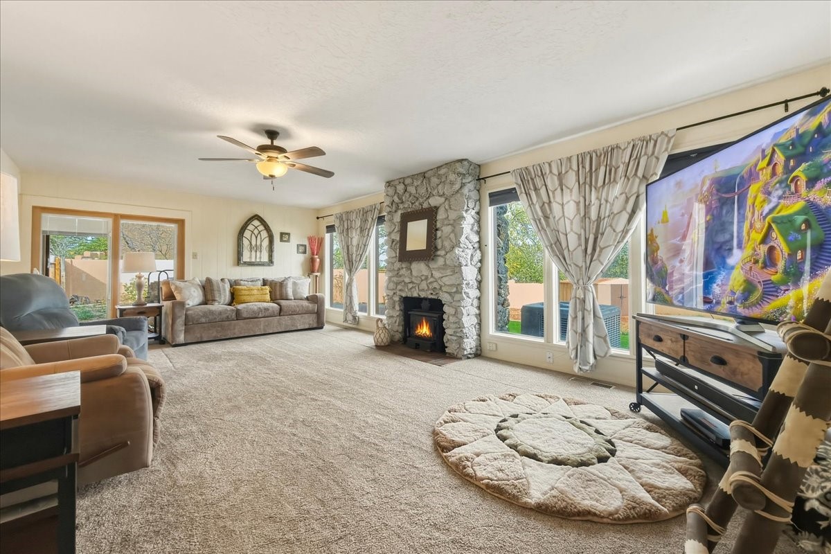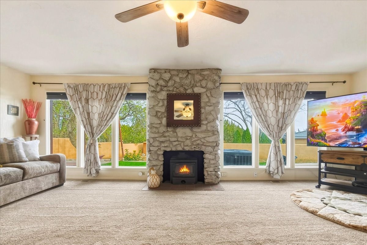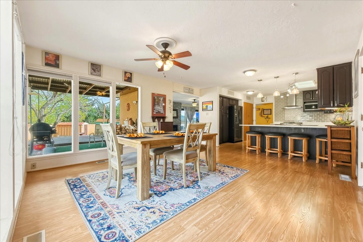 Welcome to this charming ranch single level home located on a large corner lot .37 acre with circle driveway, two driveway's for easy access, easy to maintain with xeriscaping in front and large backyard with new block wall and fencing, covered walkway leads you to your front door and private courtyard, a generous coat closet as you step into this beautiful Light bright living and dining room with 11-6Ft. floor to ceiling windows provides a great view of open skies, floor to ceiling stone fireplace insert-blower to keep you warm throughout the house. The open dining room has a large built-in well lite display cases to display artifacts or entertain, Hardwood flooring throughout, New black out shades in all rooms, Three Skylights, New 6Ft. sliding door in living room that leads out to patio area, three spacious bedrooms, two renovated bathrooms, primary bathroom has walk-in shower with niche', new vanity with self-closing drawers, Don't forget to turn on your Heated Towel Bar when taking a shower, all bathrooms have modern updates, guest bathroom has new tub, new tile surround floor to ceiling, niche', back-lit Fog-Free mirror, updated flooring, Ceiling fans in all bedrooms, living room and dining room for optimal air circulation throughout the house, New Air Conditioning installed in 2024 to keep you cool and comfortable during hot summer days and restful nights, Updated Kitchen with oak cabinets, plenty of storage and pull-out drawers, New Quartz counter tops, eight-foot peninsula, newer efficient appliances, oversized two-car garage with sealed floors, attached fully finished 153 SQ.FT. heated workshop-laundry room ideal for hobbies or projects Two outbuildings for extra storage bring your RV and toys, beautiful mature fruit trees making the outdoor area both practical and inviting, this home is located two blocks from entering LAB property short commute to work, conveniently close to Library, 3 blocks to school, on the corner of the bus stop to transport you to free summer night concerts.