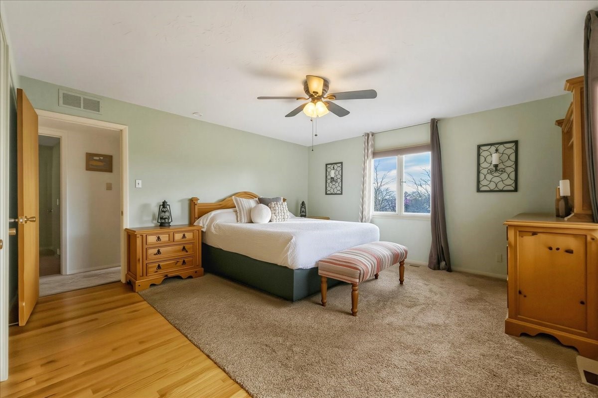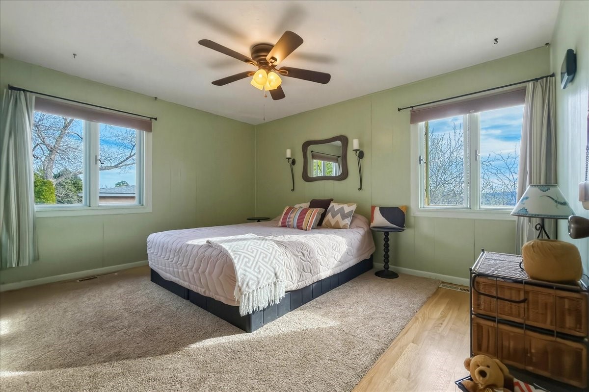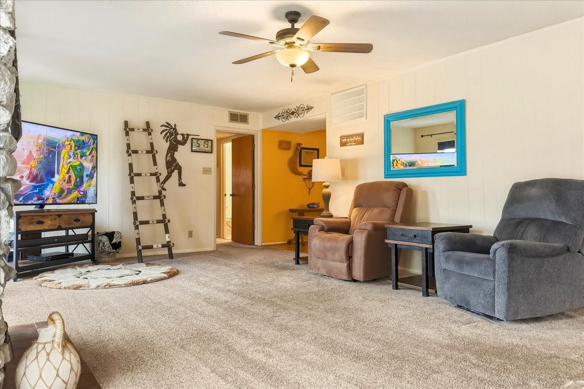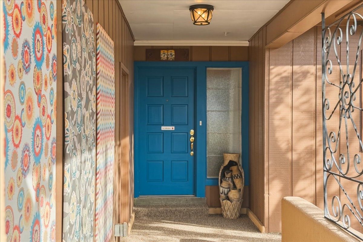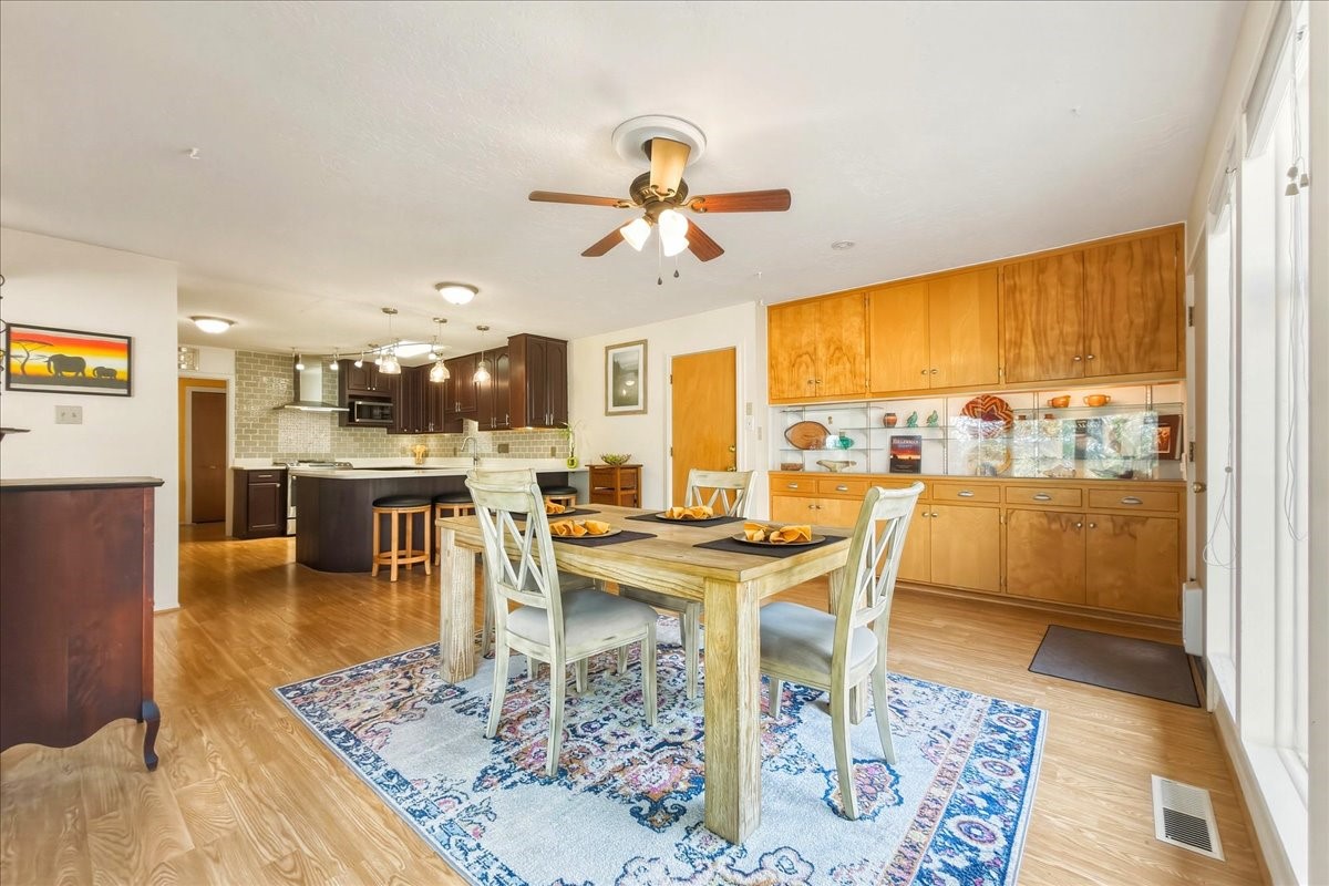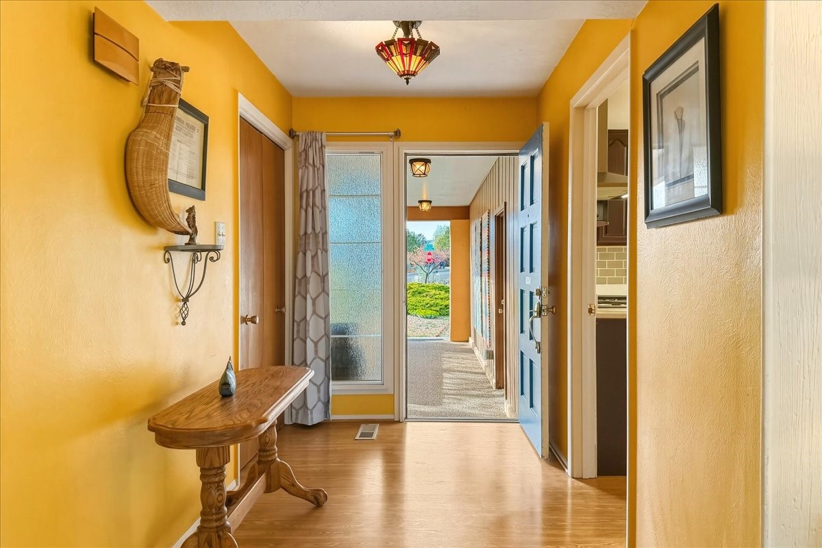 Welcome to this charming ranch single level home located on a large corner lot .37 acre with circle driveway, two driveway's for easy access, easy to maintain with xeriscaping in front and large backyard with new block wall and fencing, covered walkway leads you to your front door and private courtyard, a generous coat closet as you step into this beautiful Light bright living and dining room with 11-6Ft. floor to ceiling windows provides a great view of open skies, floor to ceiling stone fireplace insert-blower to keep you warm throughout the house. The open dining room has a large built-in well lite display cases to display artifacts or entertain, Hardwood flooring throughout, New black out shades in all rooms, Three Skylights, New 6Ft. sliding door in living room that leads out to patio area, three spacious bedrooms, two renovated bathrooms, primary bathroom has walk-in shower with niche', new vanity with self-closing drawers, Don't forget to turn on your Heated Towel Bar when taking a shower, all bathrooms have modern updates, guest bathroom has new tub, new tile surround floor to ceiling, niche', back-lit Fog-Free mirror, updated flooring, Ceiling fans in all bedrooms, living room and dining room for optimal air circulation throughout the house, New Air Conditioning installed in 2024 to keep you cool and comfortable during hot summer days and restful nights, Updated Kitchen with oak cabinets, plenty of storage and pull-out drawers, New Quartz counter tops, eight-foot peninsula, newer efficient appliances, oversized two-car garage with sealed floors, attached fully finished 153 SQ.FT. heated workshop-laundry room ideal for hobbies or projects Two outbuildings for extra storage bring your RV and toys, beautiful mature fruit trees making the outdoor area both practical and inviting, this home is located two blocks from entering LAB property short commute to work, conveniently close to Library, 3 blocks to school, on the corner of the bus stop to transport you to free summer night concerts.