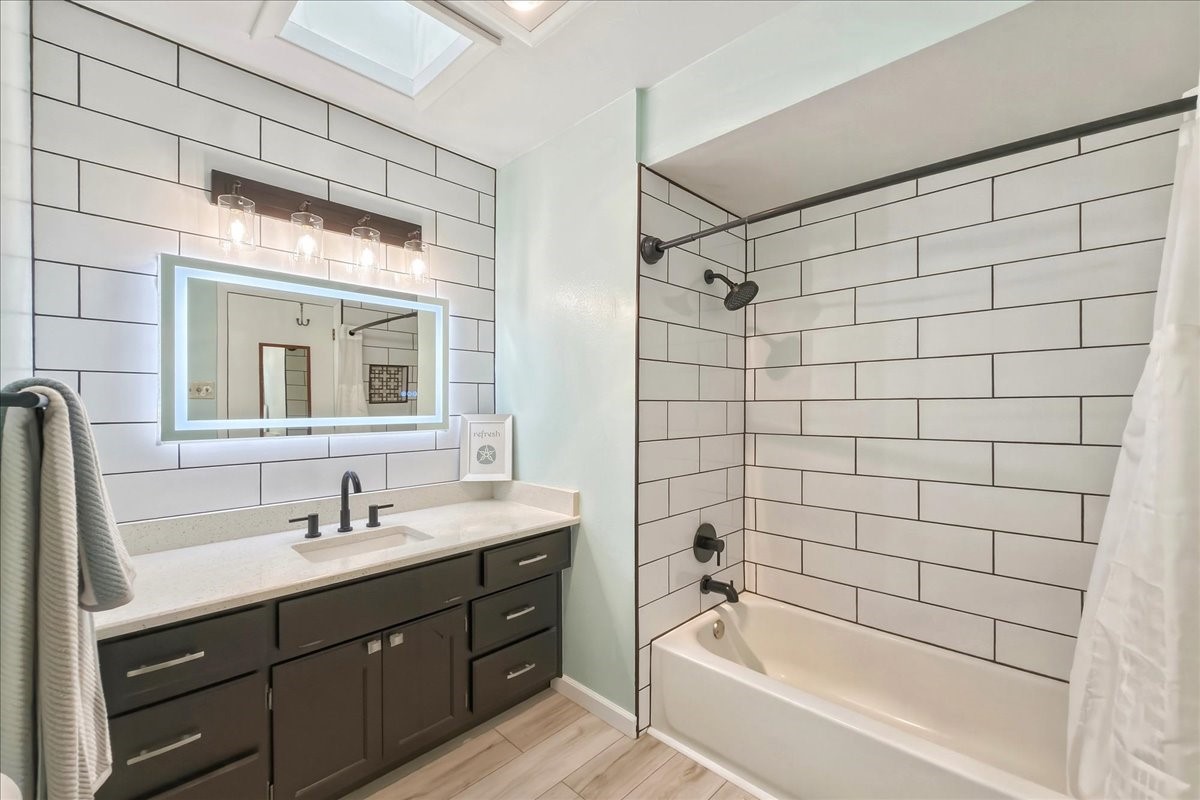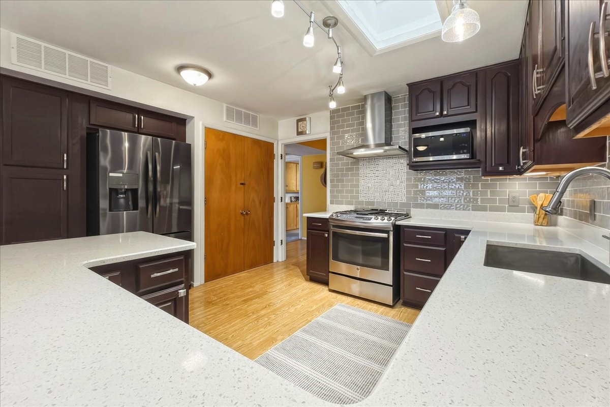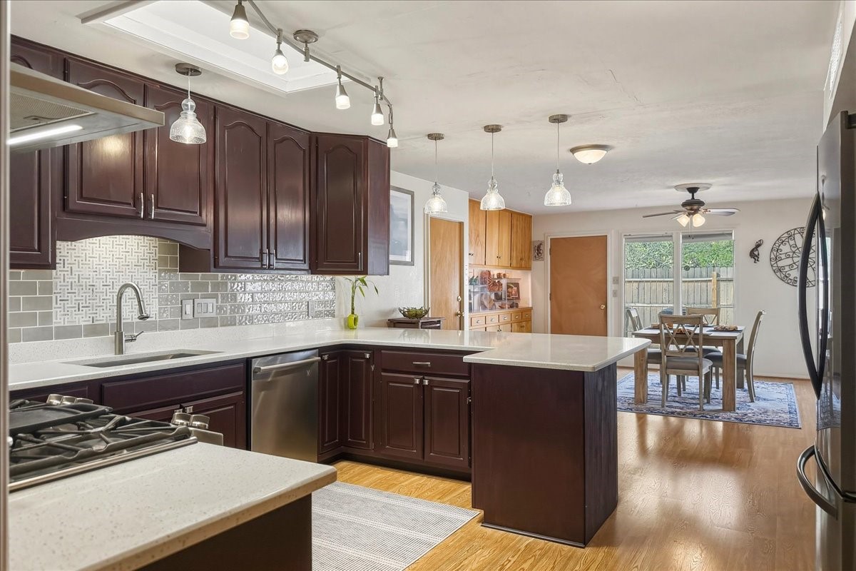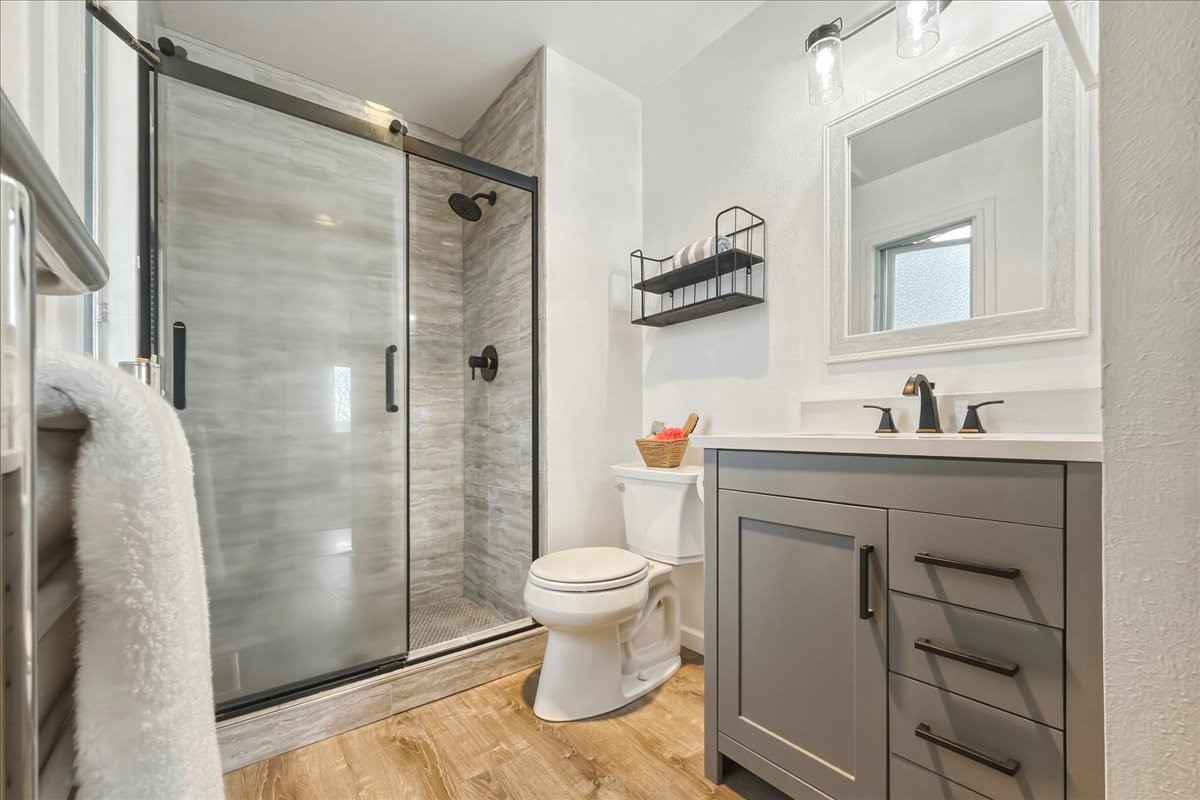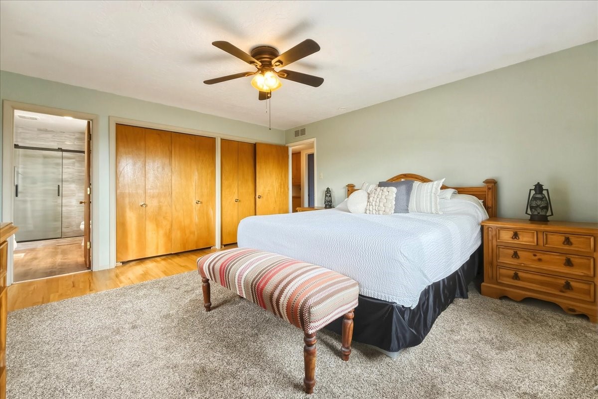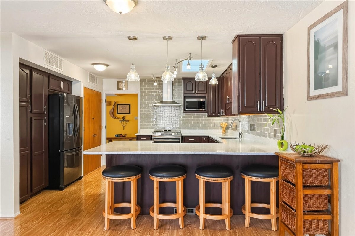 Welcome to this charming ranch single level home located on a large corner lot .37 acre with circle driveway, two driveway's for easy access, easy to maintain with xeriscaping in front and large backyard with new block wall and fencing, covered walkway leads you to your front door and private courtyard, a generous coat closet as you step into this beautiful Light bright living and dining room with 11-6Ft. floor to ceiling windows provides a great view of open skies, floor to ceiling stone fireplace insert-blower to keep you warm throughout the house. The open dining room has a large built-in well lite display cases to display artifacts or entertain, Hardwood flooring throughout, New black out shades in all rooms, Three Skylights, New 6Ft. sliding door in living room that leads out to patio area, three spacious bedrooms, two renovated bathrooms, primary bathroom has walk-in shower with niche', new vanity with self-closing drawers, Don't forget to turn on your Heated Towel Bar when taking a shower, all bathrooms have modern updates, guest bathroom has new tub, new tile surround floor to ceiling, niche', back-lit Fog-Free mirror, updated flooring, Ceiling fans in all bedrooms, living room and dining room for optimal air circulation throughout the house, New Air Conditioning installed in 2024 to keep you cool and comfortable during hot summer days and restful nights, Updated Kitchen with oak cabinets, plenty of storage and pull-out drawers, New Quartz counter tops, eight-foot peninsula, newer efficient appliances, oversized two-car garage with sealed floors, attached fully finished 153 SQ.FT. heated workshop-laundry room ideal for hobbies or projects Two outbuildings for extra storage bring your RV and toys, beautiful mature fruit trees making the outdoor area both practical and inviting, this home is located two blocks from entering LAB property short commute to work, conveniently close to Library, 3 blocks to school, on the corner of the bus stop to transport you to free summer night concerts.