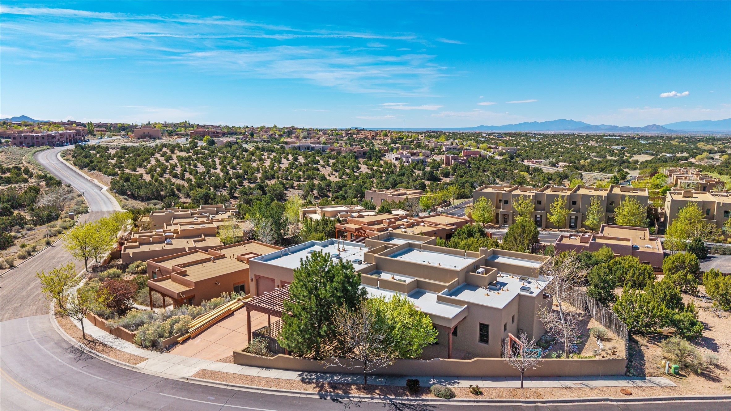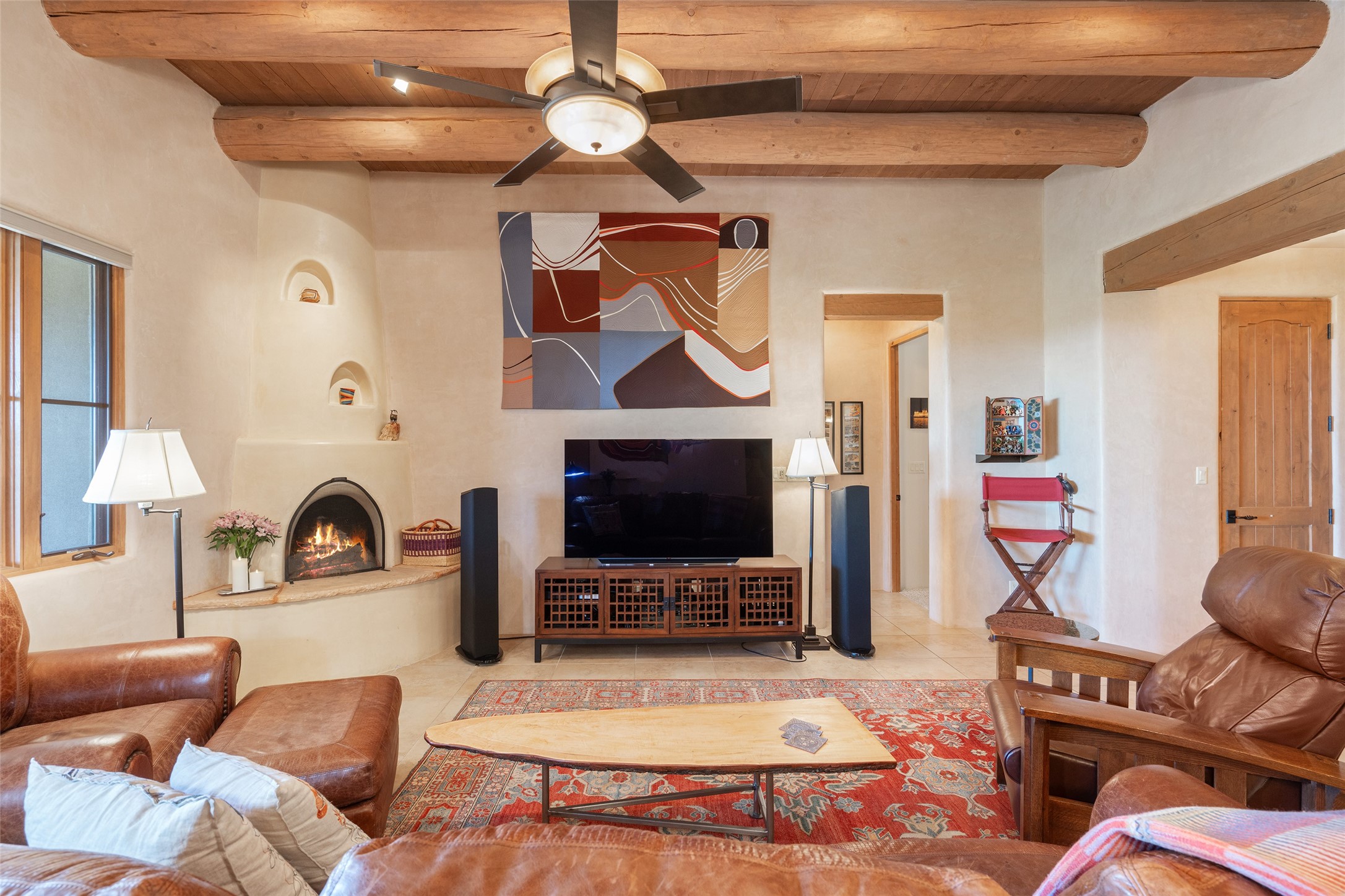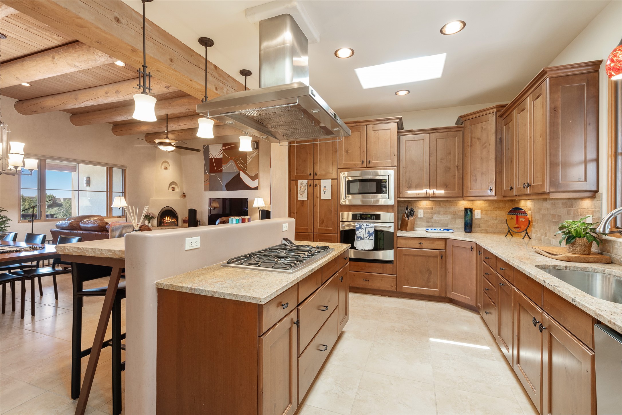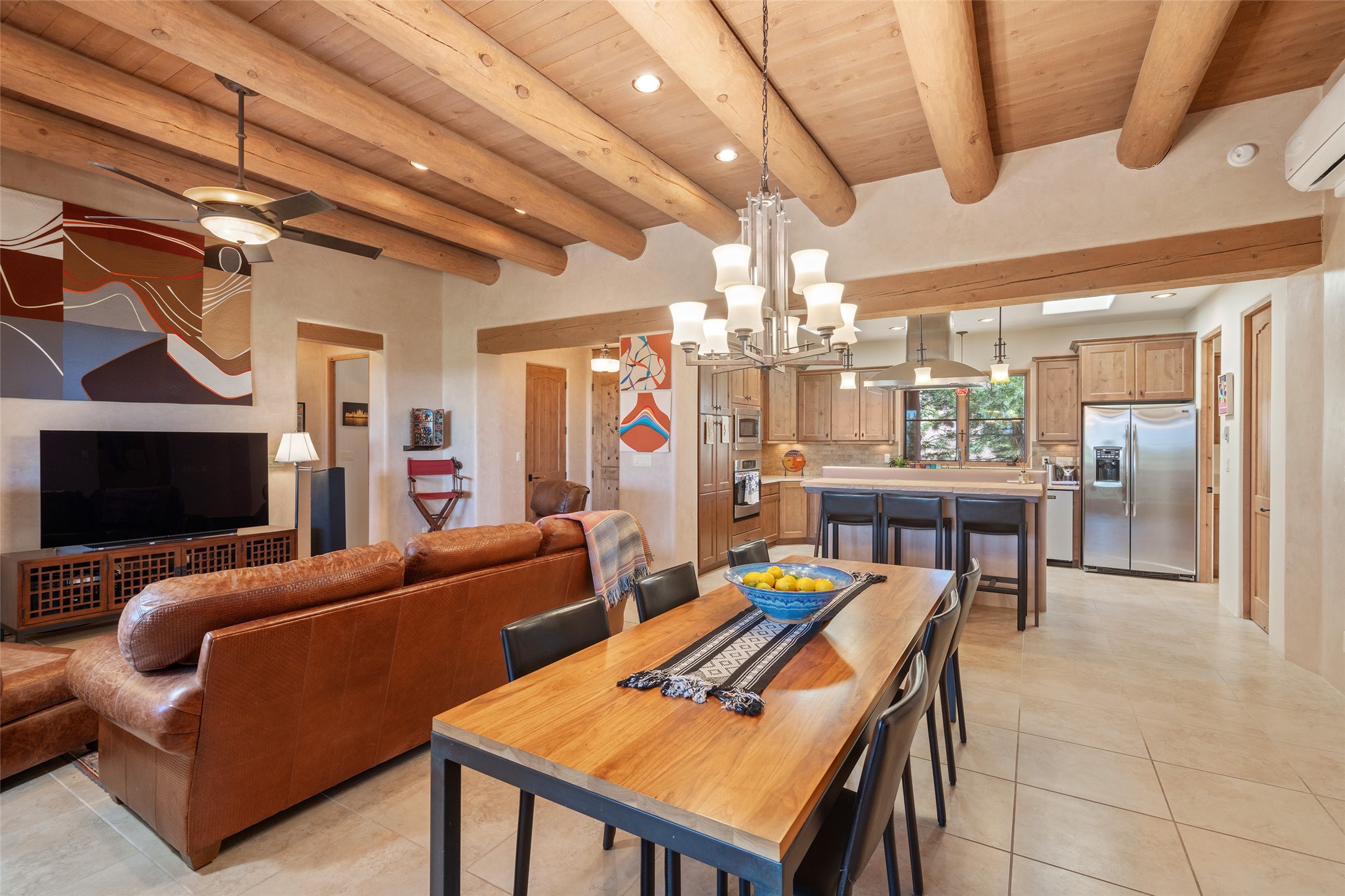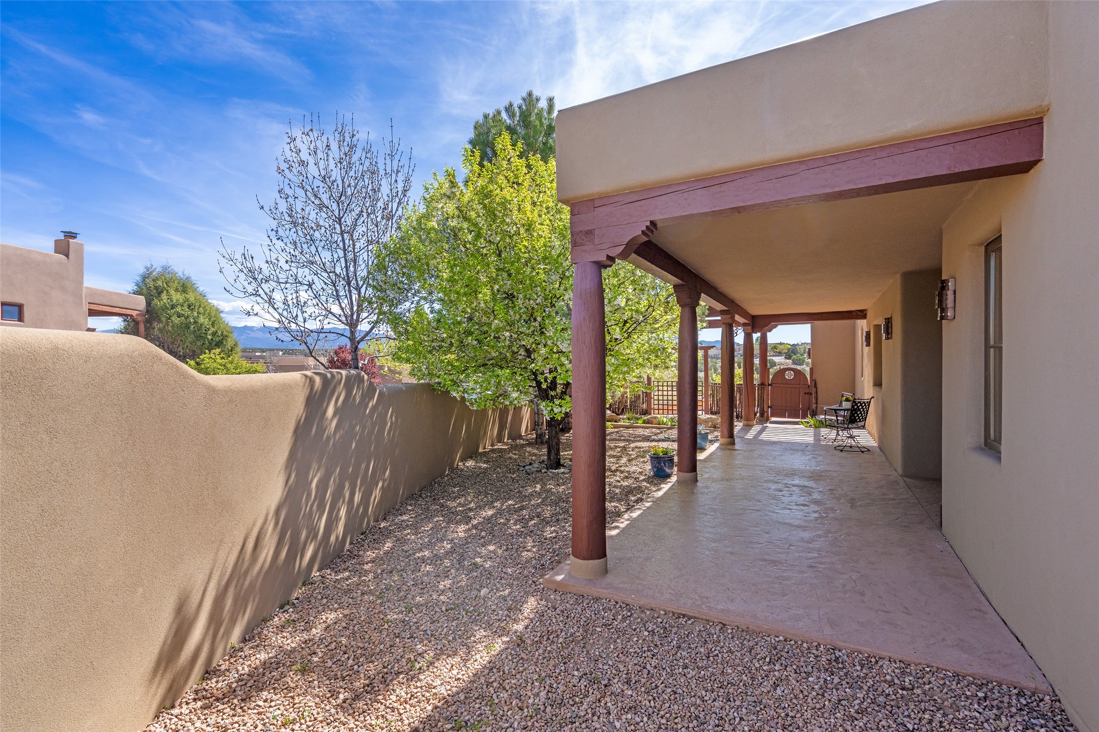Run, don't walk to experience this outstanding new offering in the sought-after Aldea de Santa Fe. Beautifully crafted in classic Pueblo style, this home captures the essence of Santa Fe living with warmth, character, and thoughtful design throughout. A welcoming foyer opens to a spacious great room filled with natural light, where plaster walls, a beautifully crafted kiva fireplace, wood-beamed ceilings, and tile floors create an inviting and timeless aesthetic. The open kitchen is both functional and charming, featuring abundant storage, granite countertops, a stone tile backsplash, and delightful views from the kitchen sink. Designed with comfort and privacy in mind, the split-bedroom floor plan offers a generous primary suite with direct access to the rear patio. The luxurious bath includes a soaking tub, separate shower, dual vanities, and a well-sized walk-in closet. On the opposite side of the home, two additional bedrooms provide flexibility for guests or work-from-home needs, including one ensuite. Outdoor living is equally appealing, with a charming front courtyard--perfect for morning coffee--and a stone patio ideal for enjoying sunset skies and surrounding views. An oversized garage offers ample space for storage or a workshop. Recent upgrades ensure peace of mind and year-round comfort, including a brand-new roof with a transferable warranty and four newly installed mini-splits for efficient heating and cooling. This mostly single-level home (with just one step in the garage) offers ease of living in one of Santa Fe's most desirable communities.