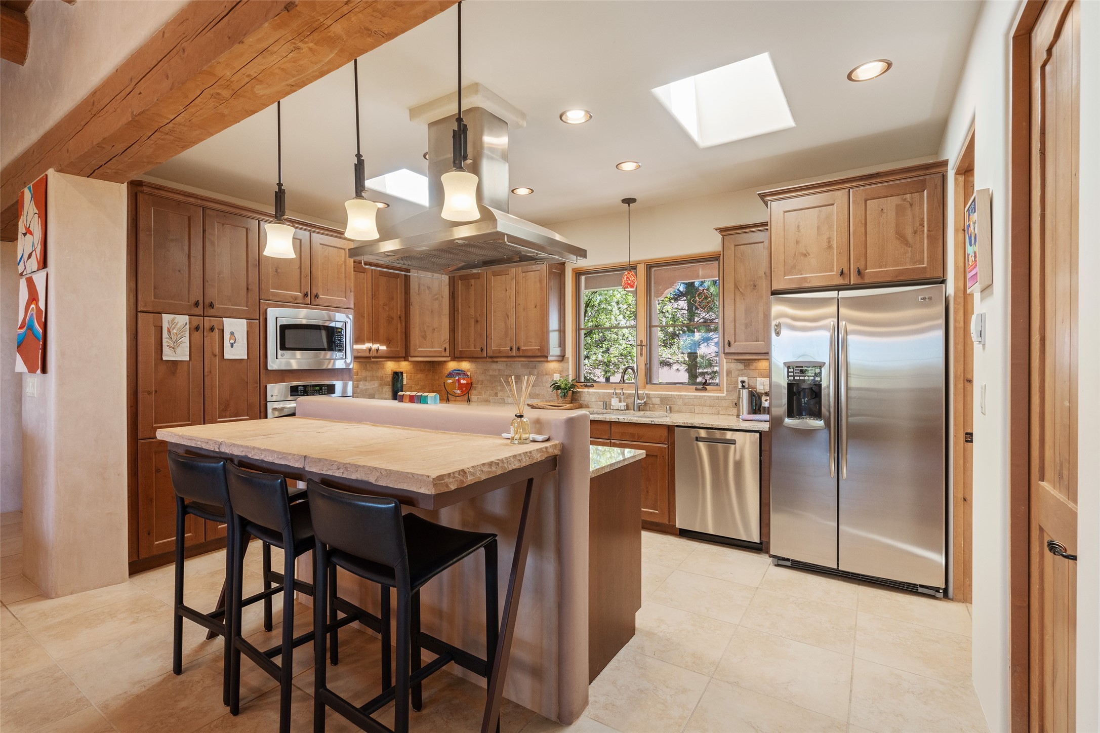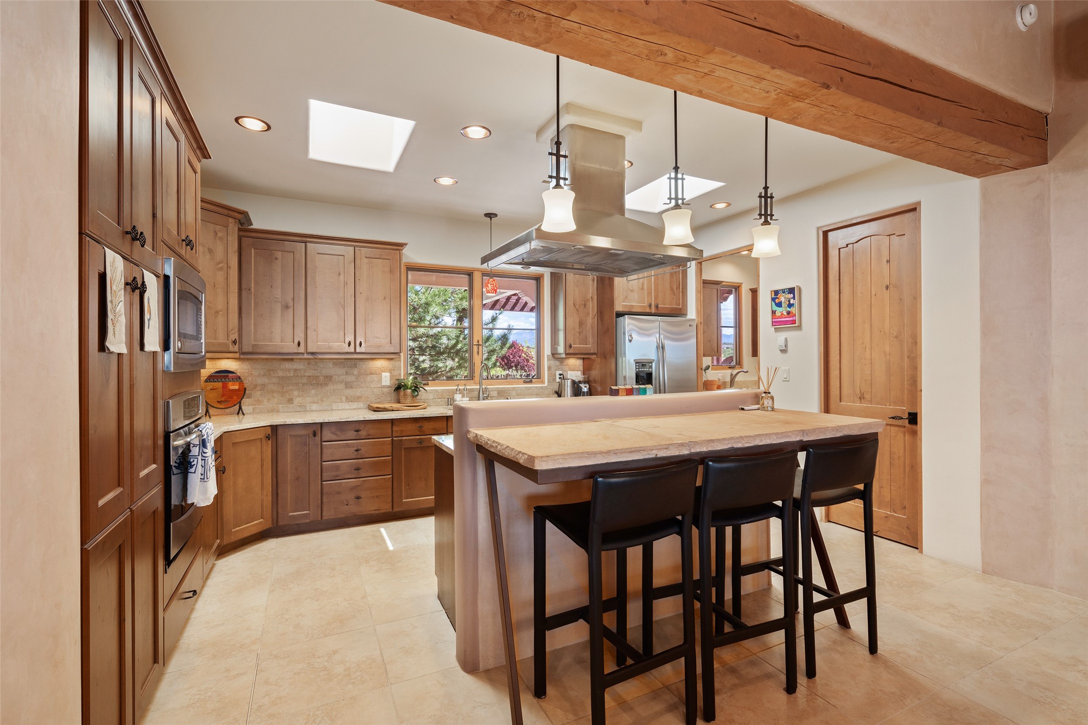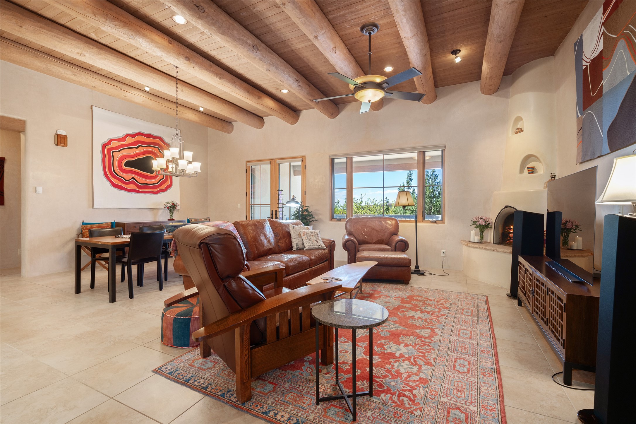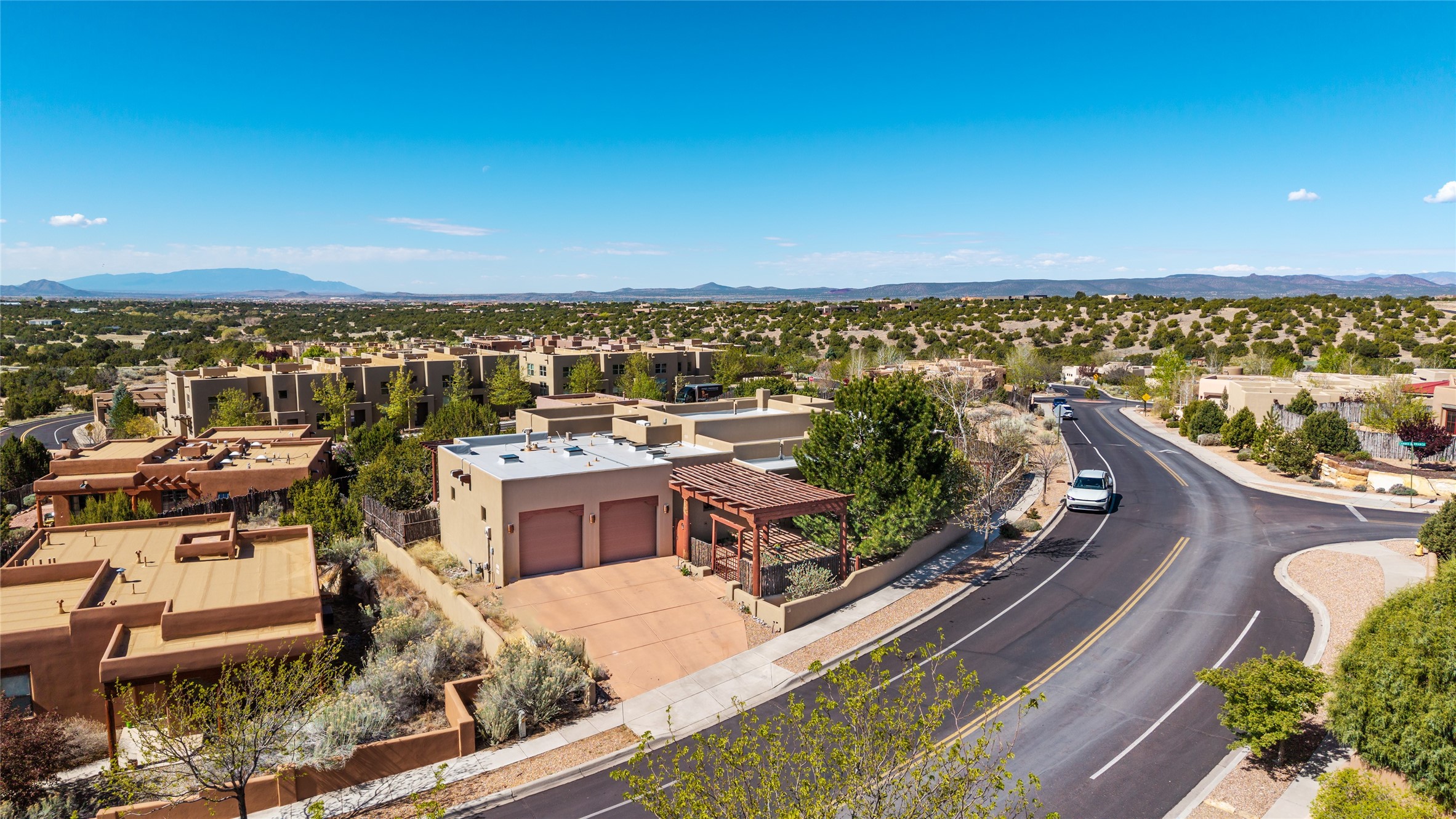 Run, don't walk to experience this outstanding new offering in the sought-after Aldea de Santa Fe. Beautifully crafted in classic Pueblo style, this home captures the essence of Santa Fe living with warmth, character, and thoughtful design throughout. A welcoming foyer opens to a spacious great room filled with natural light, where plaster walls, a beautifully crafted kiva fireplace, wood-beamed ceilings, and tile floors create an inviting and timeless aesthetic. The open kitchen is both functional and charming, featuring abundant storage, granite countertops, a stone tile backsplash, and delightful views from the kitchen sink. Designed with comfort and privacy in mind, the split-bedroom floor plan offers a generous primary suite with direct access to the rear patio. The luxurious bath includes a soaking tub, separate shower, dual vanities, and a well-sized walk-in closet. On the opposite side of the home, two additional bedrooms provide flexibility for guests or work-from-home needs, including one ensuite. Outdoor living is equally appealing, with a charming front courtyard--perfect for morning coffee--and a stone patio ideal for enjoying sunset skies and surrounding views. An oversized garage offers ample space for storage or a workshop. Recent upgrades ensure peace of mind and year-round comfort, including a brand-new roof with a transferable warranty and four newly installed mini-splits for efficient heating and cooling. This mostly single-level home (with just one step in the garage) offers ease of living in one of Santa Fe's most desirable communities.