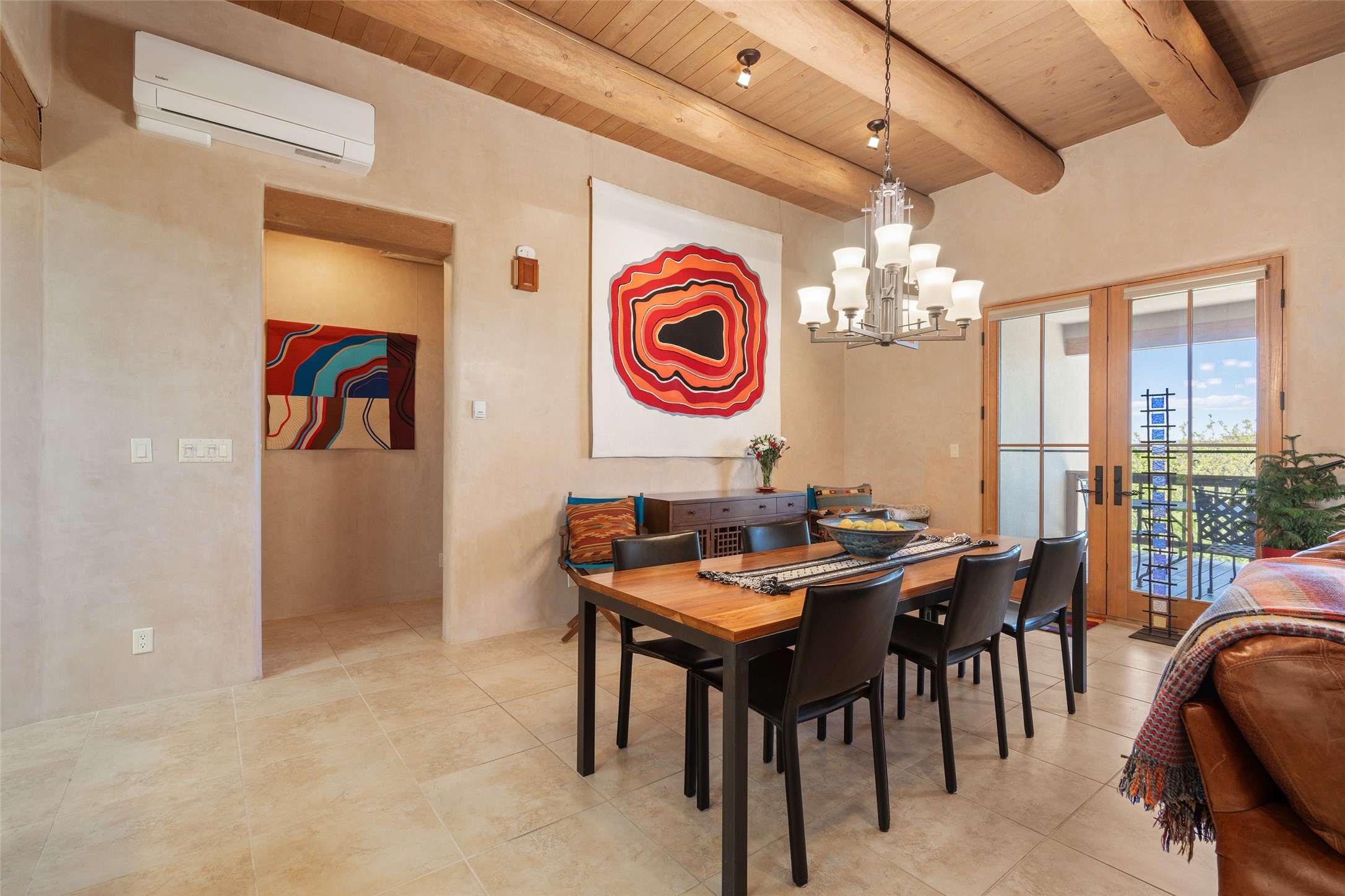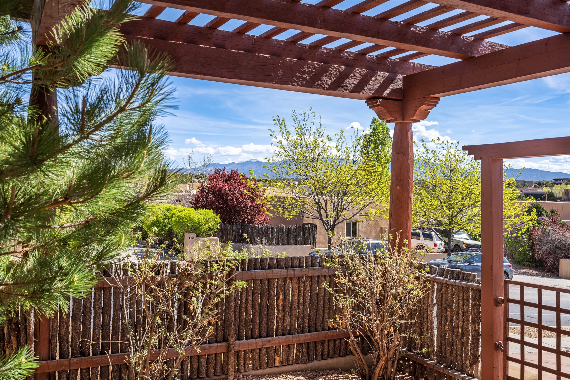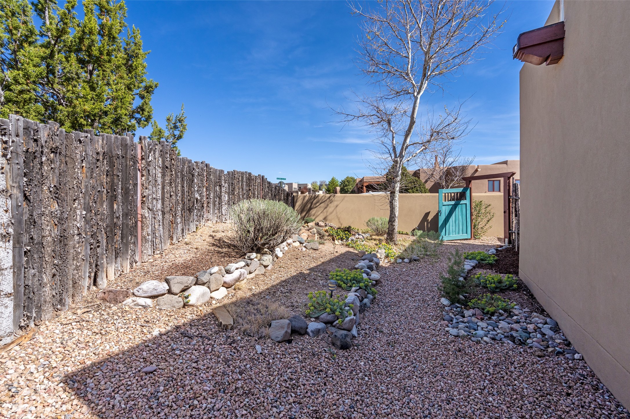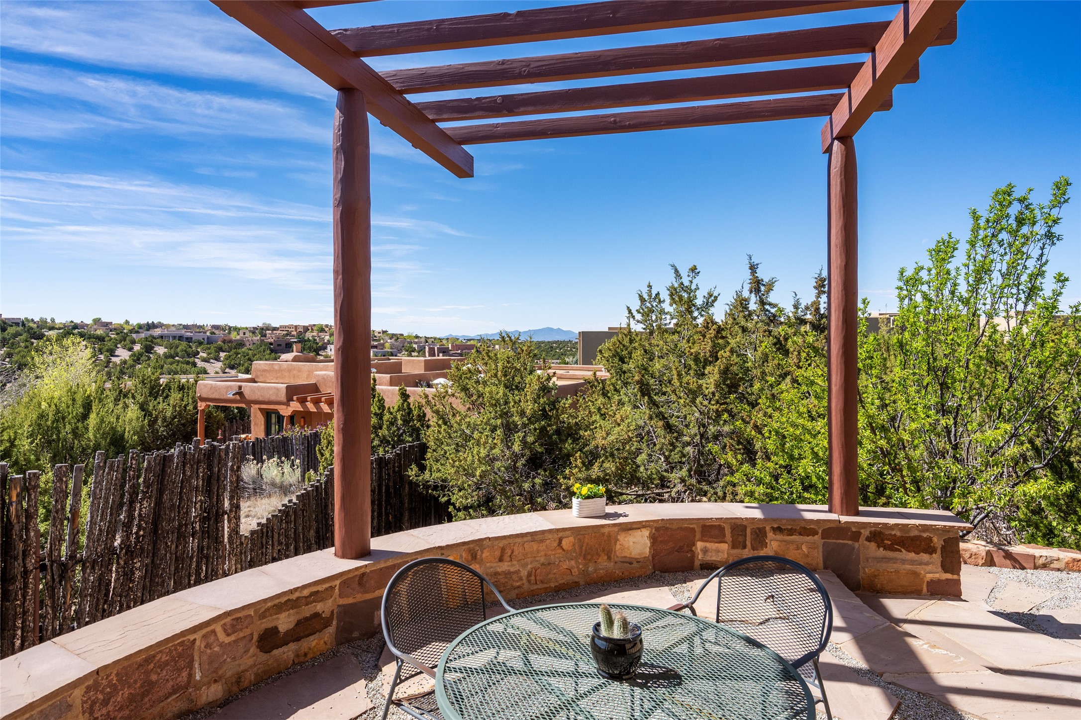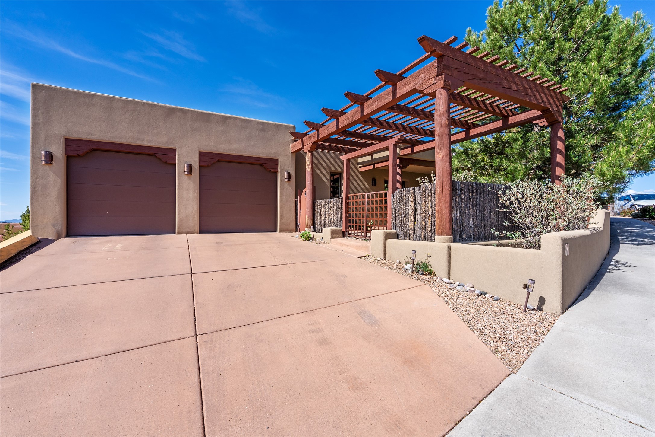 Run, don't walk to experience this outstanding new offering in the sought-after Aldea de Santa Fe. Beautifully crafted in classic Pueblo style, this home captures the essence of Santa Fe living with warmth, character, and thoughtful design throughout. A welcoming foyer opens to a spacious great room filled with natural light, where plaster walls, a beautifully crafted kiva fireplace, wood-beamed ceilings, and tile floors create an inviting and timeless aesthetic. The open kitchen is both functional and charming, featuring abundant storage, granite countertops, a stone tile backsplash, and delightful views from the kitchen sink. Designed with comfort and privacy in mind, the split-bedroom floor plan offers a generous primary suite with direct access to the rear patio. The luxurious bath includes a soaking tub, separate shower, dual vanities, and a well-sized walk-in closet. On the opposite side of the home, two additional bedrooms provide flexibility for guests or work-from-home needs, including one ensuite. Outdoor living is equally appealing, with a charming front courtyard--perfect for morning coffee--and a stone patio ideal for enjoying sunset skies and surrounding views. An oversized garage offers ample space for storage or a workshop. Recent upgrades ensure peace of mind and year-round comfort, including a brand-new roof with a transferable warranty and four newly installed mini-splits for efficient heating and cooling. This mostly single-level home (with just one step in the garage) offers ease of living in one of Santa Fe's most desirable communities.