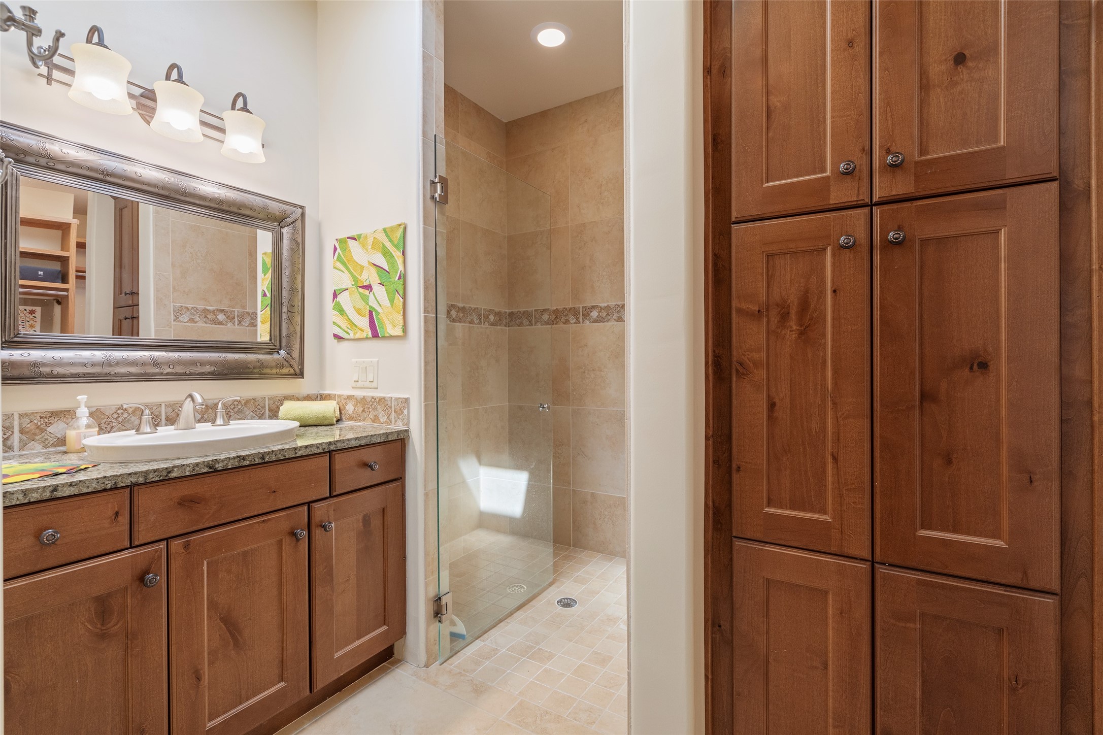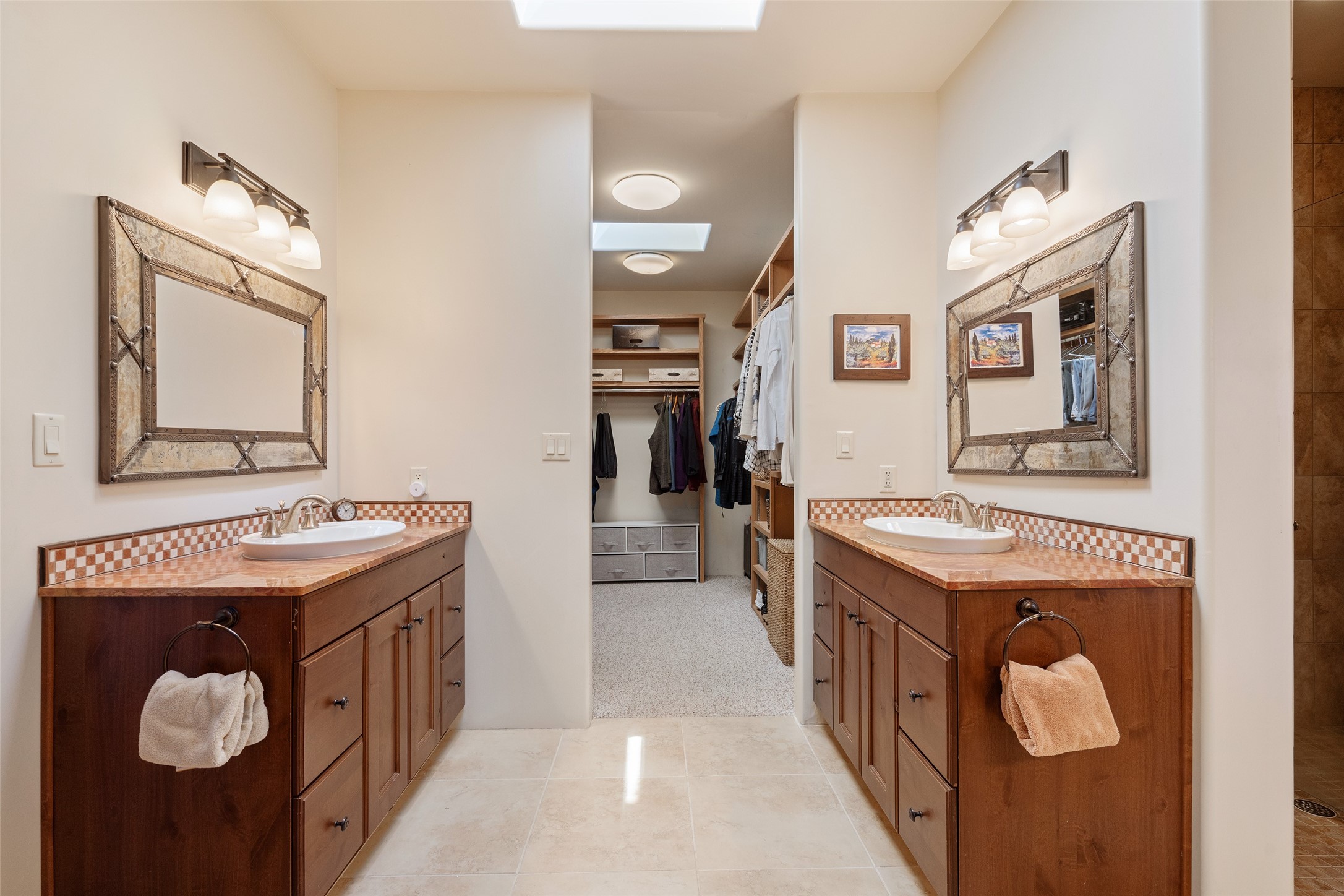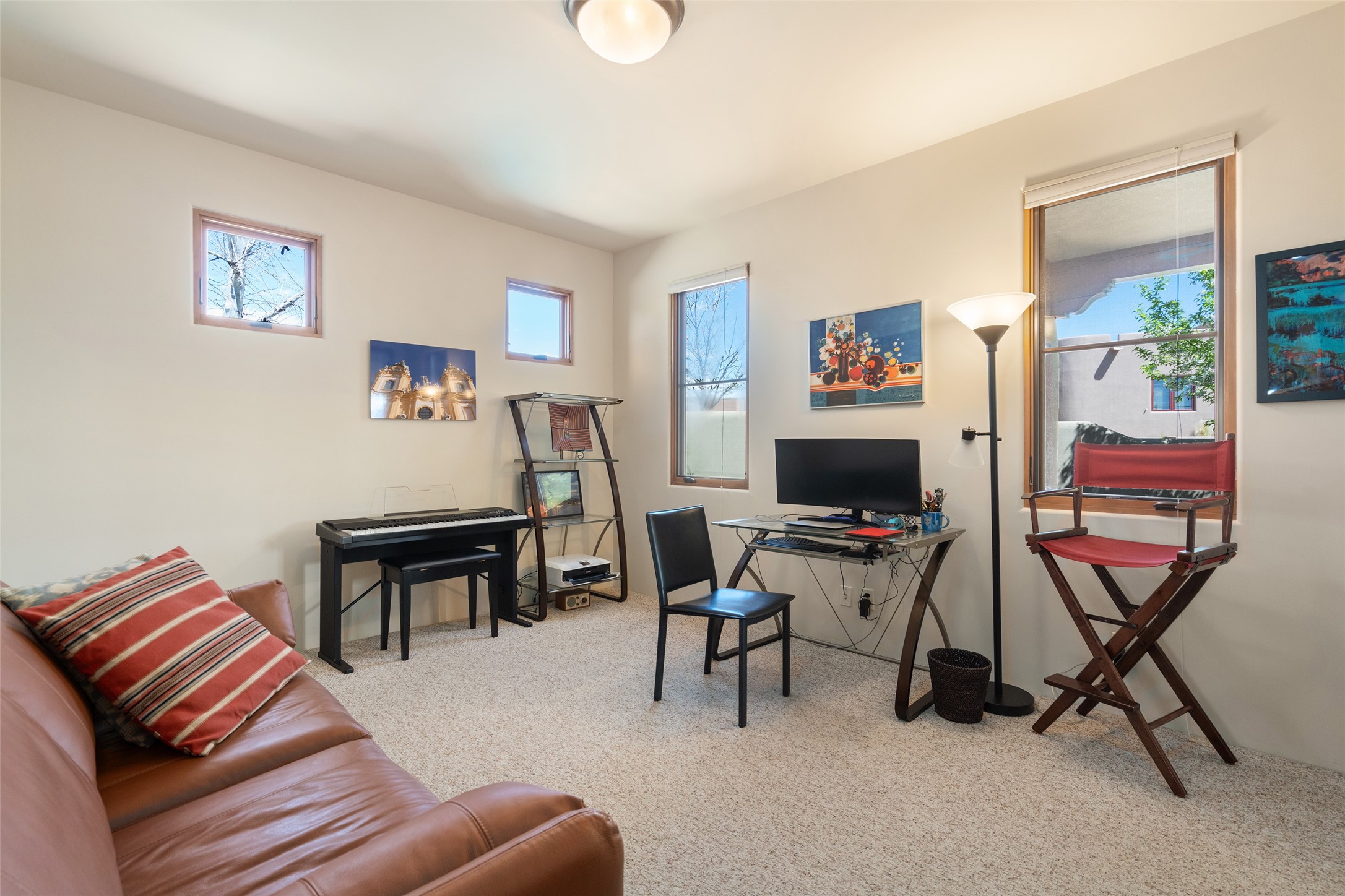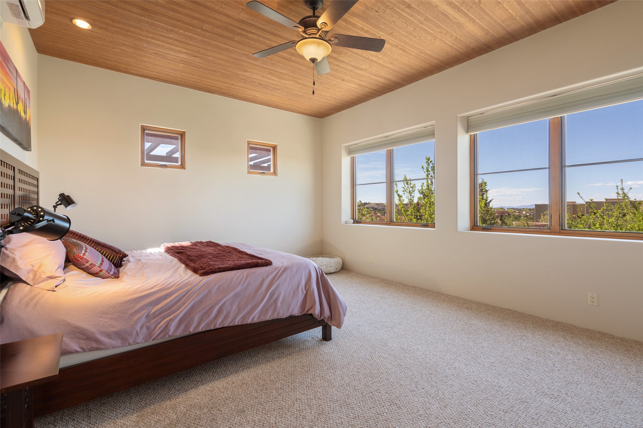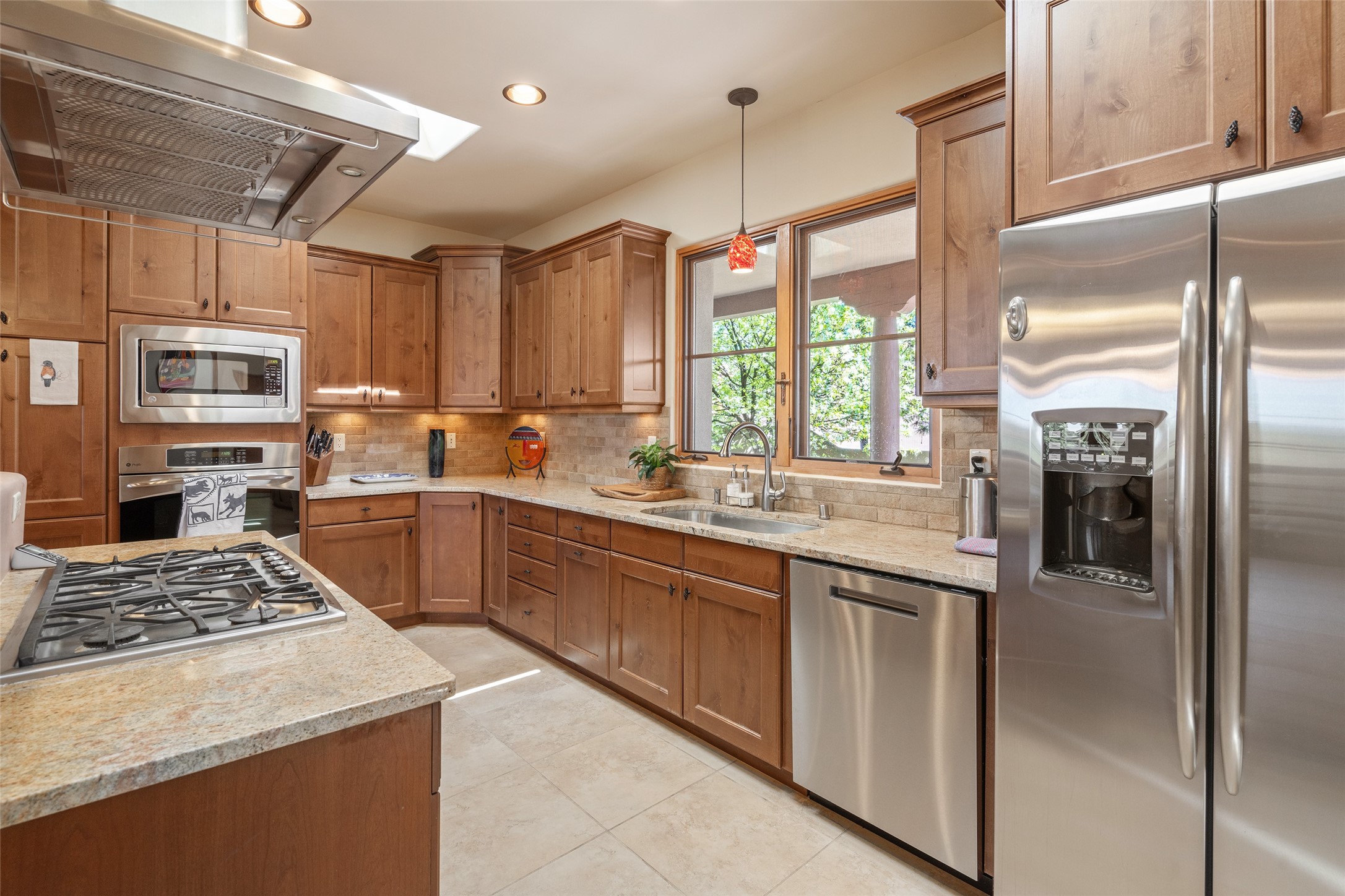 Run, don't walk to experience this outstanding new offering in the sought-after Aldea de Santa Fe. Beautifully crafted in classic Pueblo style, this home captures the essence of Santa Fe living with warmth, character, and thoughtful design throughout. A welcoming foyer opens to a spacious great room filled with natural light, where plaster walls, a beautifully crafted kiva fireplace, wood-beamed ceilings, and tile floors create an inviting and timeless aesthetic. The open kitchen is both functional and charming, featuring abundant storage, granite countertops, a stone tile backsplash, and delightful views from the kitchen sink. Designed with comfort and privacy in mind, the split-bedroom floor plan offers a generous primary suite with direct access to the rear patio. The luxurious bath includes a soaking tub, separate shower, dual vanities, and a well-sized walk-in closet. On the opposite side of the home, two additional bedrooms provide flexibility for guests or work-from-home needs, including one ensuite. Outdoor living is equally appealing, with a charming front courtyard--perfect for morning coffee--and a stone patio ideal for enjoying sunset skies and surrounding views. An oversized garage offers ample space for storage or a workshop. Recent upgrades ensure peace of mind and year-round comfort, including a brand-new roof with a transferable warranty and four newly installed mini-splits for efficient heating and cooling. This mostly single-level home (with just one step in the garage) offers ease of living in one of Santa Fe's most desirable communities.