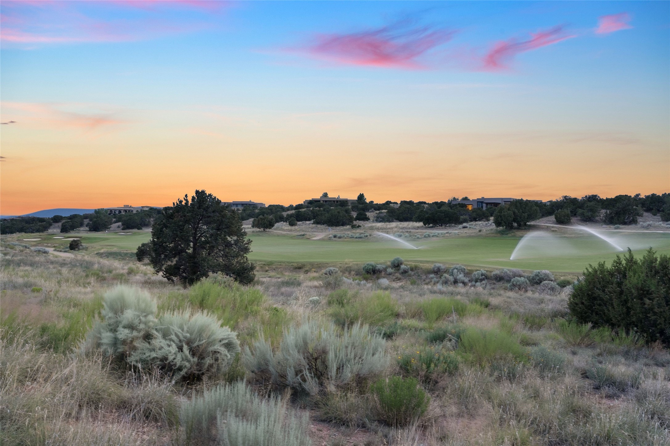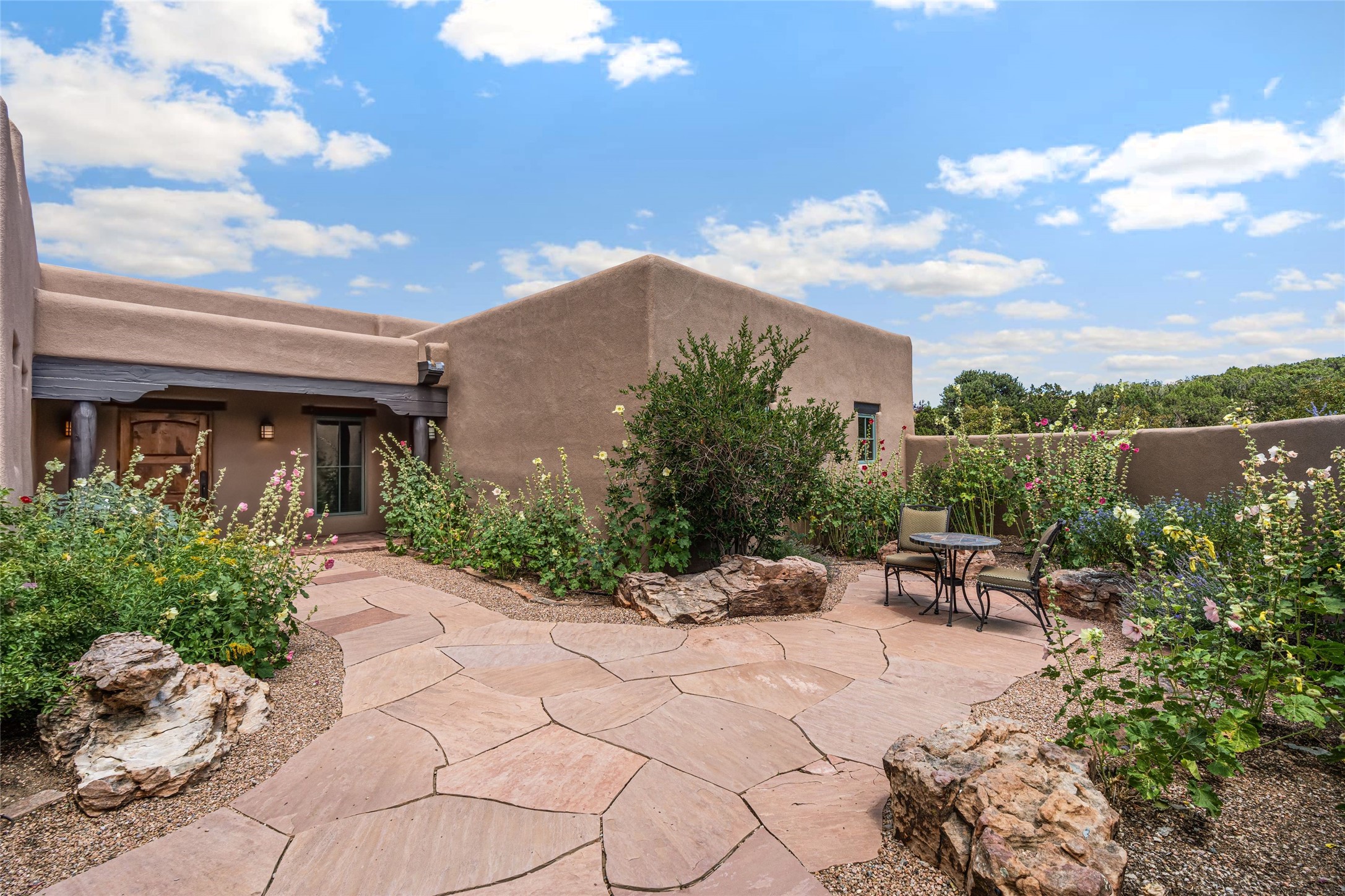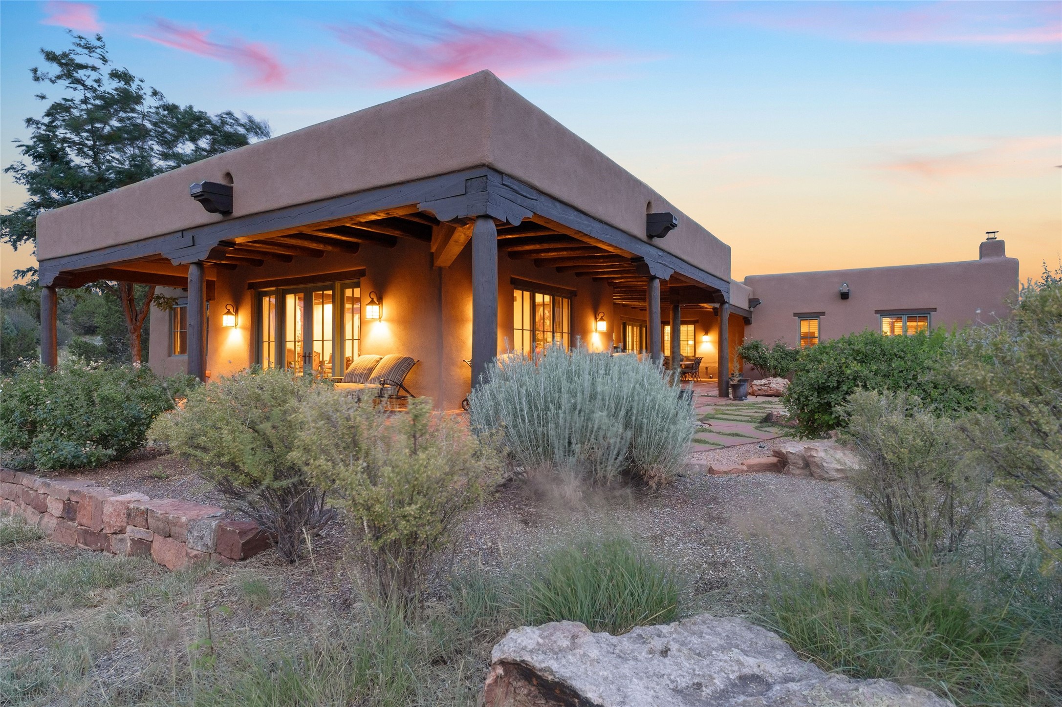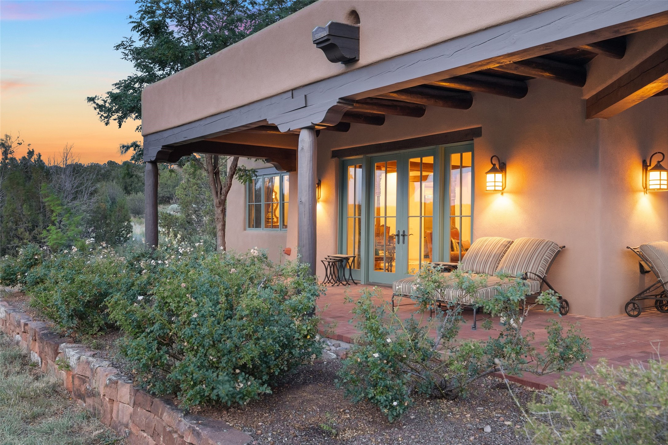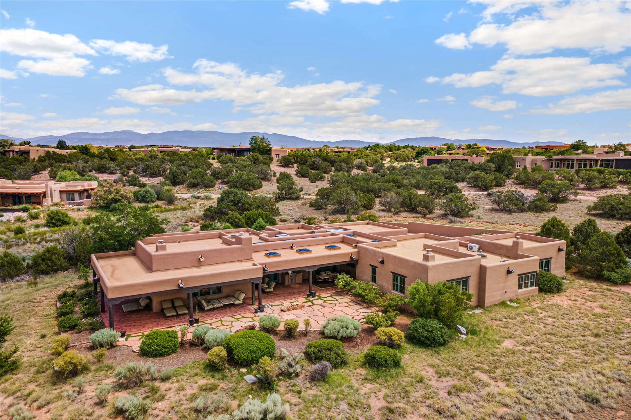 This home is the epitome of Refined Santa Fe Elegance, with 4 Bedrooms, 4.5 baths, 4 Fireplaces, No Steps and panoramic views of Sandia Mountain & the Fourth Fairway of the Sunset Golf Course, at the end of a cul-de-sac in Gated Las Campanas. An expansive hallway for artwork features 2 sets of French doors that open to the wrap-around portal for dining & relaxing which extends to the Living Room, also showcases the golf course view. The Gourmet Kitchen includes Viking appliances, an over-size island with prep sink, menu-planning desk & Butler's Pantry with wine cooler. The Main Bedroom suite offers a luxurious Spa Bath with large shower & whirlpool tub plus a walk-in closet worthy of a designer retail store. Bedroom Two is sequestered from the Main and has an en-suite bath. Bedroom Three with en-suite bath is adjacent to the Main and currently used as an office. Bedroom Four offers total privacy, as an attached Casita with en-suite bath & mini-kitchenette. The expansive brick Portal off the gallery hall includes a built-in BBQ & impressive fireplace, providing the perfect venue for entertaining, dining, relaxing or savoring the panoramic golf course & Sandia Mountain views. The Two-car Garage has eliminated garage clutter, with 29 feet of handsome cabinets plus a power wall to store bicycles, skis & other outdoor equipment. Come see why this 4-Bedroom home with Golf & Mountain views is the perfect embodiment of elegant Santa Fe resort living.