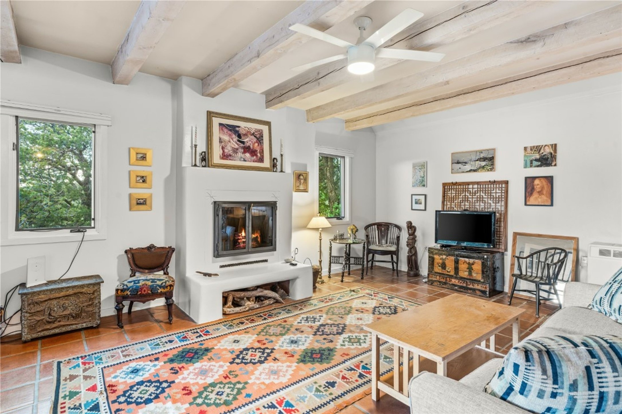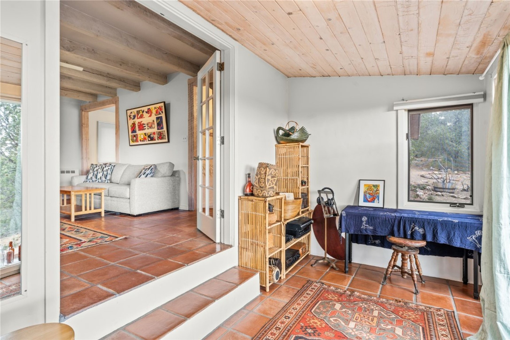Nestled among the quiet hills of Caada de los Alamos, this tranquil 1-bedroom, 1-bathroom retreat sits atop 5 private acres overlooking a sweeping green valley of ponderosa pines and juniper, with Cerros Negros rising softly in the distance. Positioned to take in both light and long views, the 1,138-square-foot home opens with a charming living room centered around a cozy wood-burning fireplace -- the heart of the space. Step down into the sun-drenched bonus room, an inviting space perfect for morning coffee, an afternoon read, or a peaceful work-from-home hideaway. Thoughtful storage is found throughout, including a usable attic extending the full length of the home, and a standalone shed. The pitched roof features a solar hot water panel that helps support energy-efficient water heating. Outside, the property is defined by quiet and natural beauty -- the soft wind moving through the forest, wildlife passing by, and clear night skies stretching overhead. Though wonderfully secluded, the home sits just about 25 minutes from the Plaza, offering a rare balance of mountain-retreat living with convenient access to Santa Fe's amenities and nearby National Forest trails. A calming high-desert getaway with space, privacy, and possibility--ready for its next owner to make it their own.